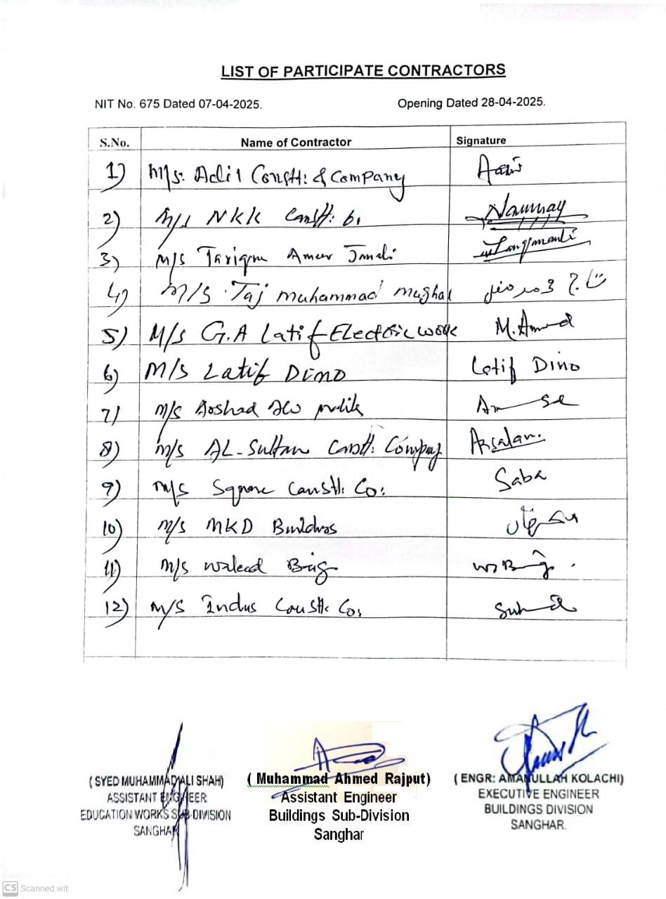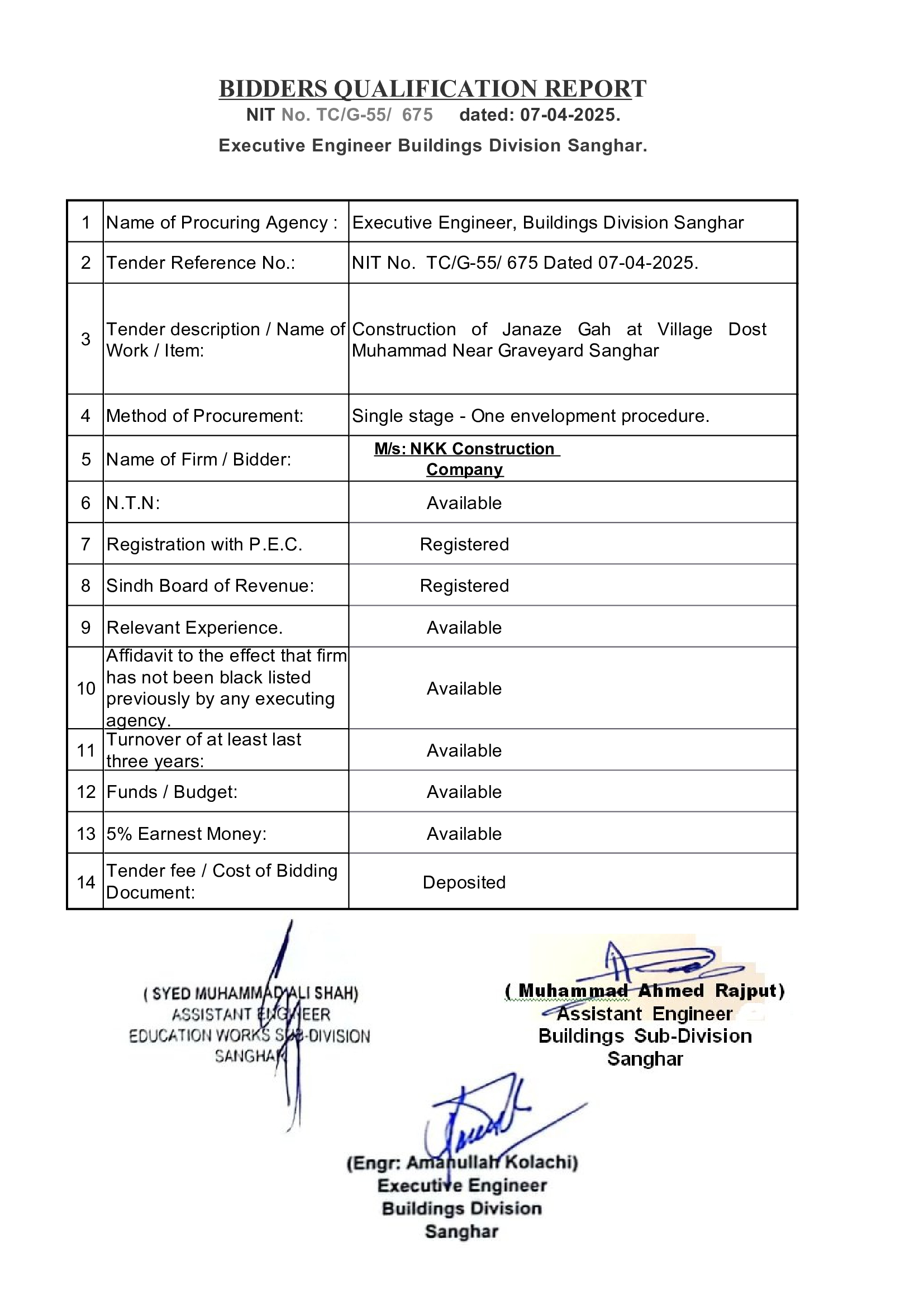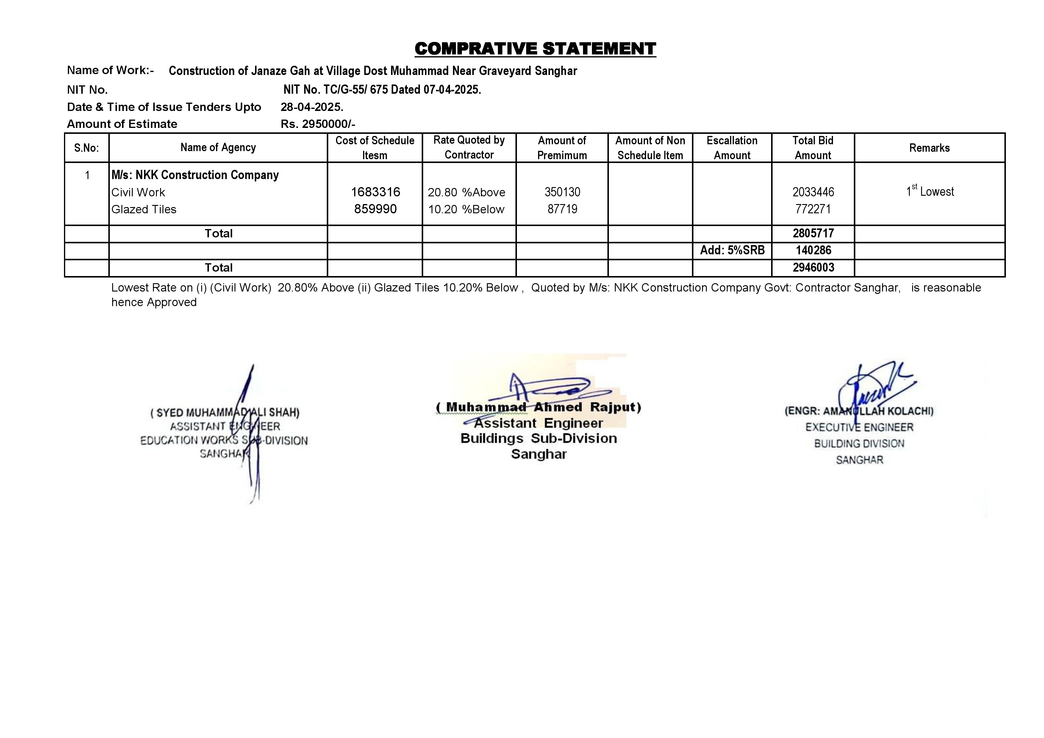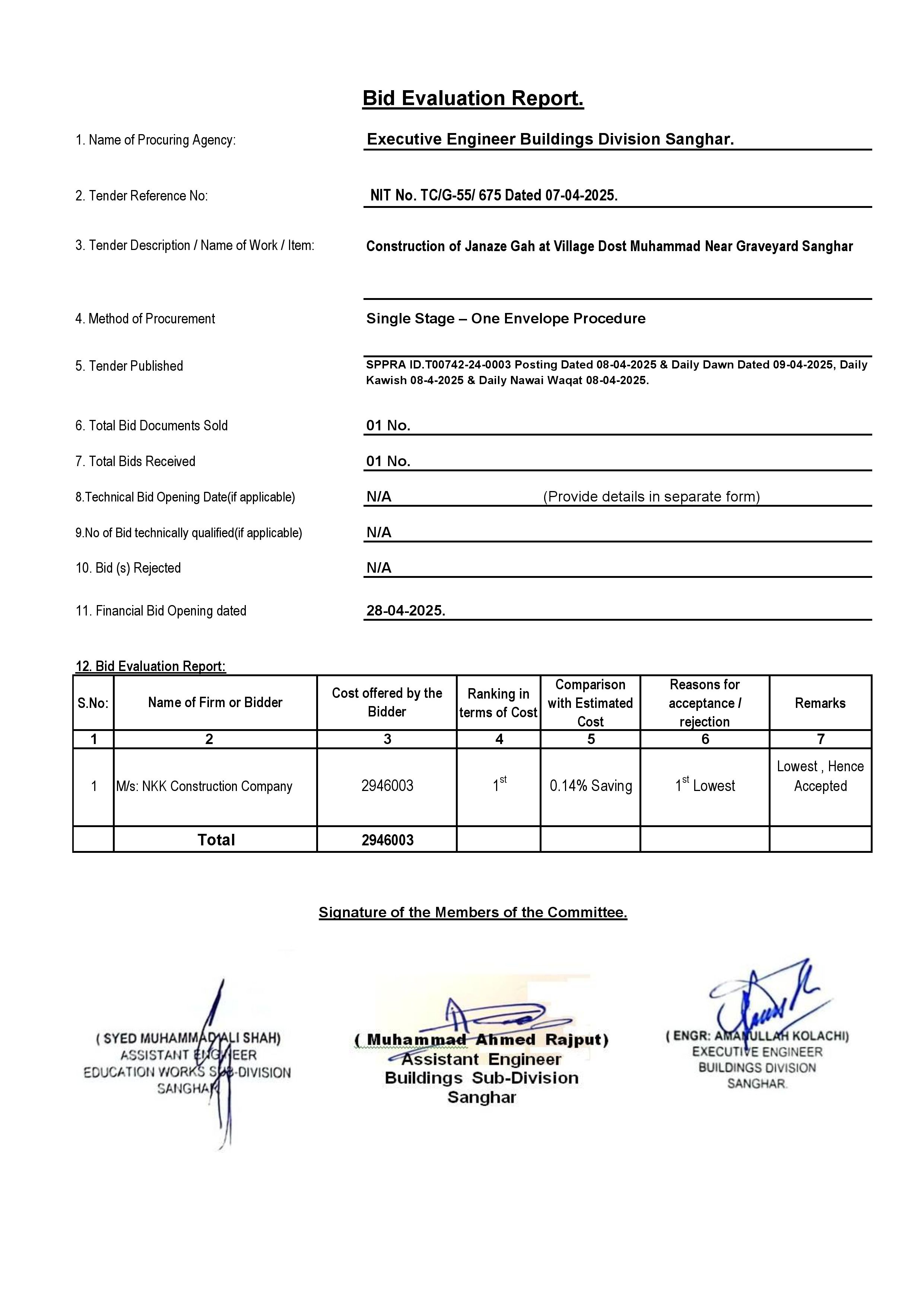| T00742-24-0003 | BE00742-24-0003-10 | 10 Construction of Janaze Gah at Village Dost Muhammad Near Graveyard Sanghar | XEN Building Division Sanghar (51-Works and Services Department) | 02-05-2025 | Sanghar | Active |