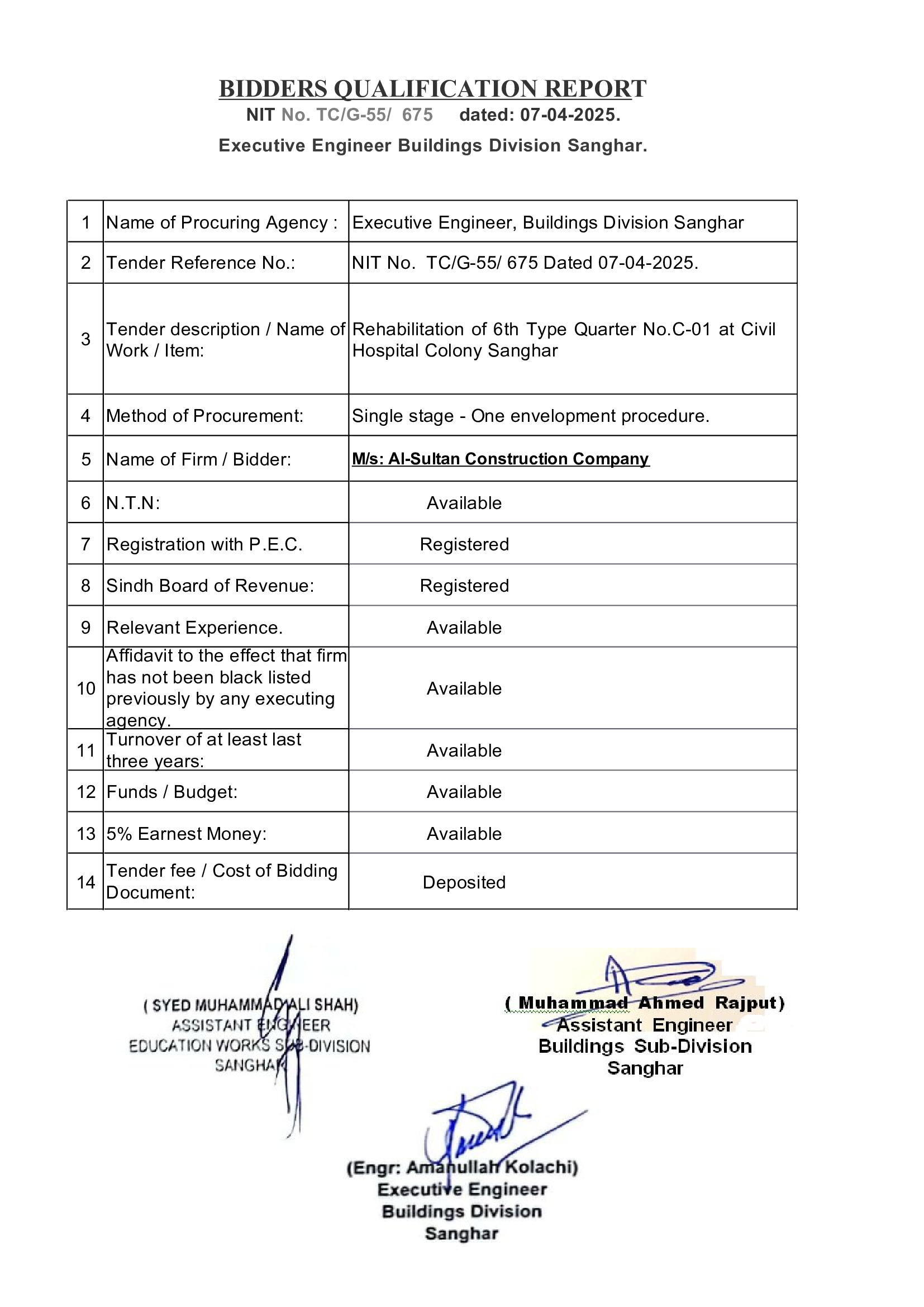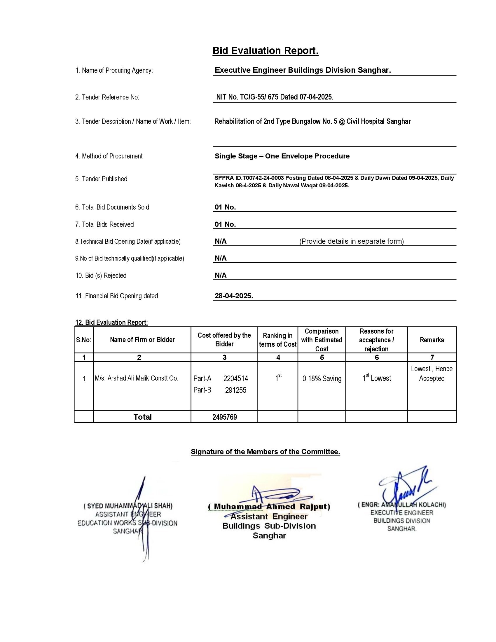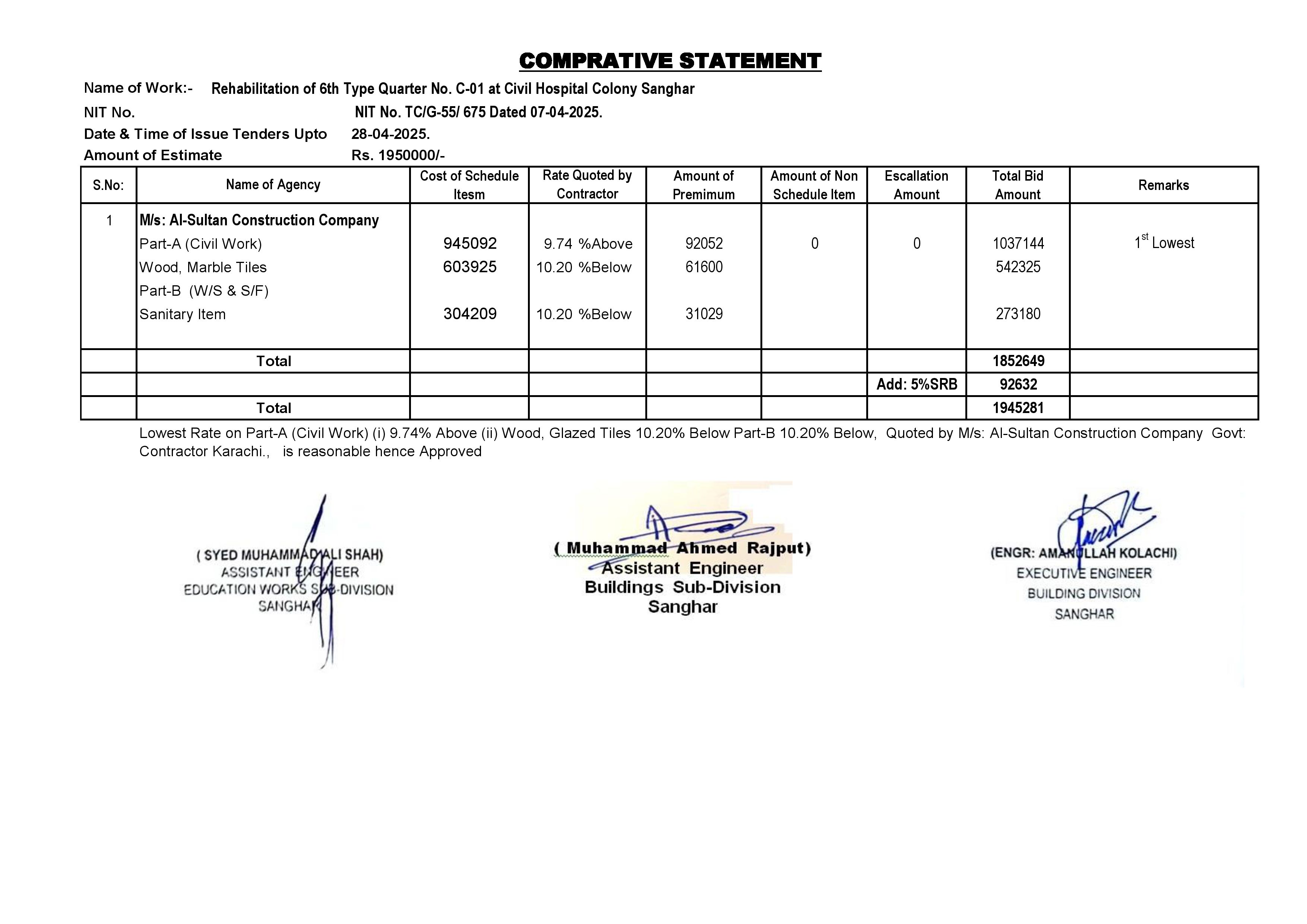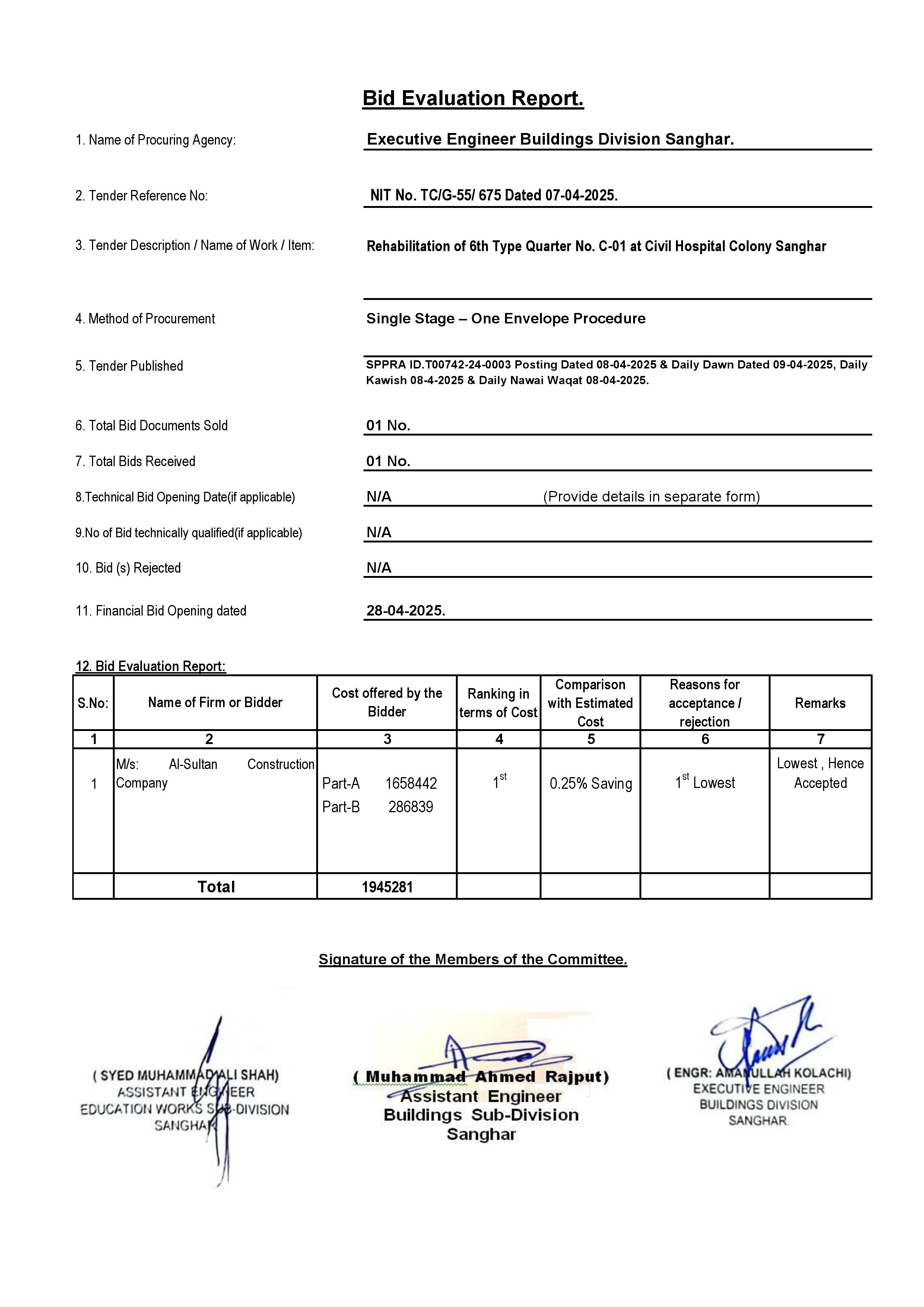 | T00742-24-0003 | BE00742-24-0003-12 | 12 Rehabilitation of 6th Type Quarter No. C-01 at Civil Hospital Colony Sanghar | XEN Building Division Sanghar (51-Works and Services Department) | 02-05-2025 | Sanghar | Active |