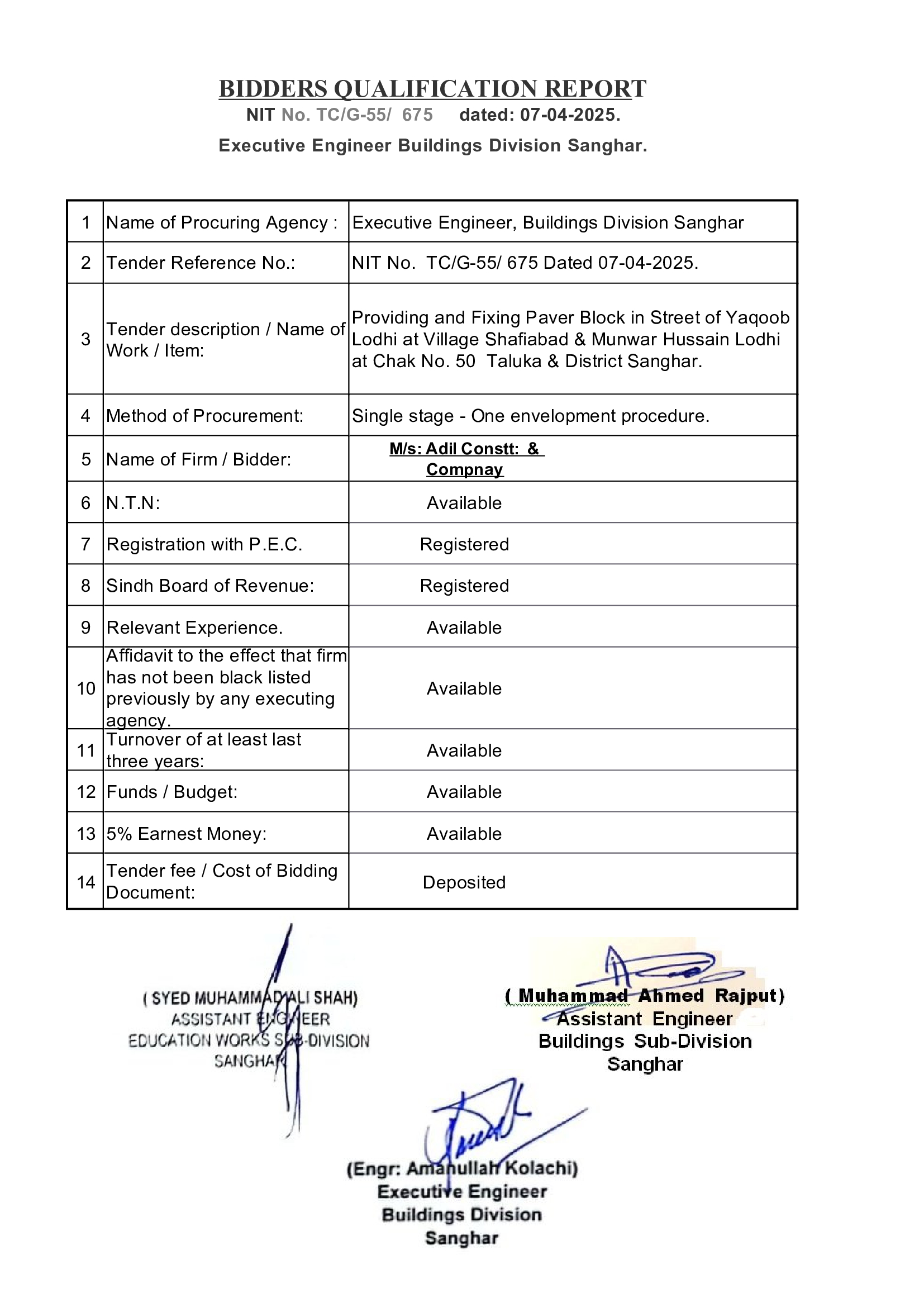 | T00742-24-0003 | BE00742-24-0003-6 | 6 Providing and Fixing Paver Block From Adnan House to Abdul Hameed House at Gujri Taluka & District Sanghar | XEN Building Division Sanghar (51-Works and Services Department) | 02-05-2025 | Sanghar | Active |