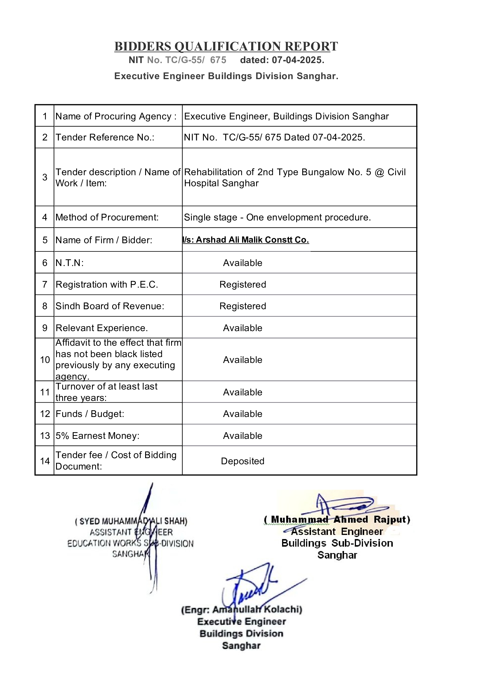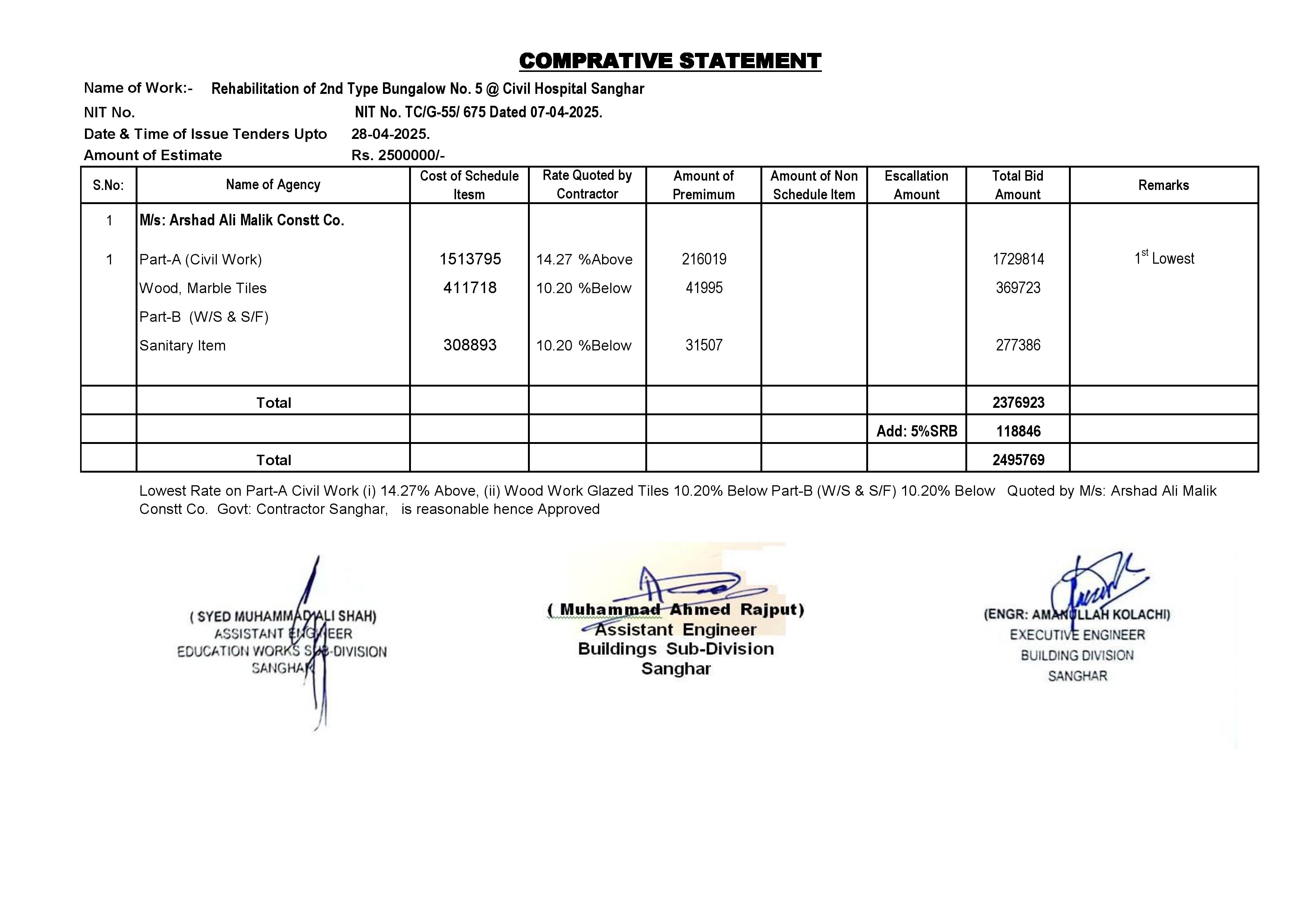 | T00742-24-0003 | BE00742-24-0003-11 | 11 Rehabilitation of 2nd Type Bungalow No. 5 @ Civil Hospital Sanghar | XEN Building Division Sanghar (51-Works and Services Department) | 02-05-2025 | Sanghar | Active |