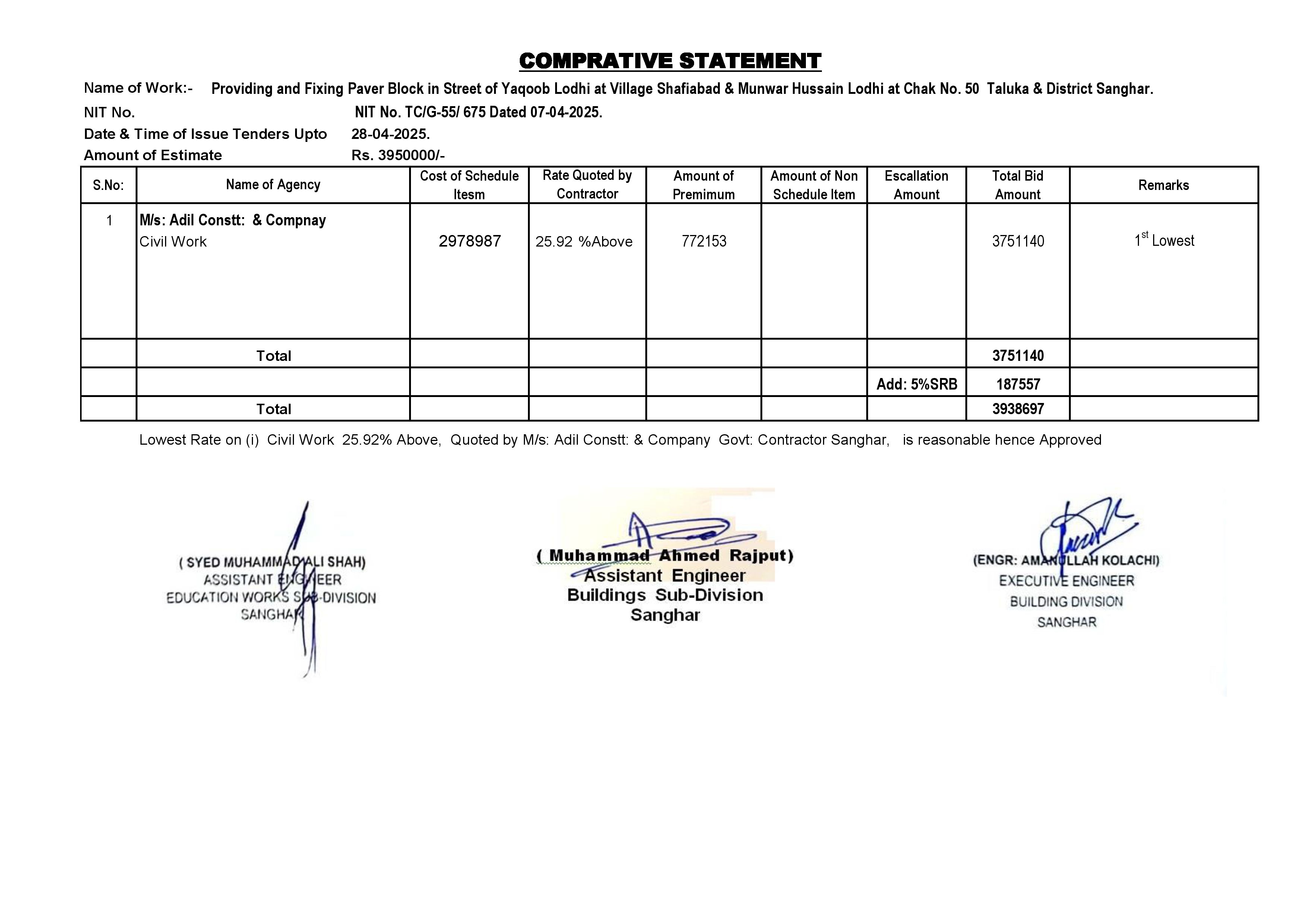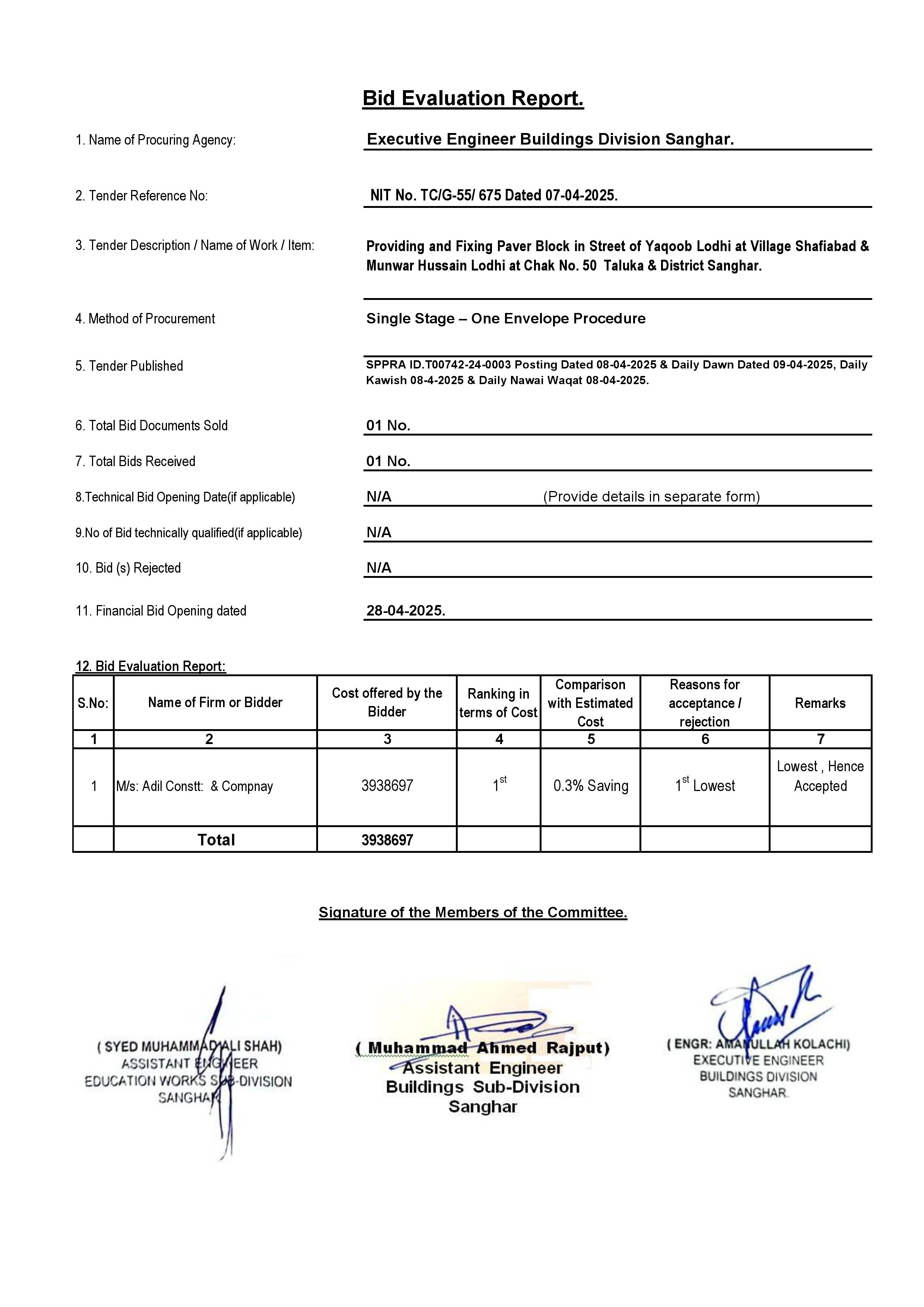 | T00742-24-0003 | BE00742-24-0003-9 | 9 Providing and Fixing Paver Block in Street of Yaqoob Lodhi at Village Shafiabad & Munwar Hussain Lodhi at Chak No. 50 Taluka & District Sanghar. | XEN Building Division Sanghar (51-Works and Services Department) | 02-05-2025 | Sanghar | Active |