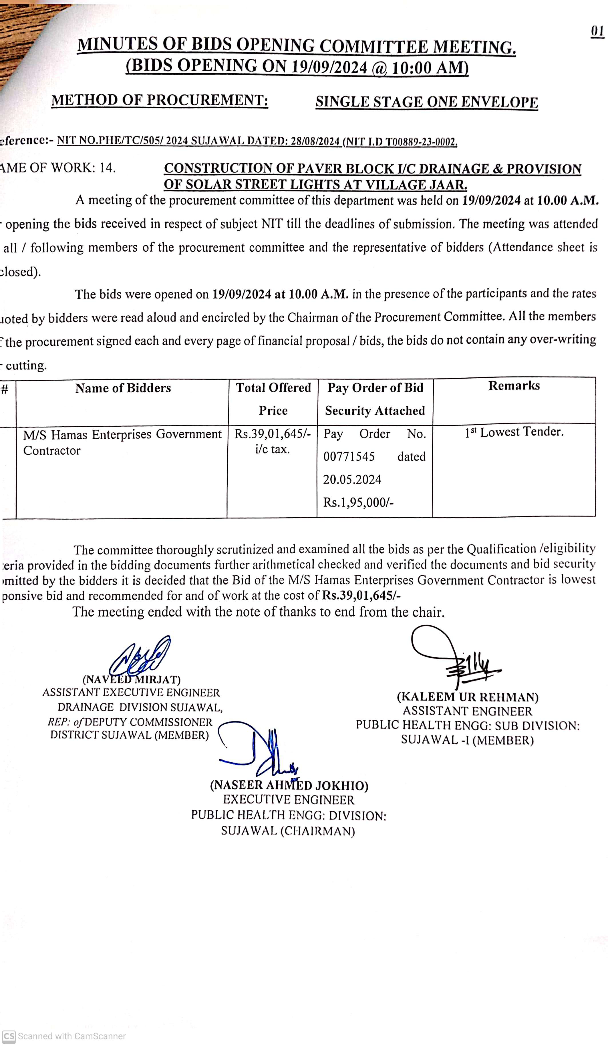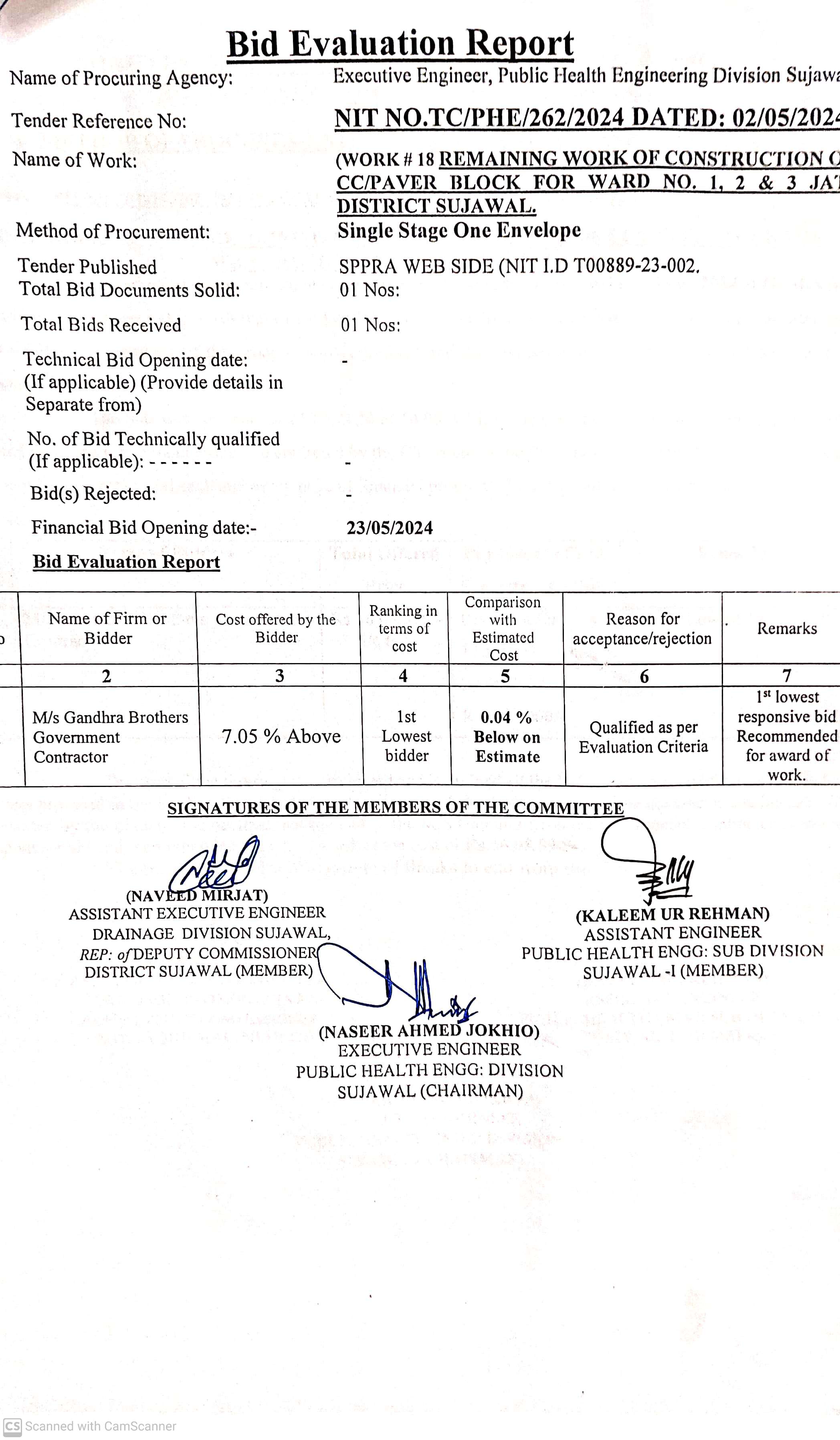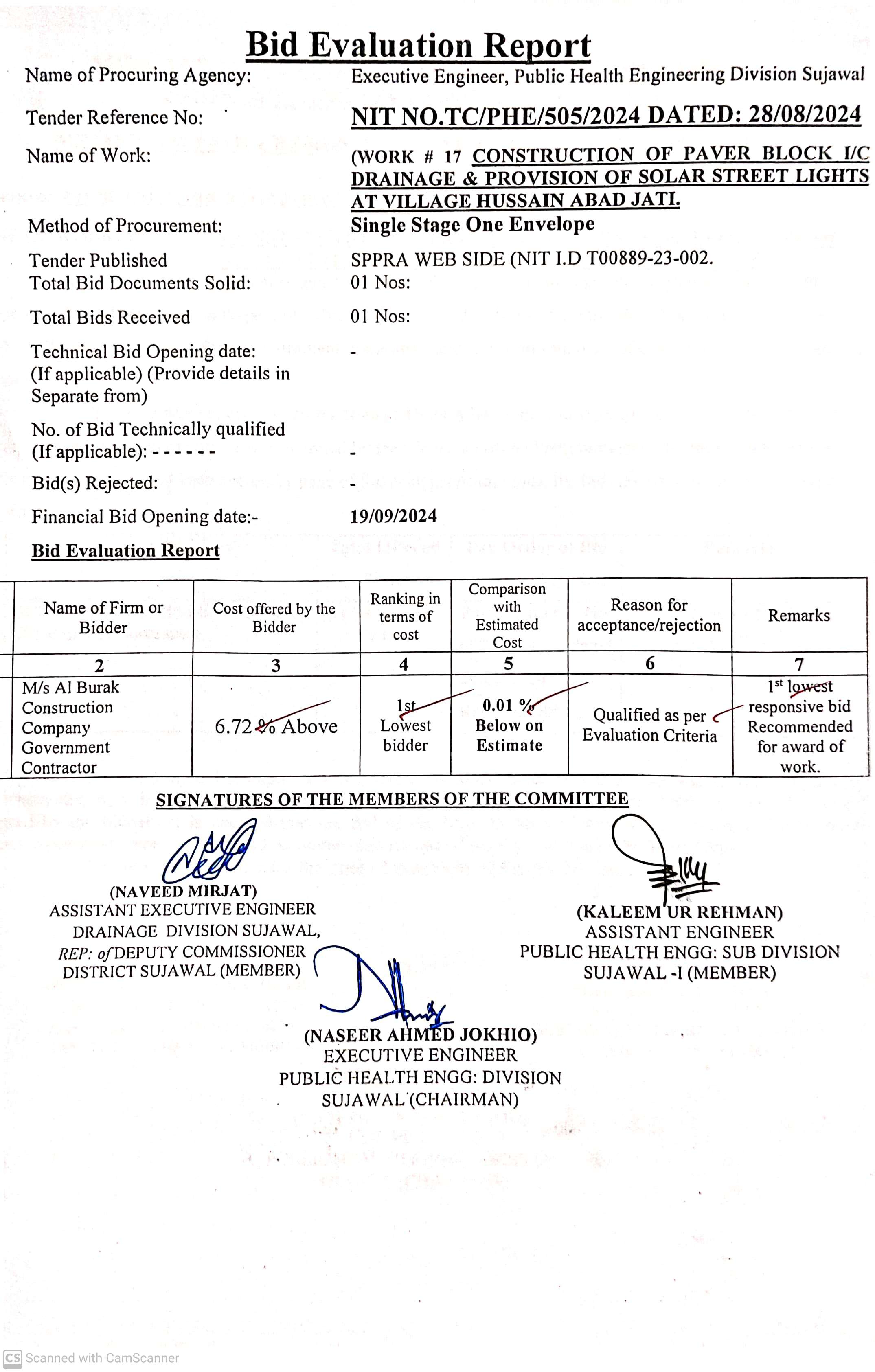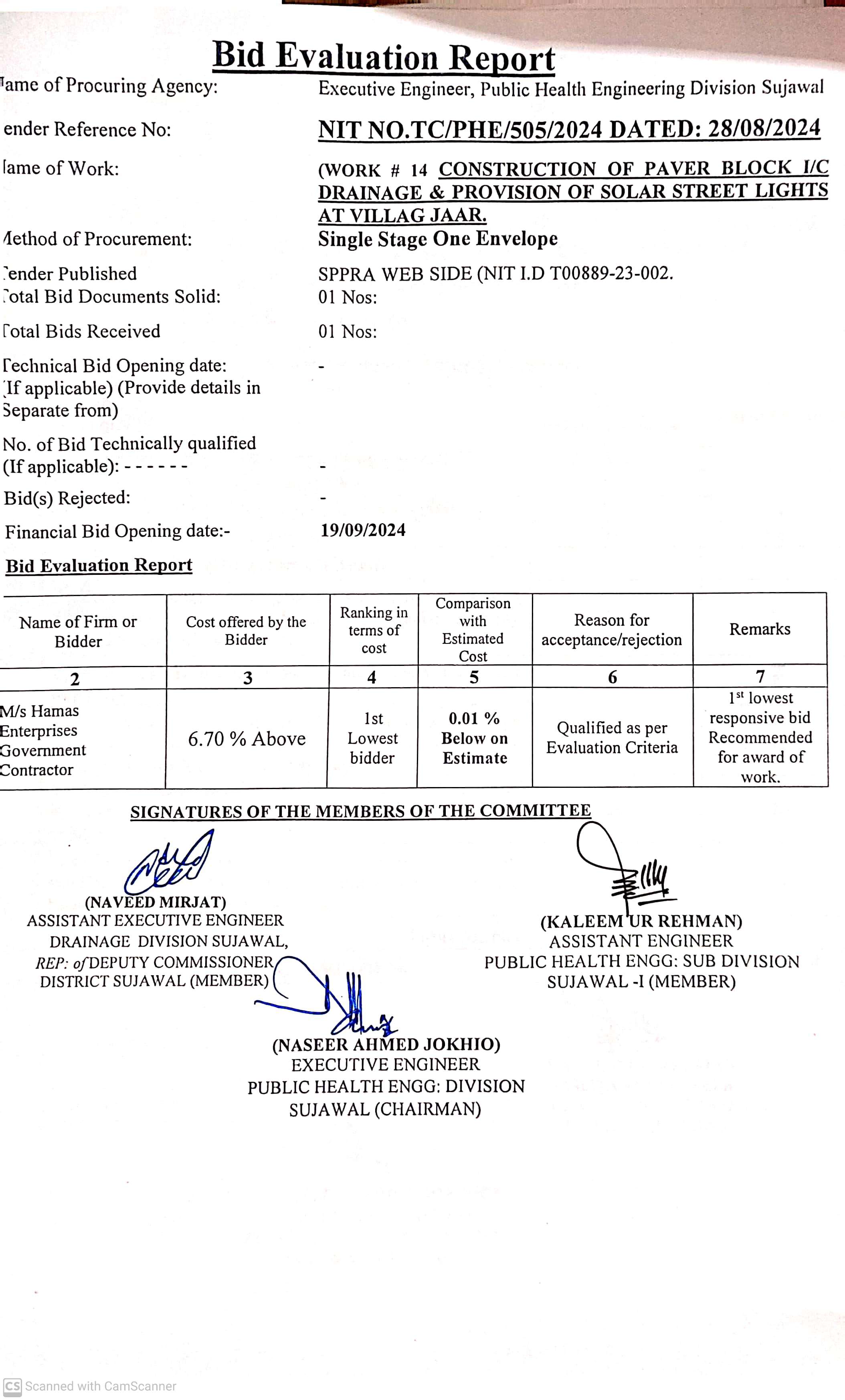 | T00889-23-0002 | BE00889-23-0002-14 | 14. CONSTRUCTION OF PAVING BLOCK & PROVISION OF SOLAR LIGHTS AT VILLAGE JARR TALUKA SUJAWAL | Executive Engineer Public Health Engineering Division Sujawal (34-Public health Engineering Department) | 20-09-2024 | Sujawal | Active |
