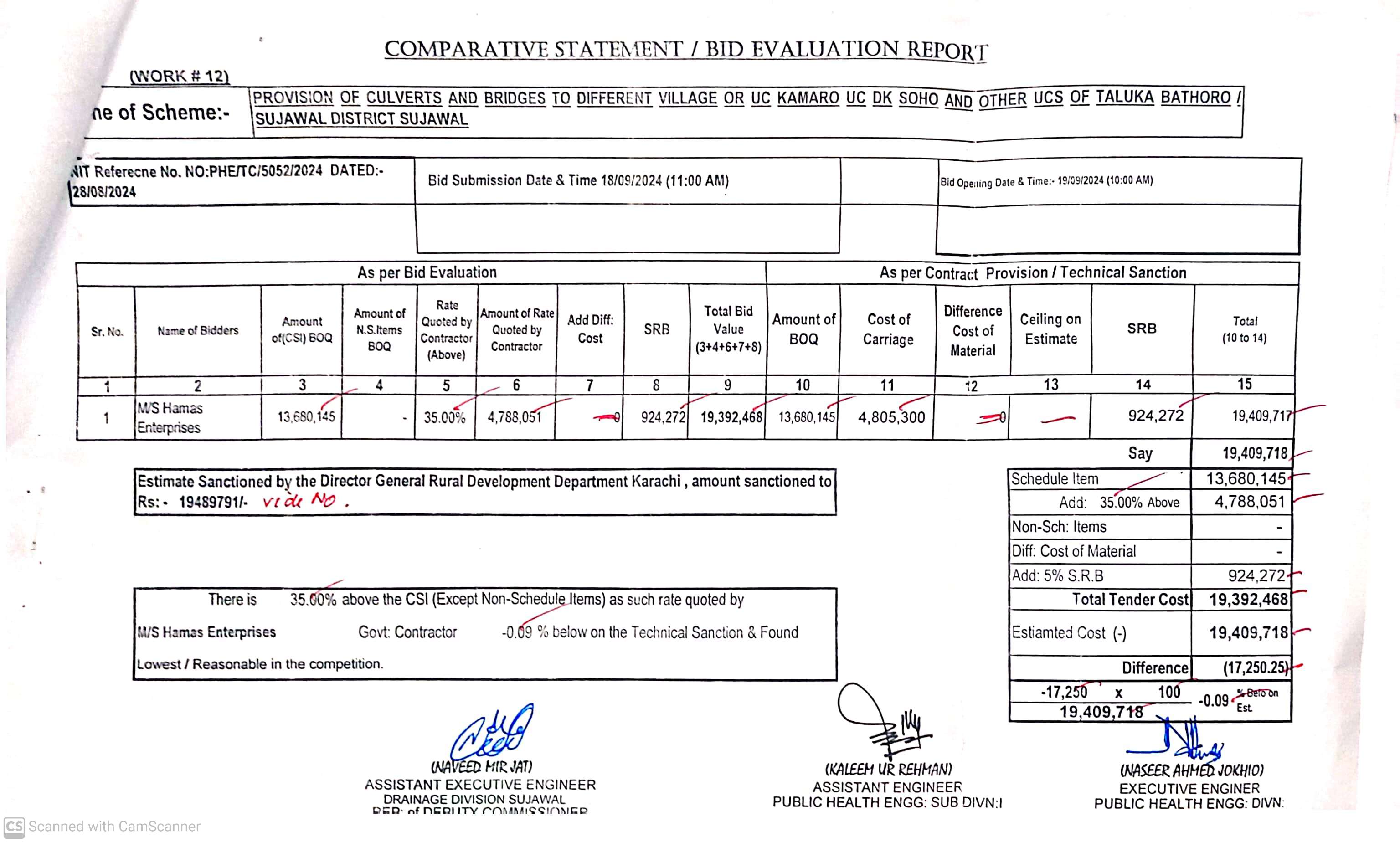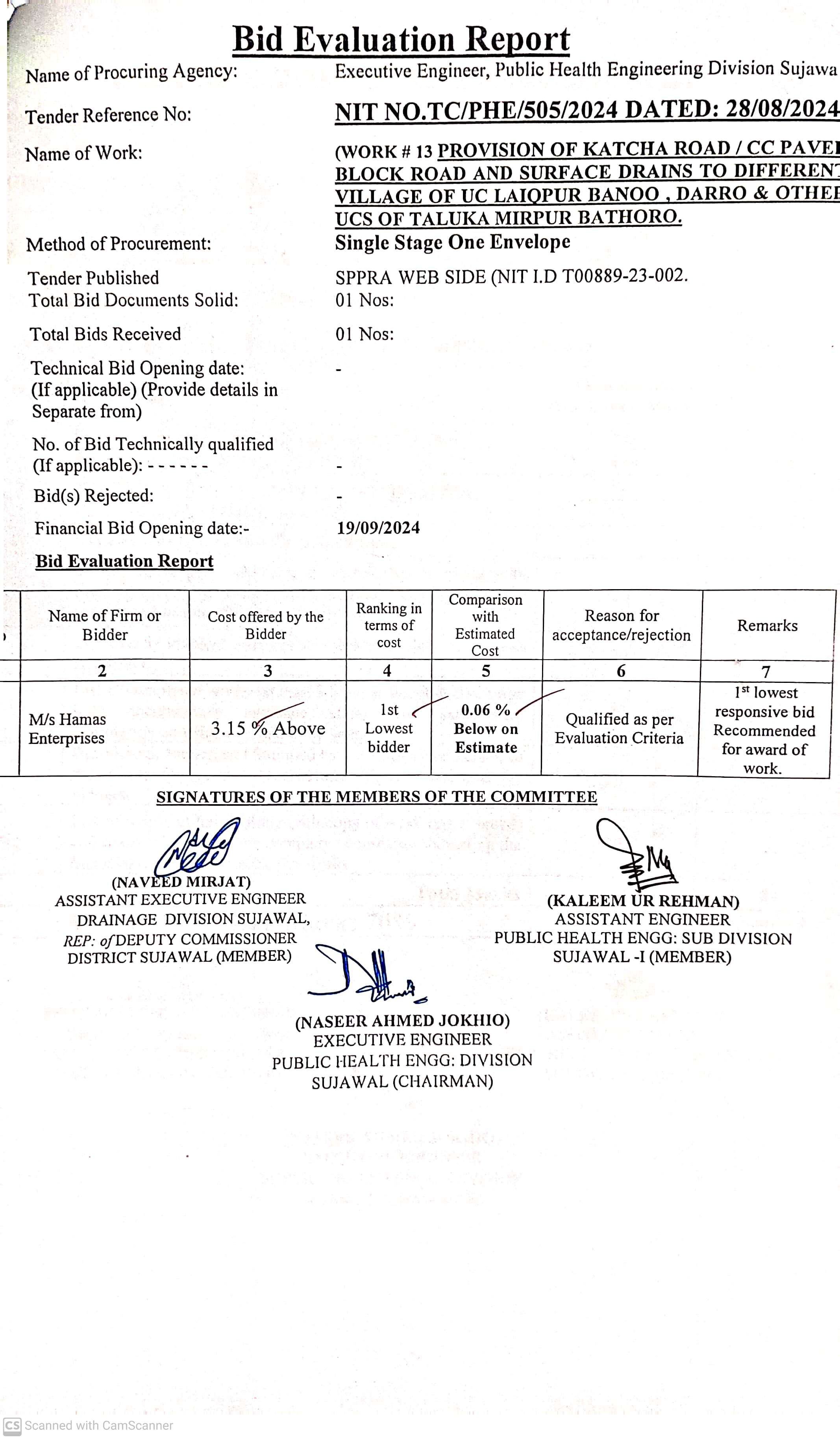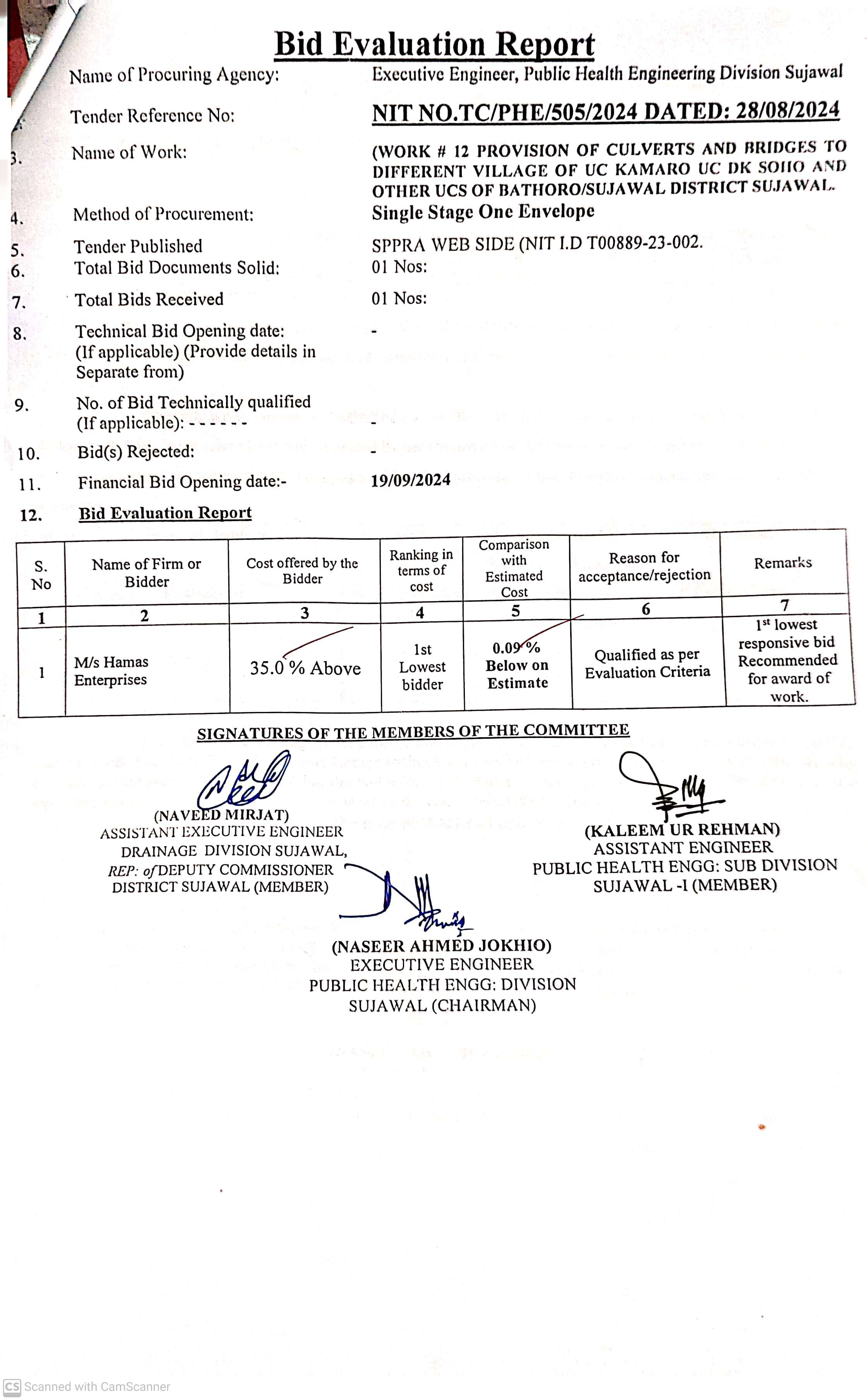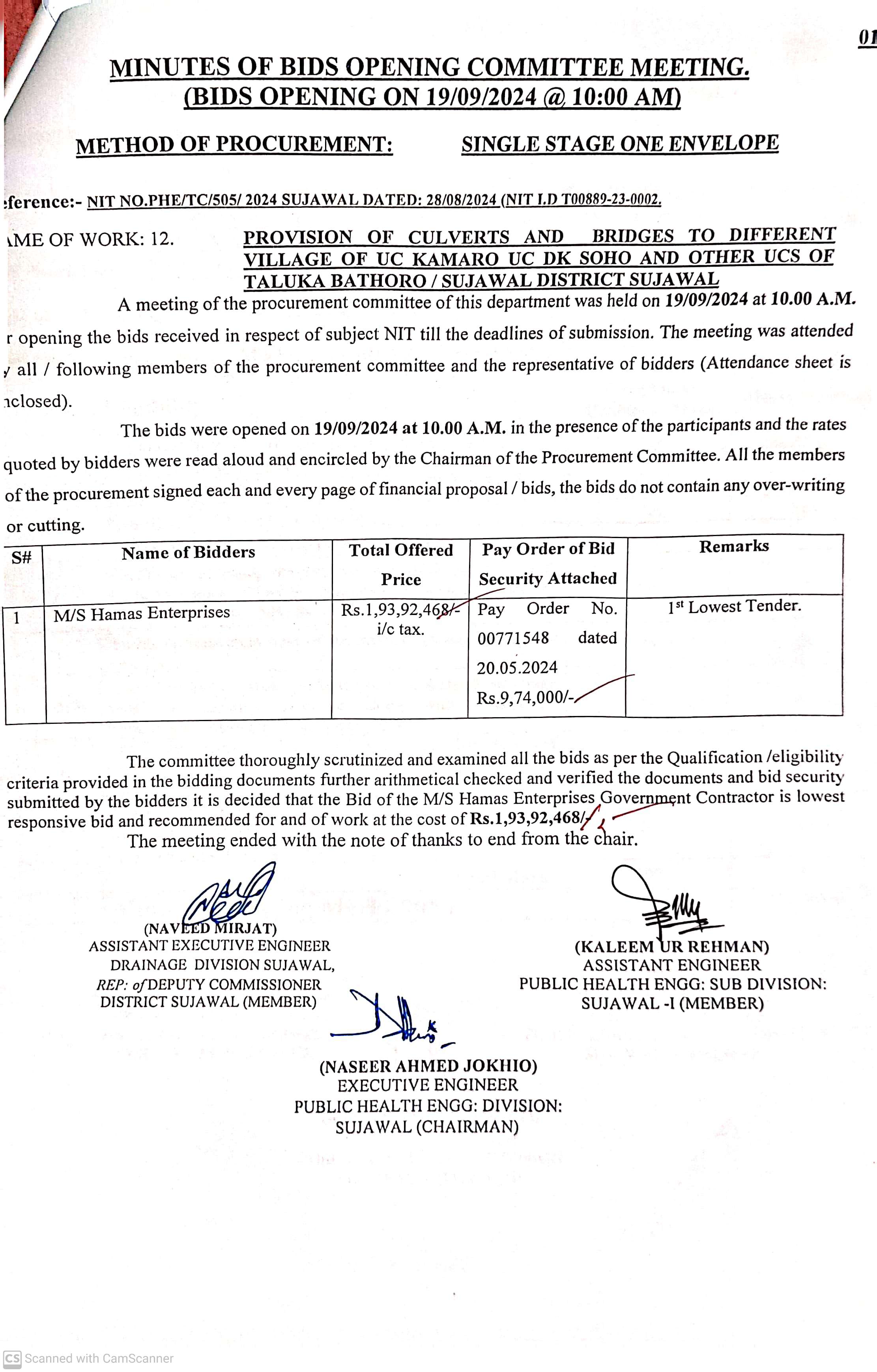 | T00889-23-0002 | BE00889-23-0002-12 | 12. PROVISION OF CULVERTS AND BRIDGES TO DIFFERENT VILLAGES OF UC KAMARO , UC DK SOHO & OTHER UCS OF TALUKA BATHORO/ SUJAWAL DISTRICT SUJAWAL | Executive Engineer Public Health Engineering Division Sujawal (34-Public health Engineering Department) | 20-09-2024 | Sujawal | Active |