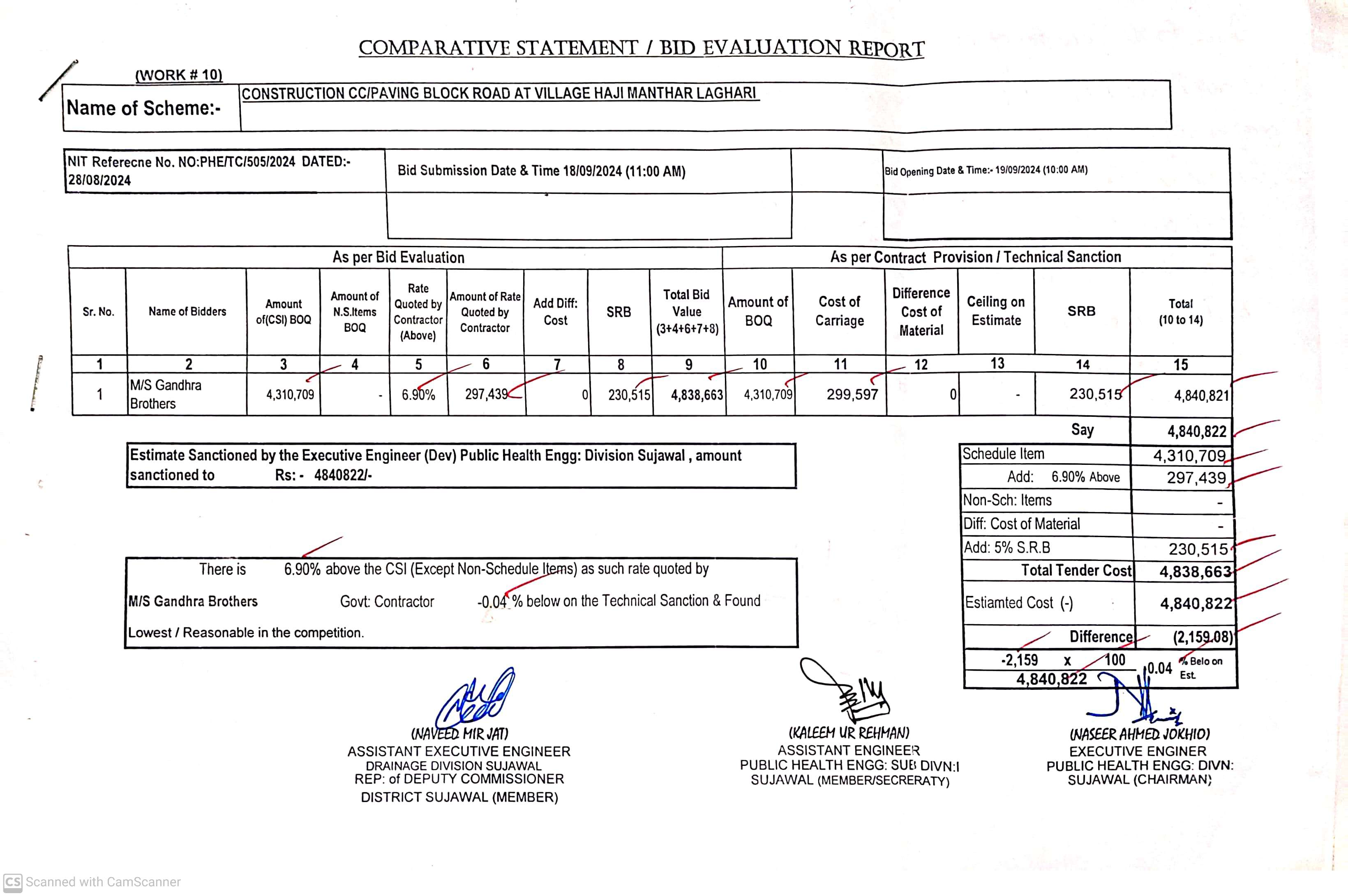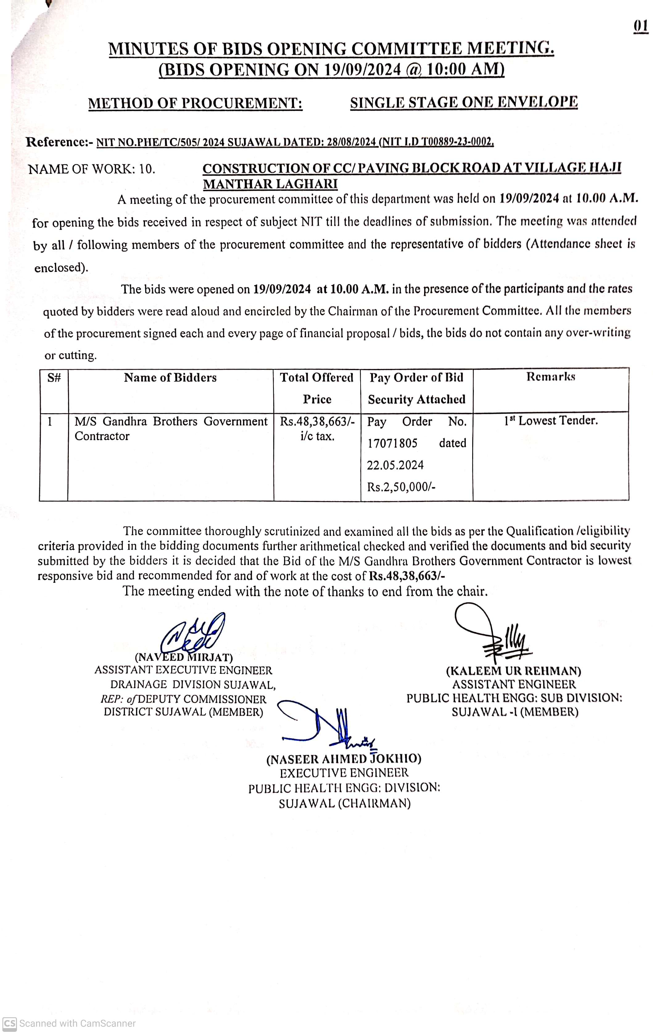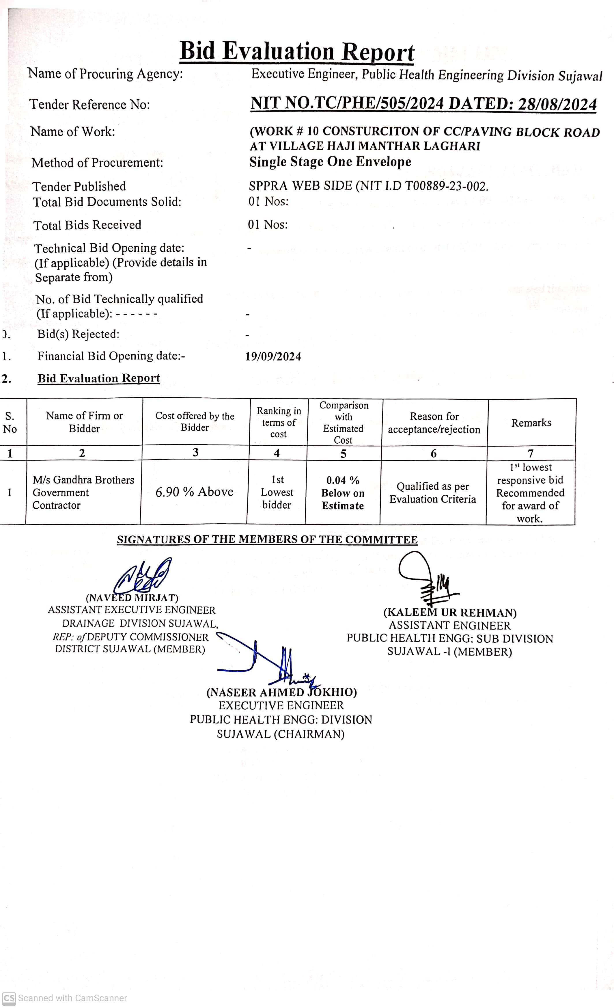 | T00889-23-0002 | BE00889-23-0002-10 | 10. CONSTRUCTION OF C.C./PAVING ROAD AT VILLAGE HAJI MANTHAR LAGHARI | Executive Engineer Public Health Engineering Division Sujawal (34-Public health Engineering Department) | 20-09-2024 | Sujawal | Active |