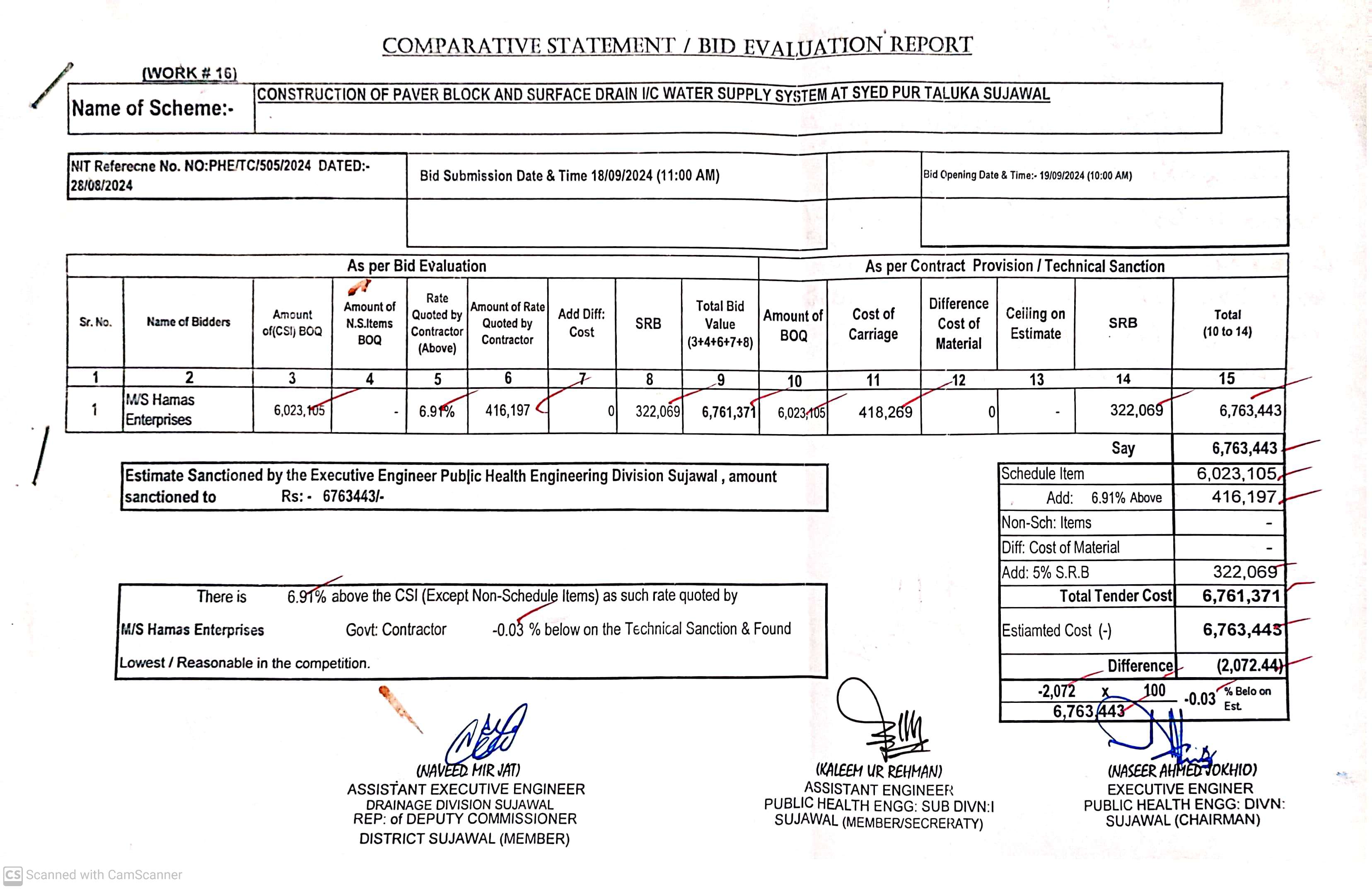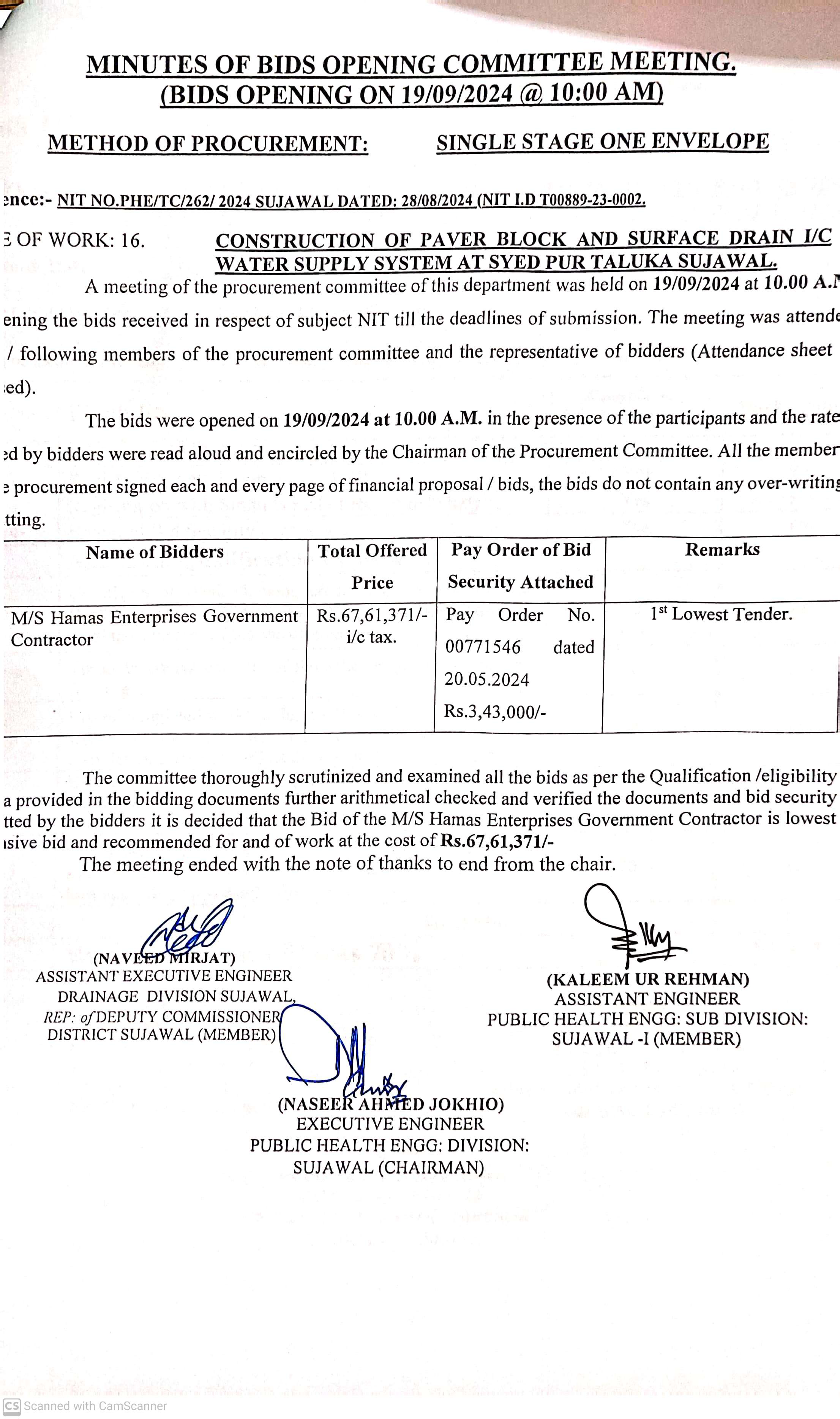 | T00889-23-0002 | BE00889-23-0002-16 | 16. CONSTRUCTION OF PAVING BLOCK & SURFACE DRAINS I/C WATER SUPPLY SYSTEM AT SYED PUR TALUKA SUJAWAL | Executive Engineer Public Health Engineering Division Sujawal (34-Public health Engineering Department) | 20-09-2024 | Sujawal | Active |