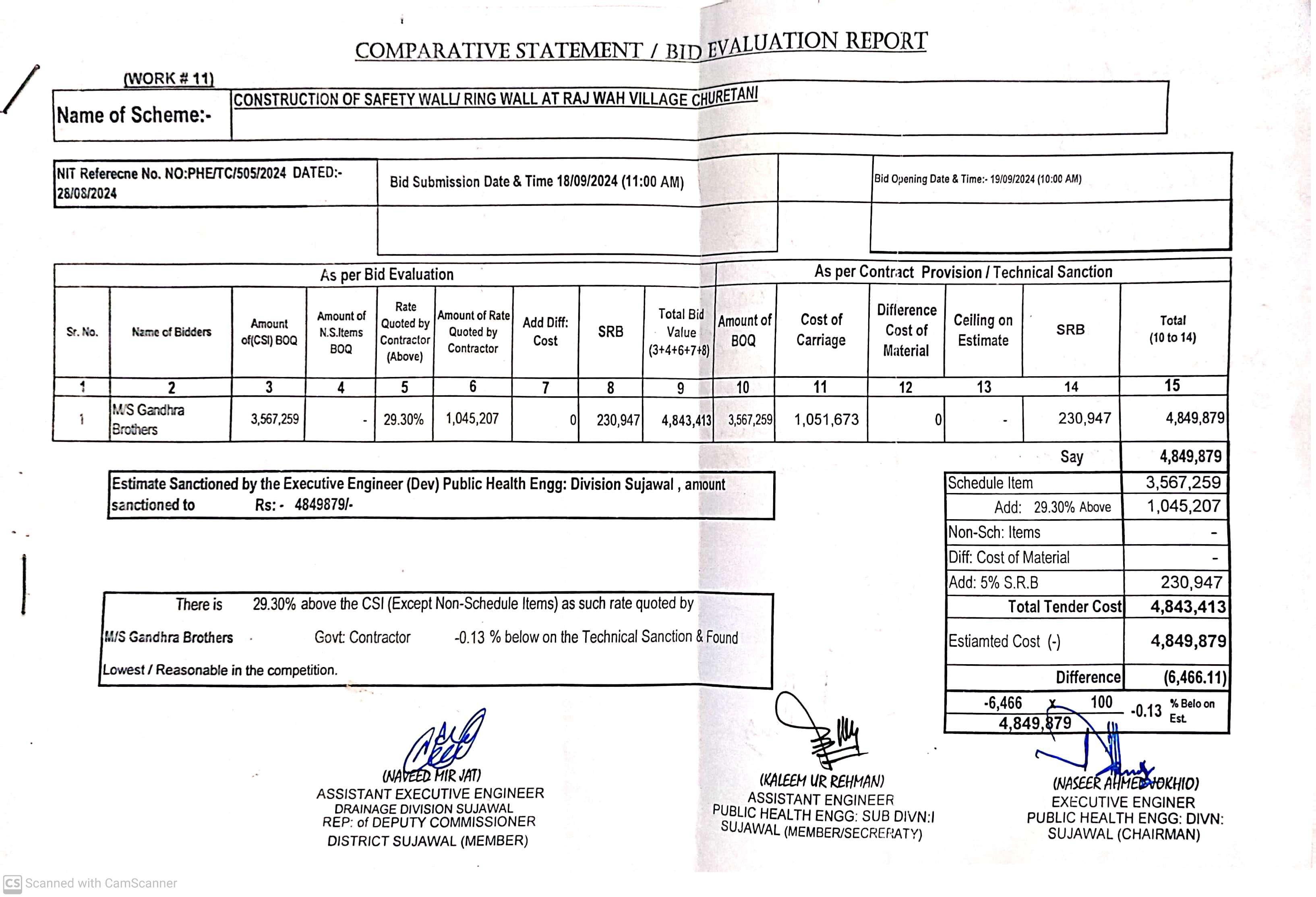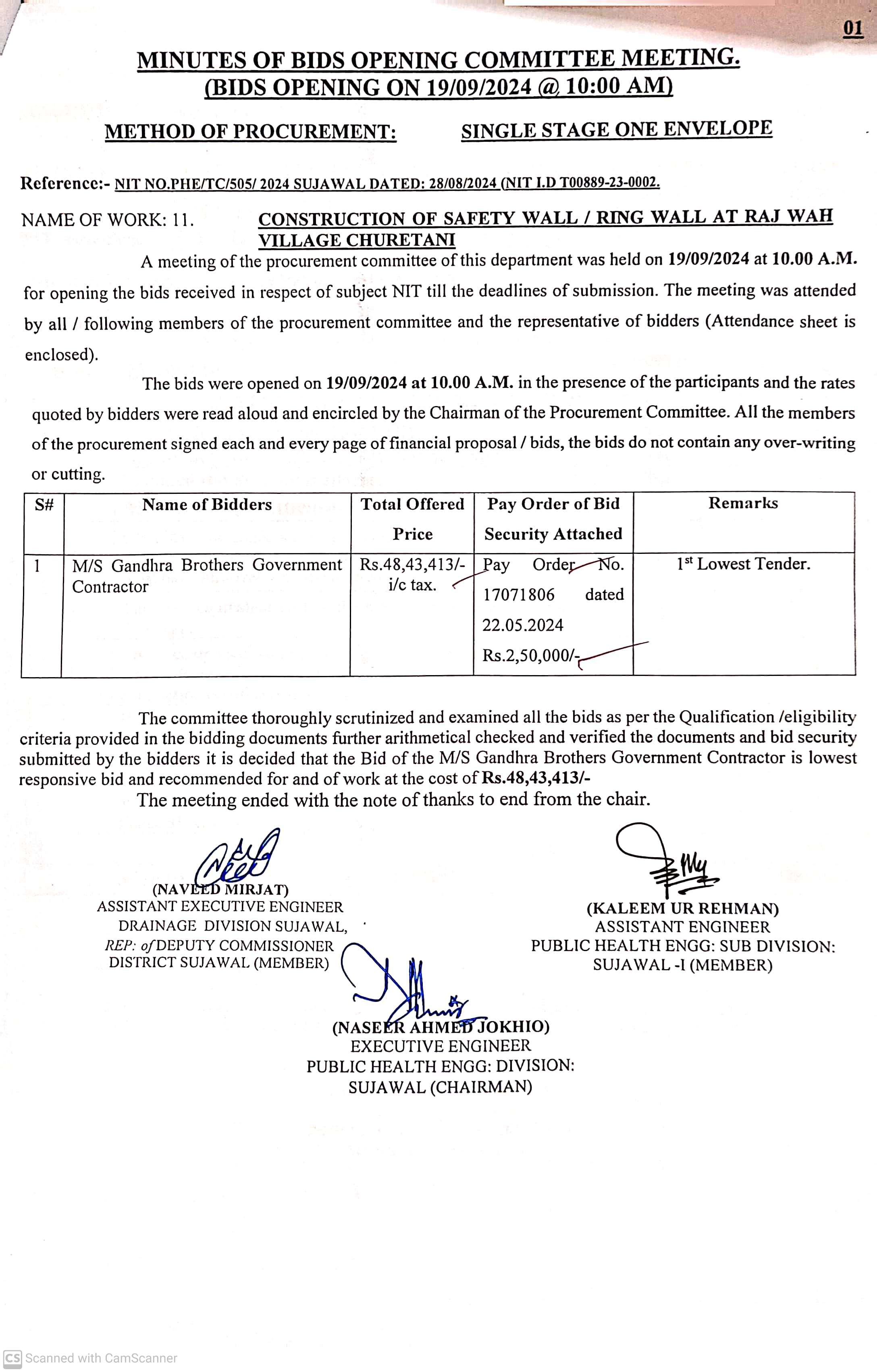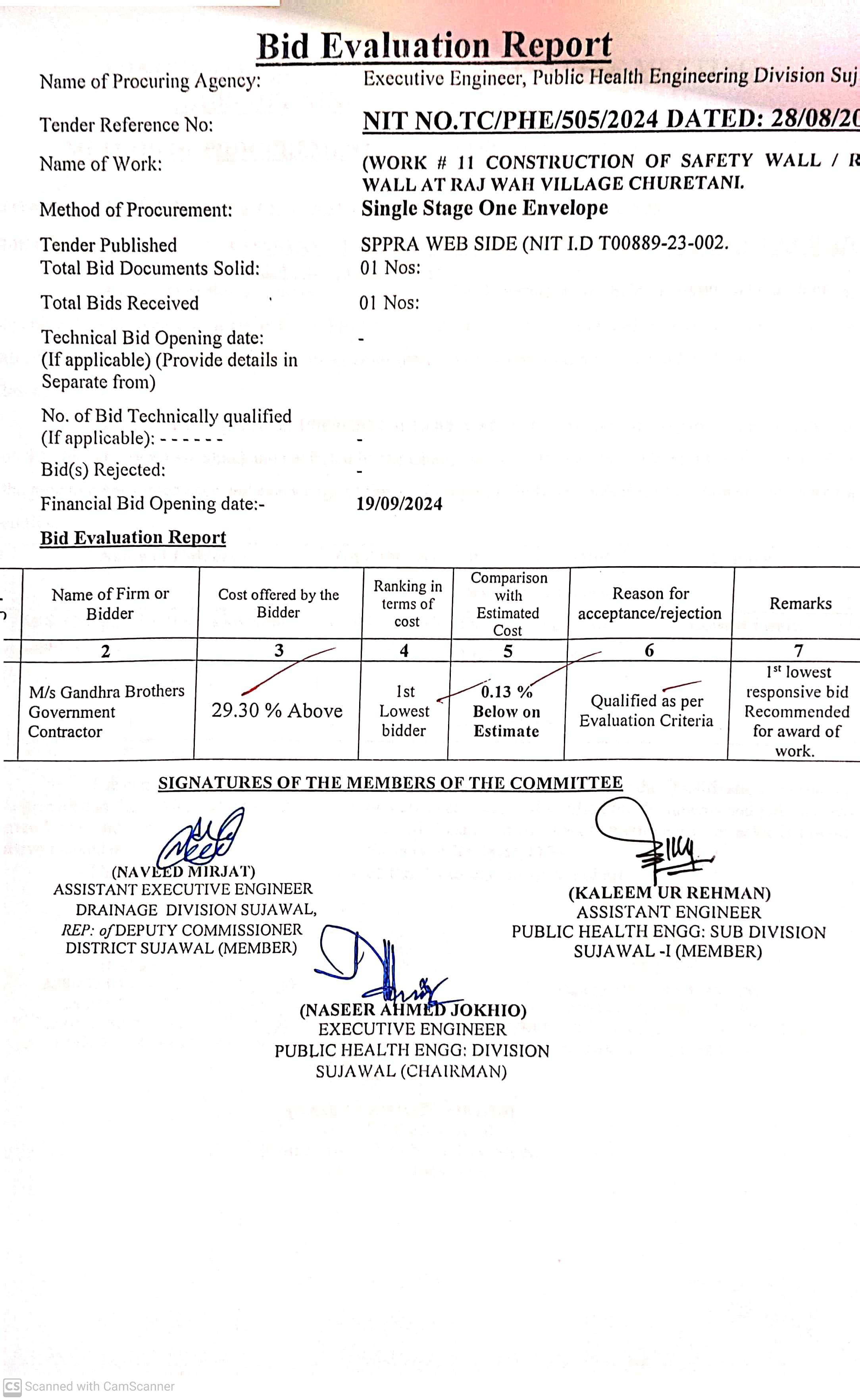| T00889-23-0002 | BE00889-23-0002-11 | 11. CONSTRUCTION OF SAFETY WALL/RING WALL RAJ WAH VILLAGE CHURETANI | Executive Engineer Public Health Engineering Division Sujawal (34-Public health Engineering Department) | 20-09-2024 | Sujawal | Active |