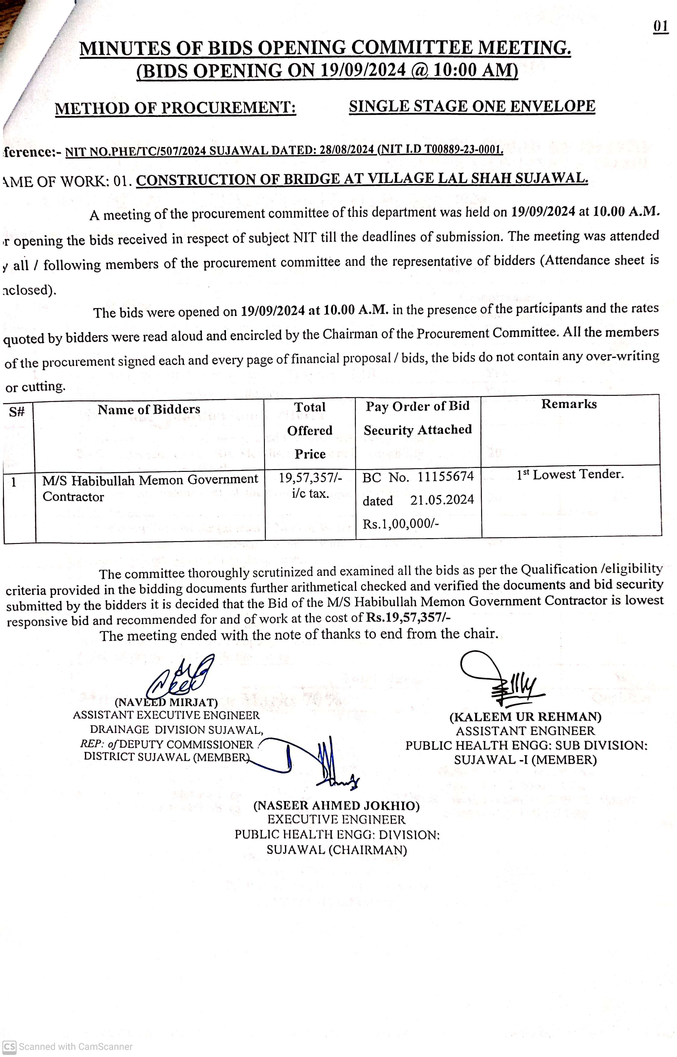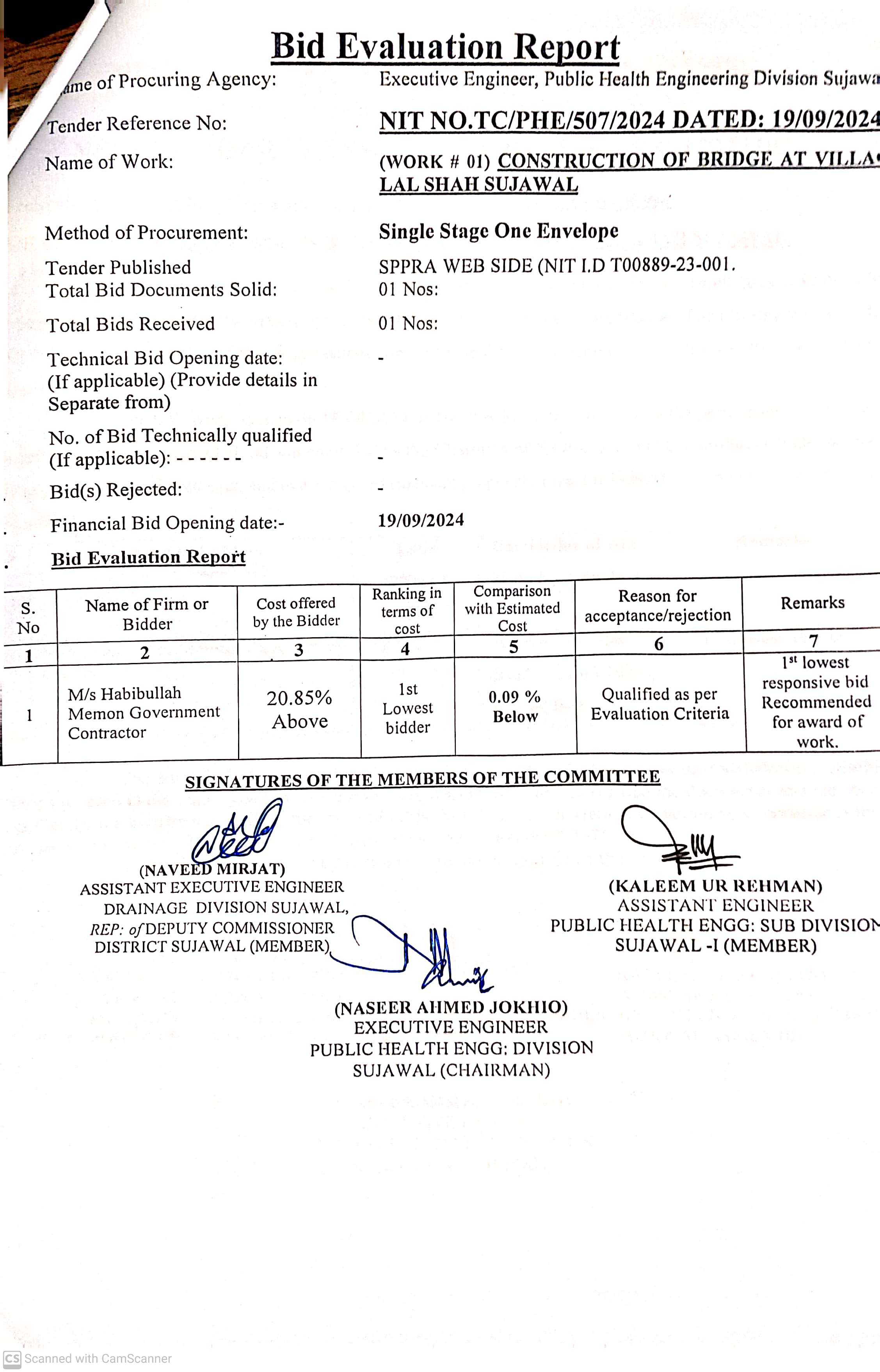 | T00889-23-0001 | BE00889-23-0001-1 | 1. Construction of Bridge at Village Lal Shah Sujawal | Executive Engineer Public Health Engineering Division Sujawal (34-Public health Engineering Department) | 20-09-2024 | Sujawal | Active |