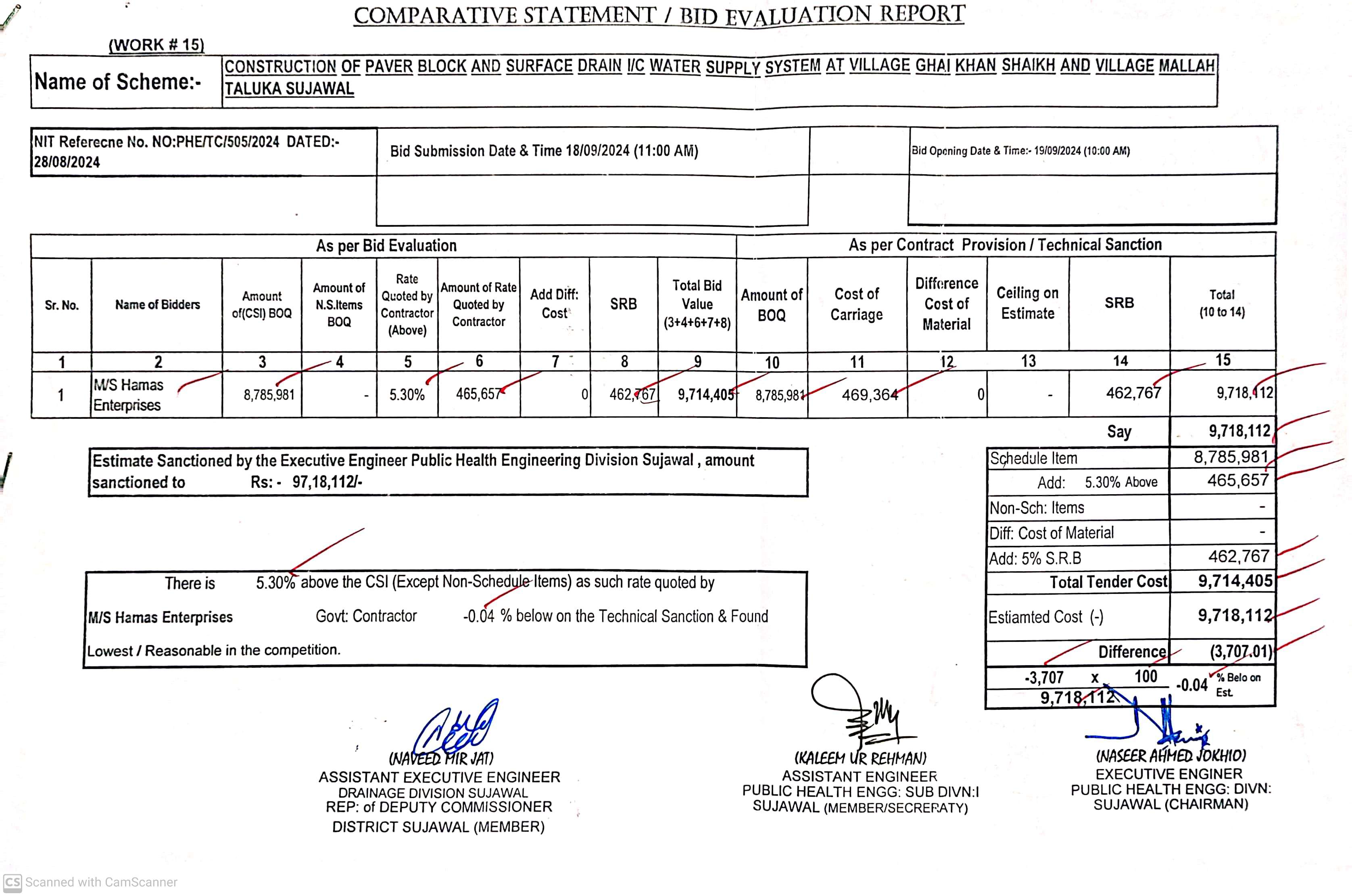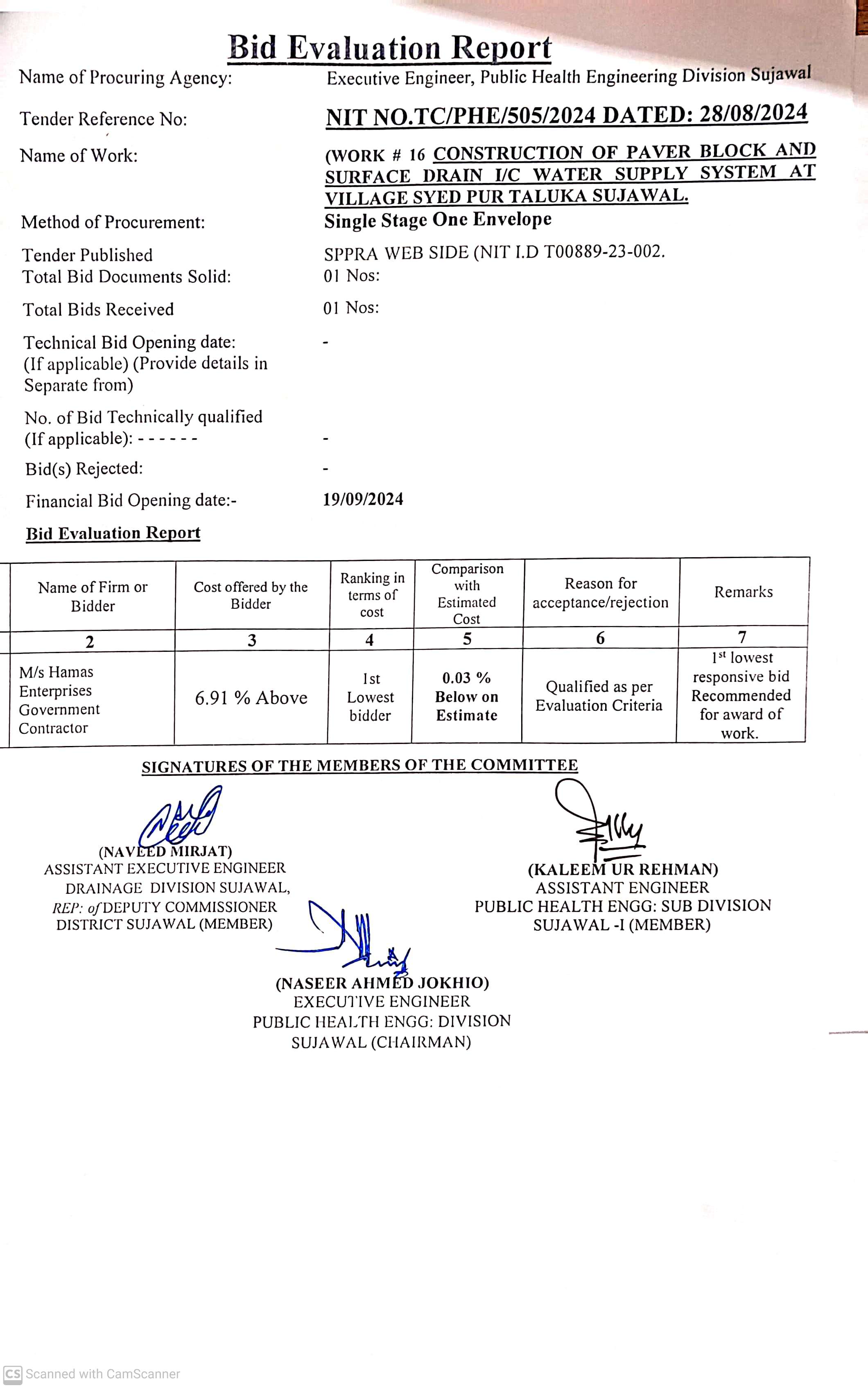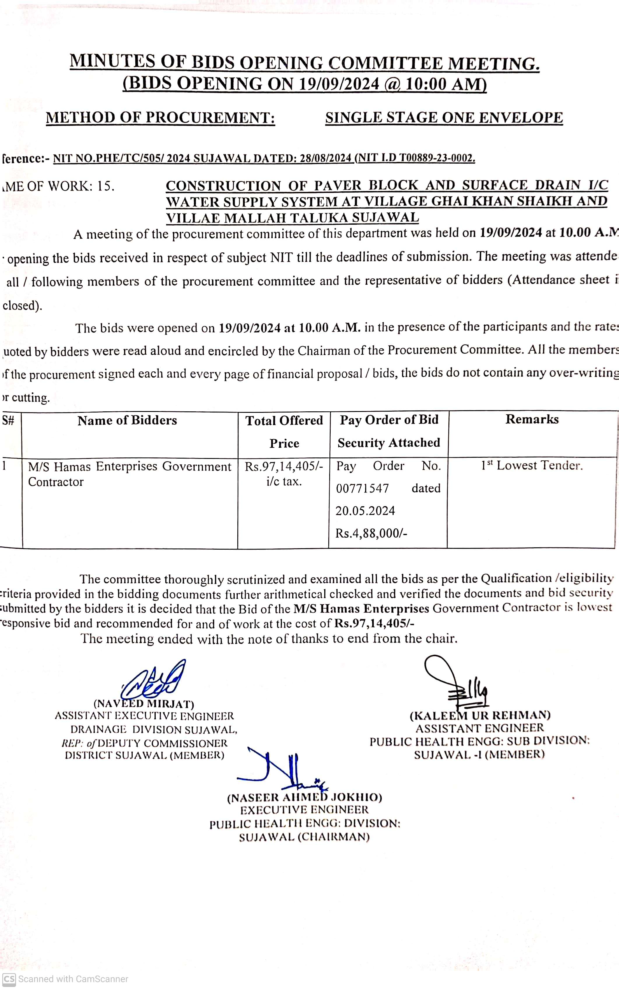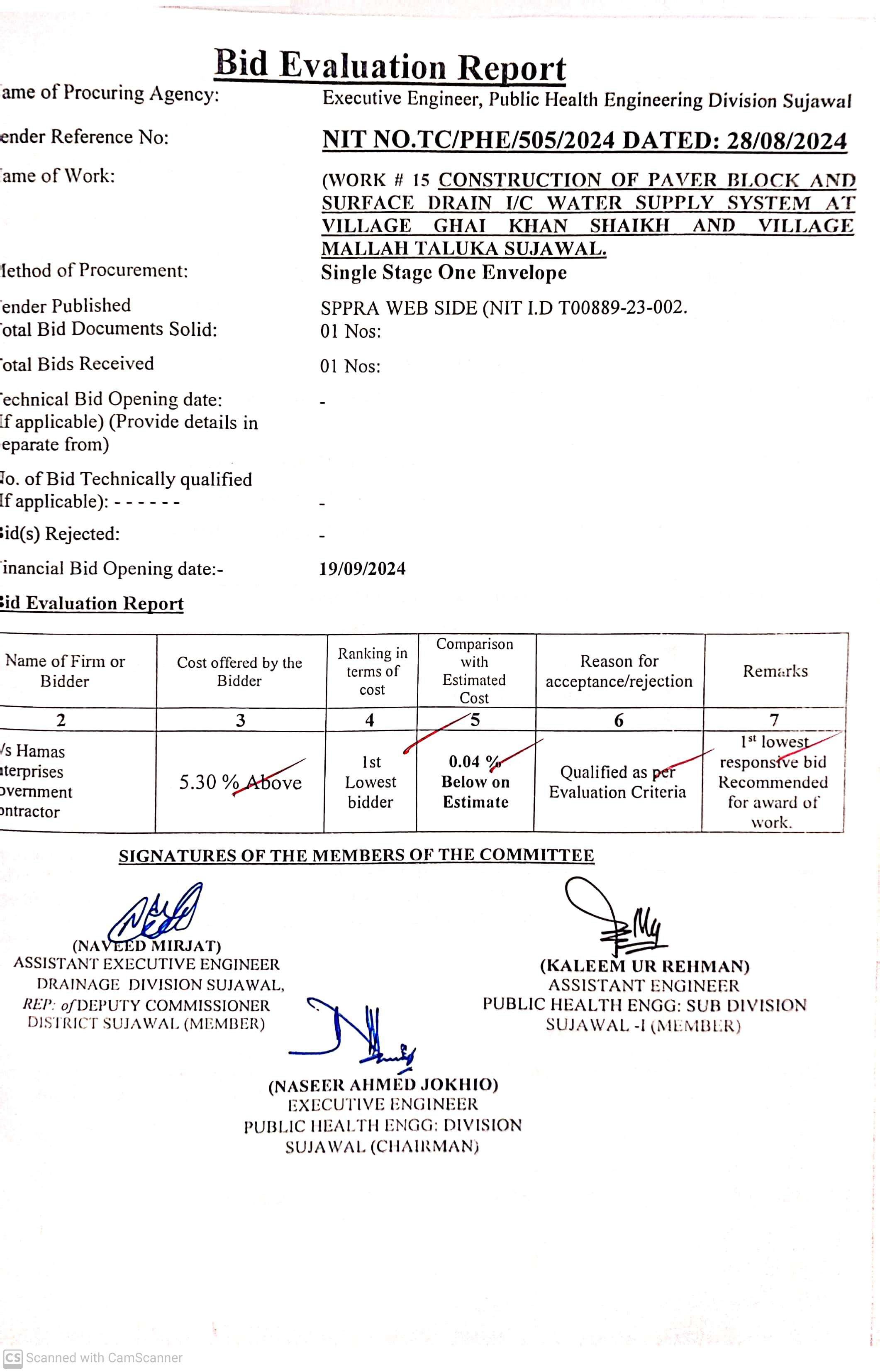 | T00889-23-0002 | BE00889-23-0002-15 | 15. CONSTRUCTION OF PAVER BLOCK AND SURFACE DRAIN I/C WATER SUPPLY SYSTEM AT VILLAGE GHAI KHAN SHAIKH AND VILLAGE MALLAH TALUKA SUJAWAL | Executive Engineer Public Health Engineering Division Sujawal (34-Public health Engineering Department) | 20-09-2024 | Sujawal | Active |