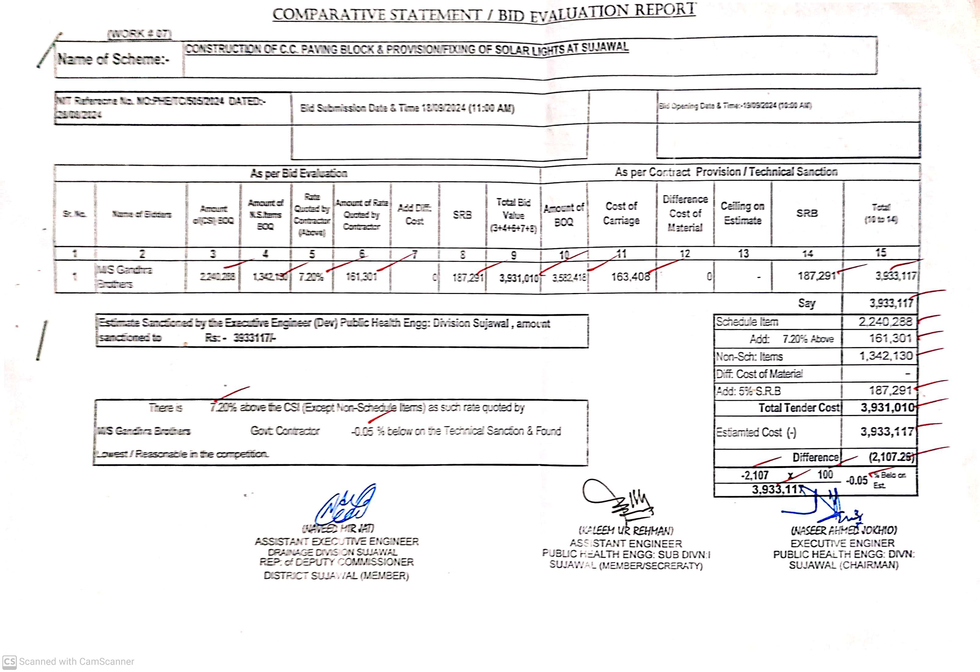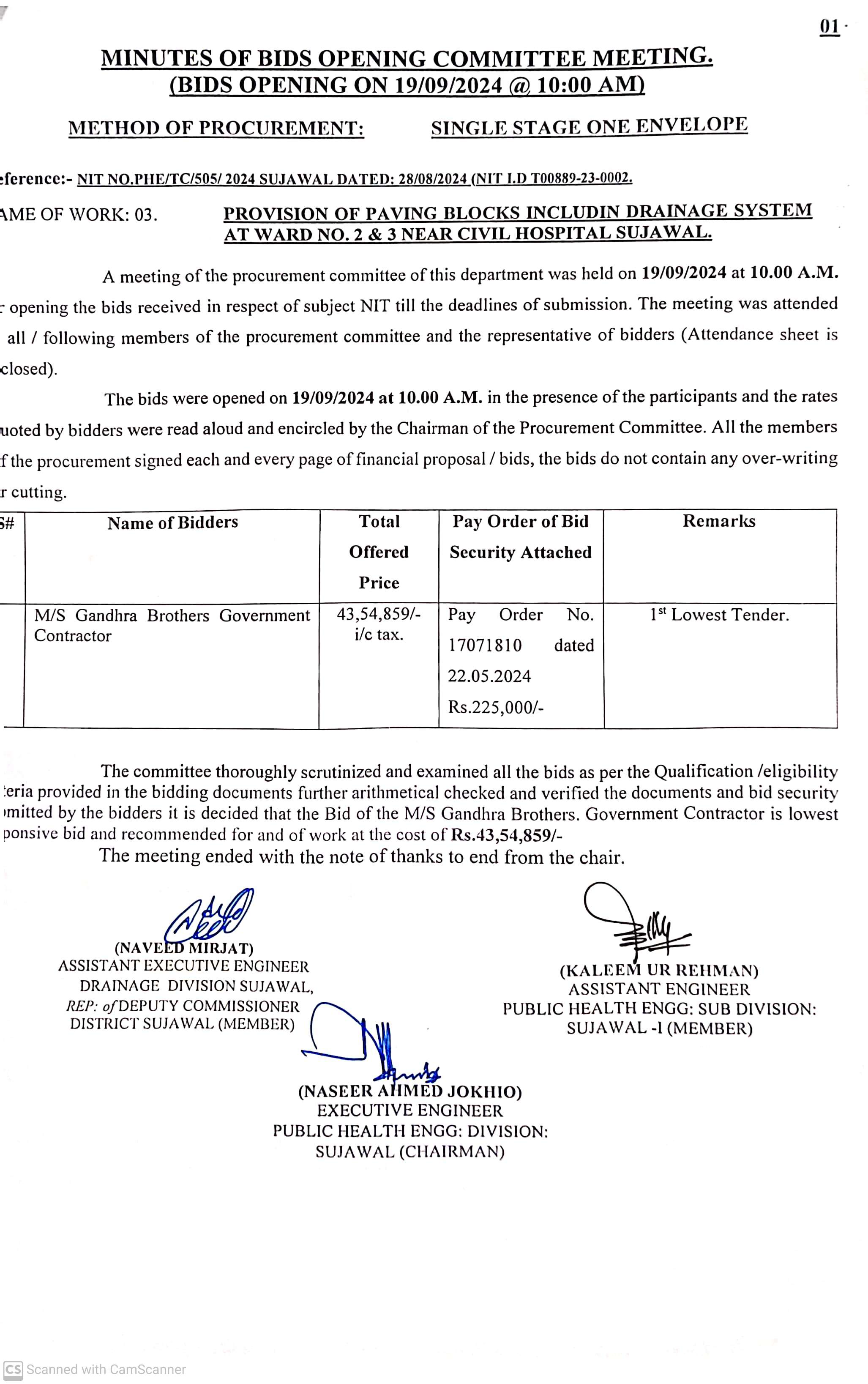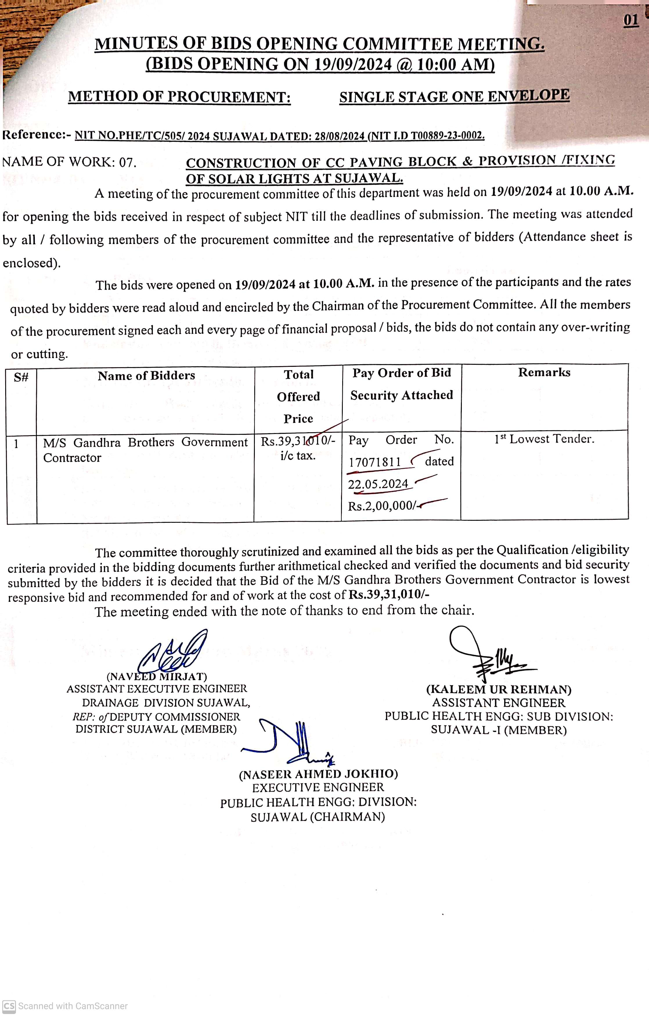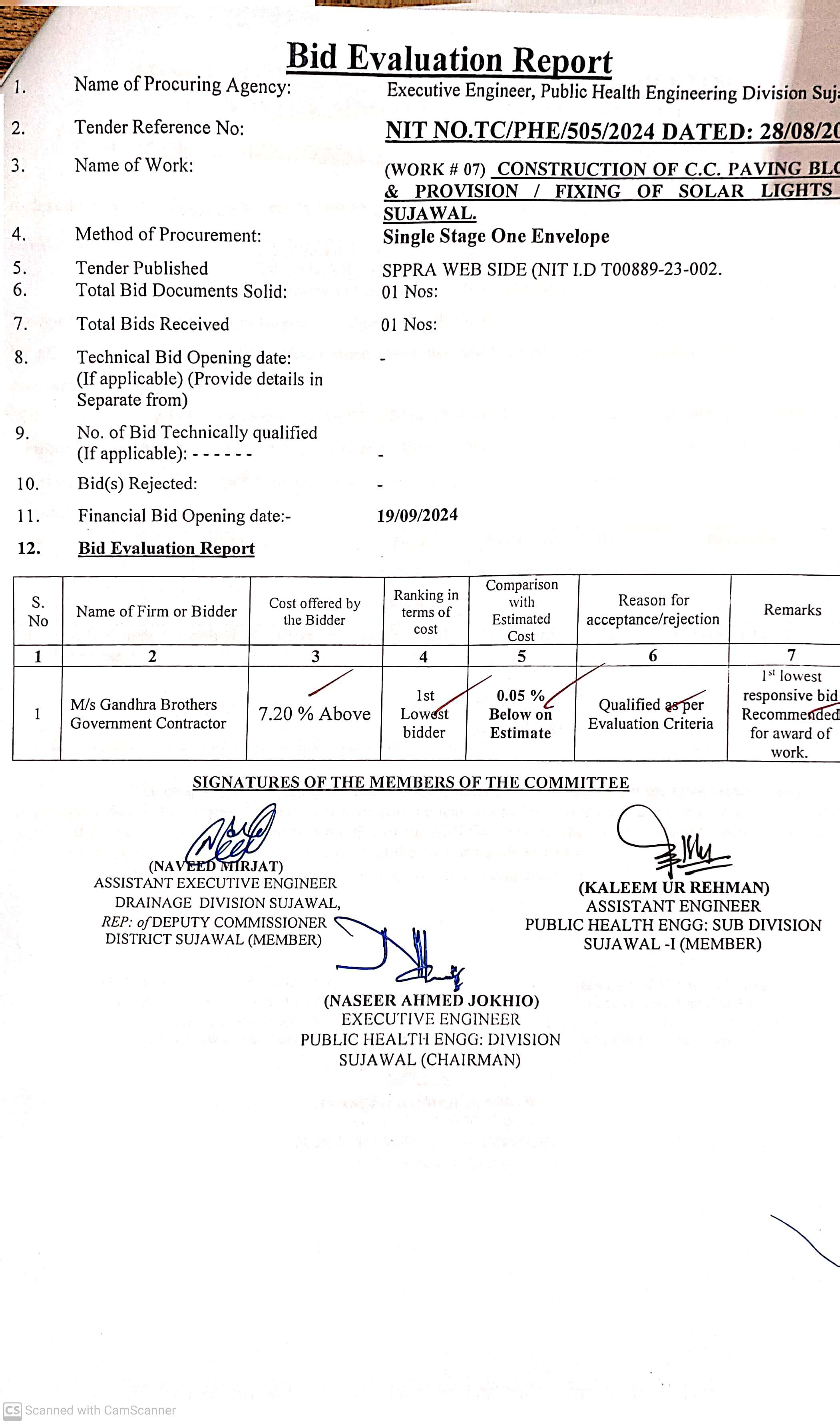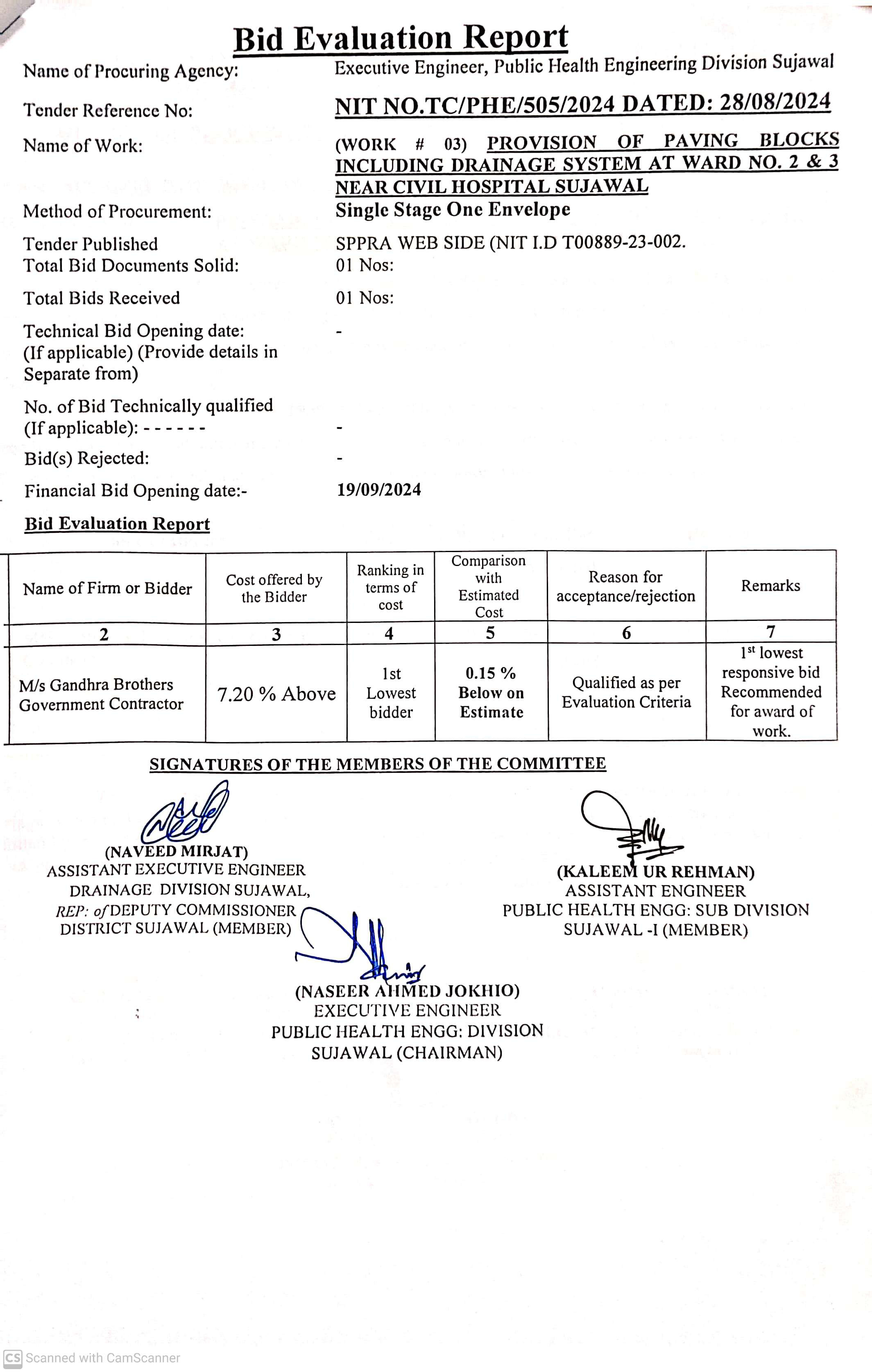 | T00889-23-0002 | BE00889-23-0002-7 | 7. CONSTRUCTION OF C.C. PAVING BLOCK & PROVISION / FIXING OF SOLAR LIGHTS AT SUJAWAL | Executive Engineer Public Health Engineering Division Sujawal (34-Public health Engineering Department) | 20-09-2024 | Sujawal | Active |