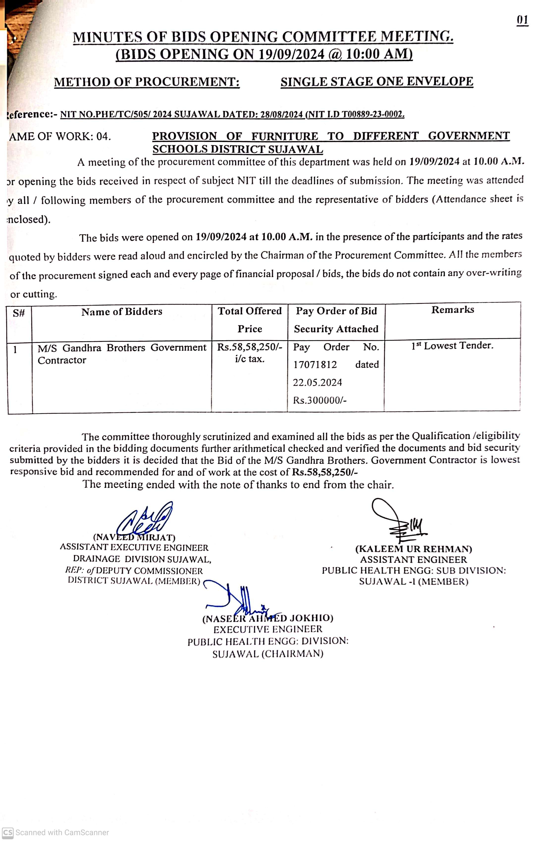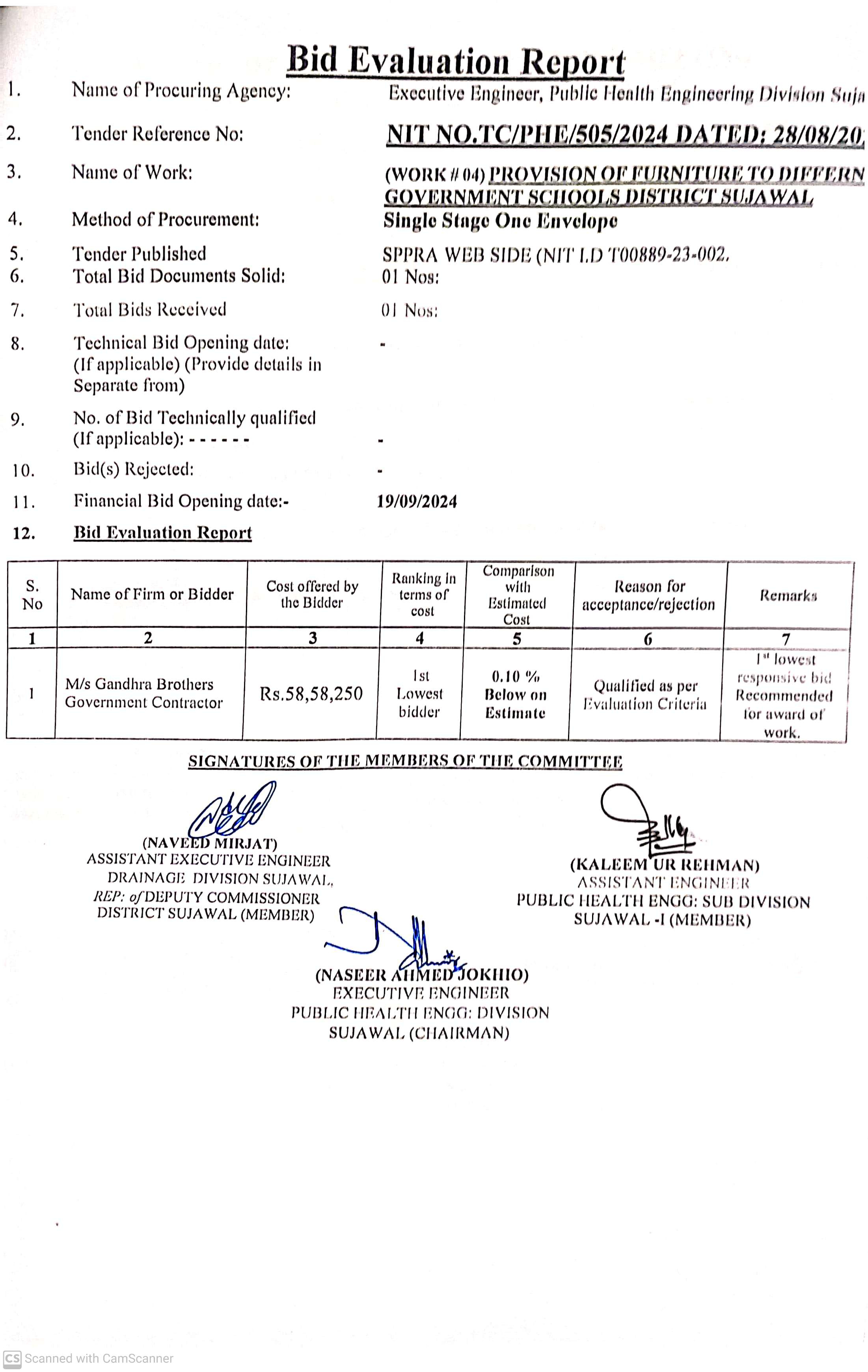 | T00889-23-0002 | BE00889-23-0002-4 | 4. PROVISION OF FURNITURE TO DIFFERENT GOVERNMENT SCHOOLS DISTRICT SUJAWAL | Executive Engineer Public Health Engineering Division Sujawal (34-Public health Engineering Department) | 20-09-2024 | Sujawal | Active |