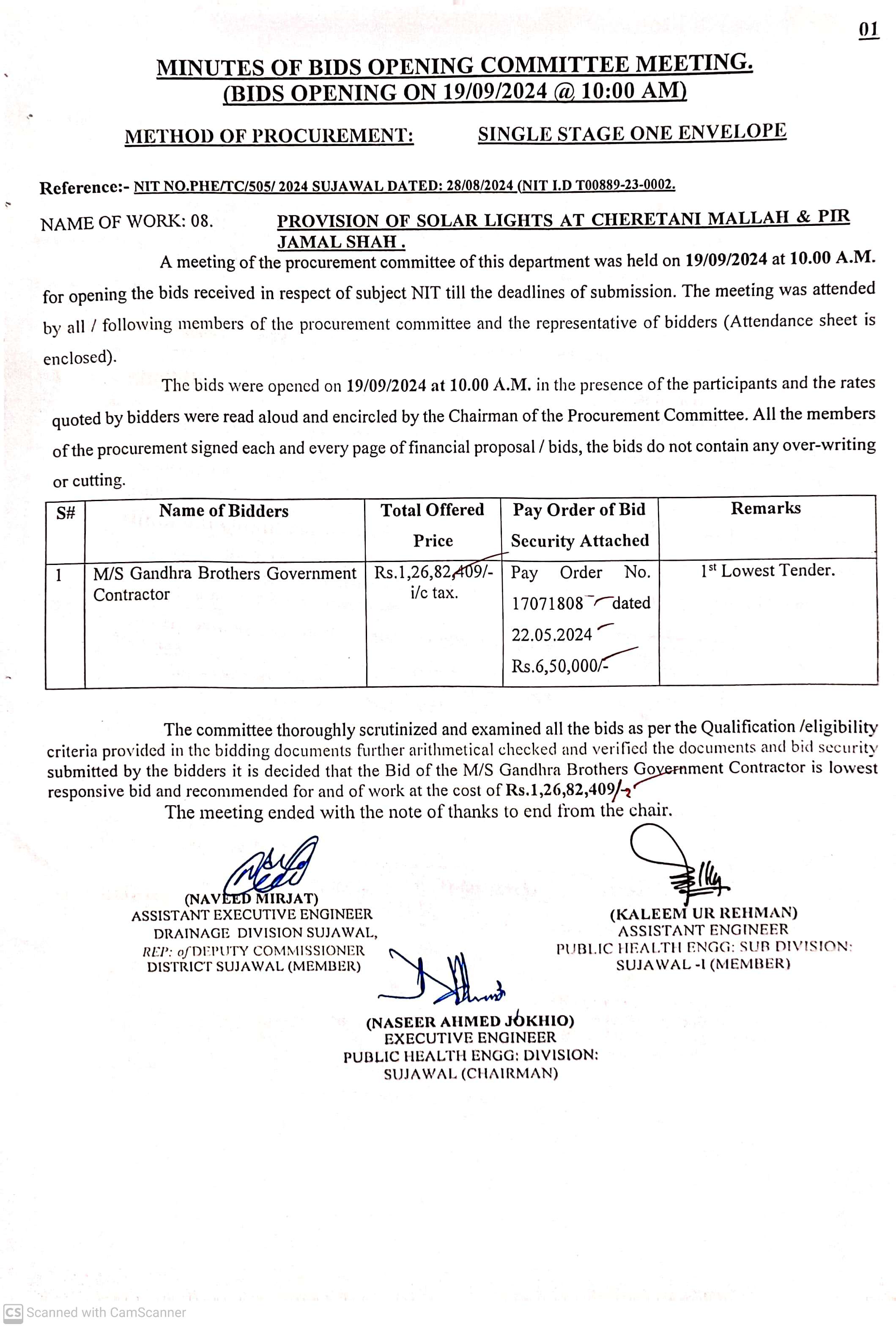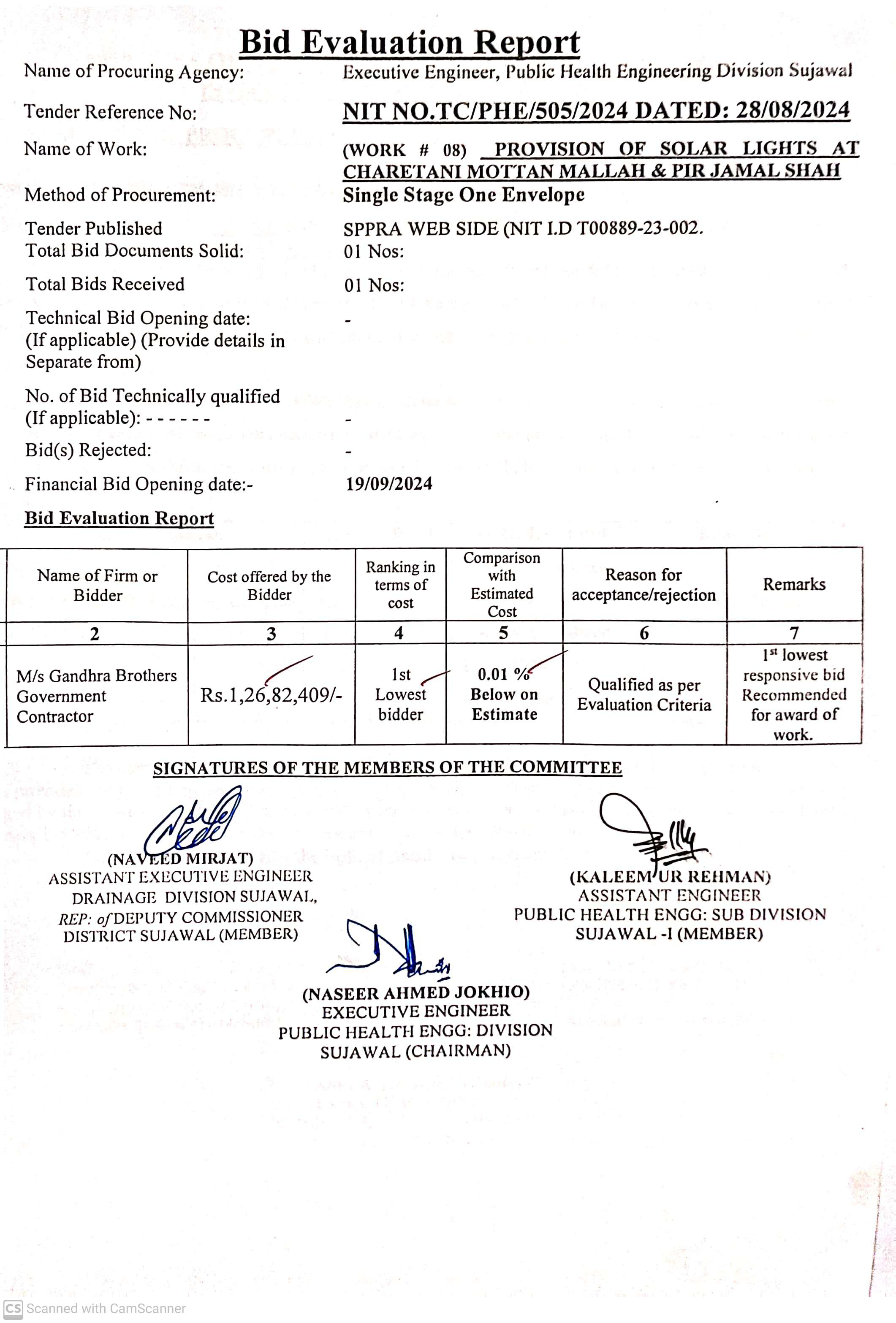 | T00889-23-0002 | BE00889-23-0002-1 | 1. PROVISION OF SOLAR LIGHTS AT VILLAGE SATIYANI SHARIF | Executive Engineer Public Health Engineering Division Sujawal (34-Public health Engineering Department) | 20-09-2024 | Sujawal | Active |