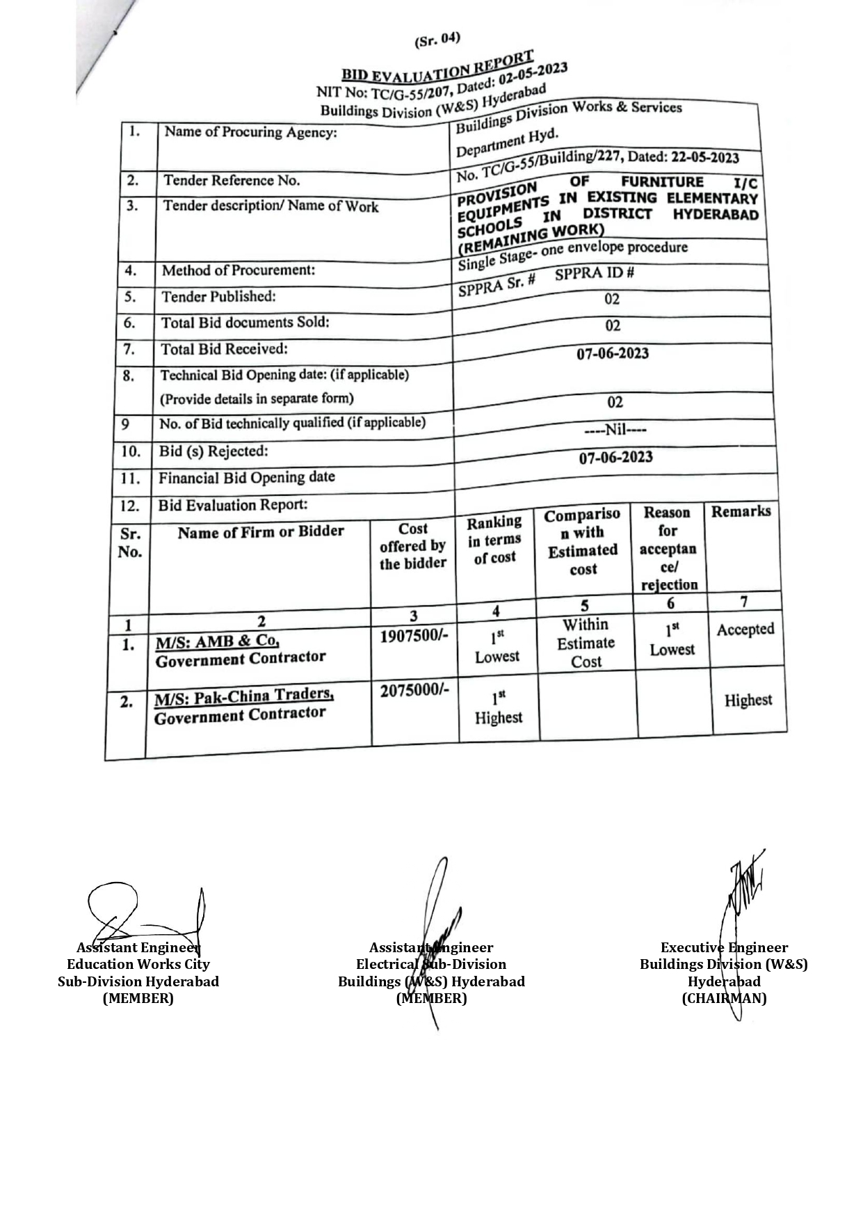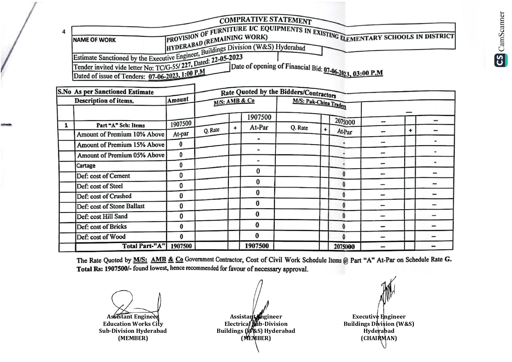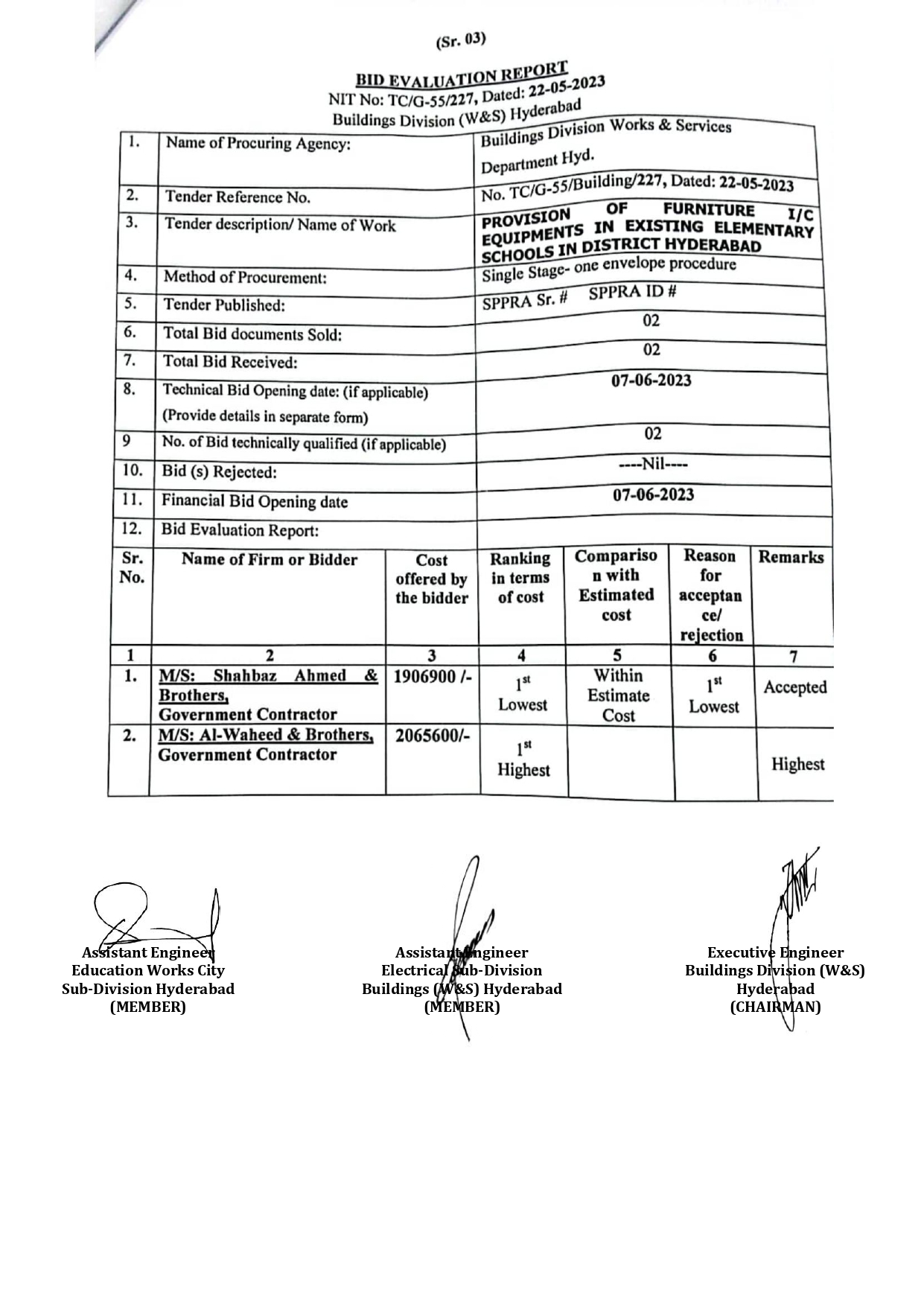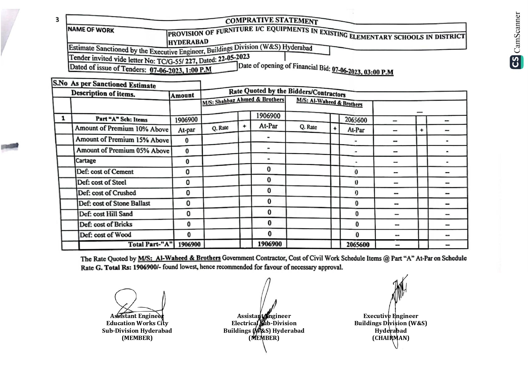 | T00575-22-0004 | BE00575-22-0004-33 | PROVISION OF FURNITURE I/C EQUIPMENTS IN EXISTING ELEMENTARY SCHOOLS IN DISTRICT HYDERABAD. | XEN Building Division Hyderabad (51-Works and Services Department) | 30-05-2023 | Hyderabad | Active |