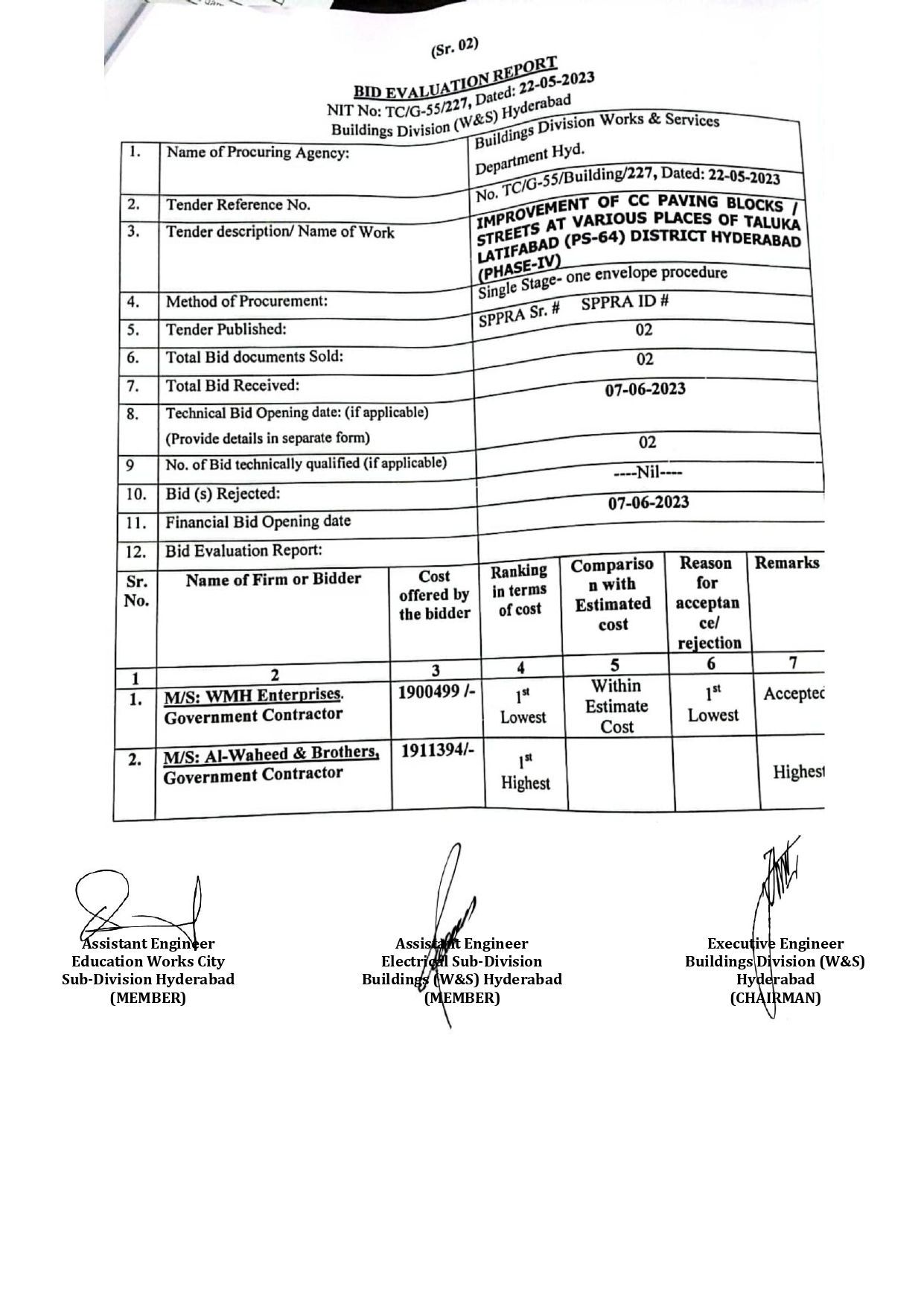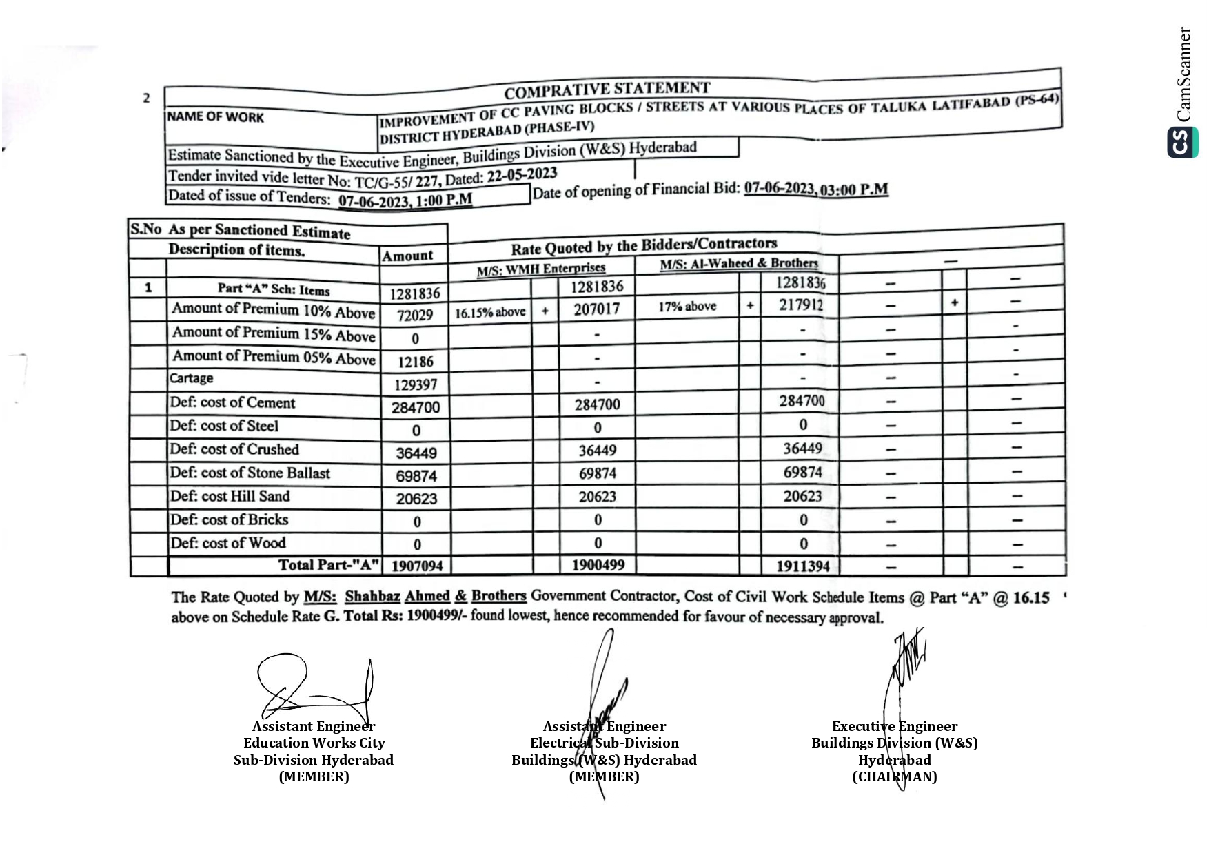 | T00575-22-0004 | BE00575-22-0004-25 | 25 IMPROVEMENT OF CC PAVING BLOCKS / STREETS AT VARIOUS PLACES OF TALUKA CITY / LATIFABAD (PS-64) DISTRICT HYDERABAD. | XEN Building Division Hyderabad (51-Works and Services Department) | 30-05-2023 | Hyderabad | Active |
