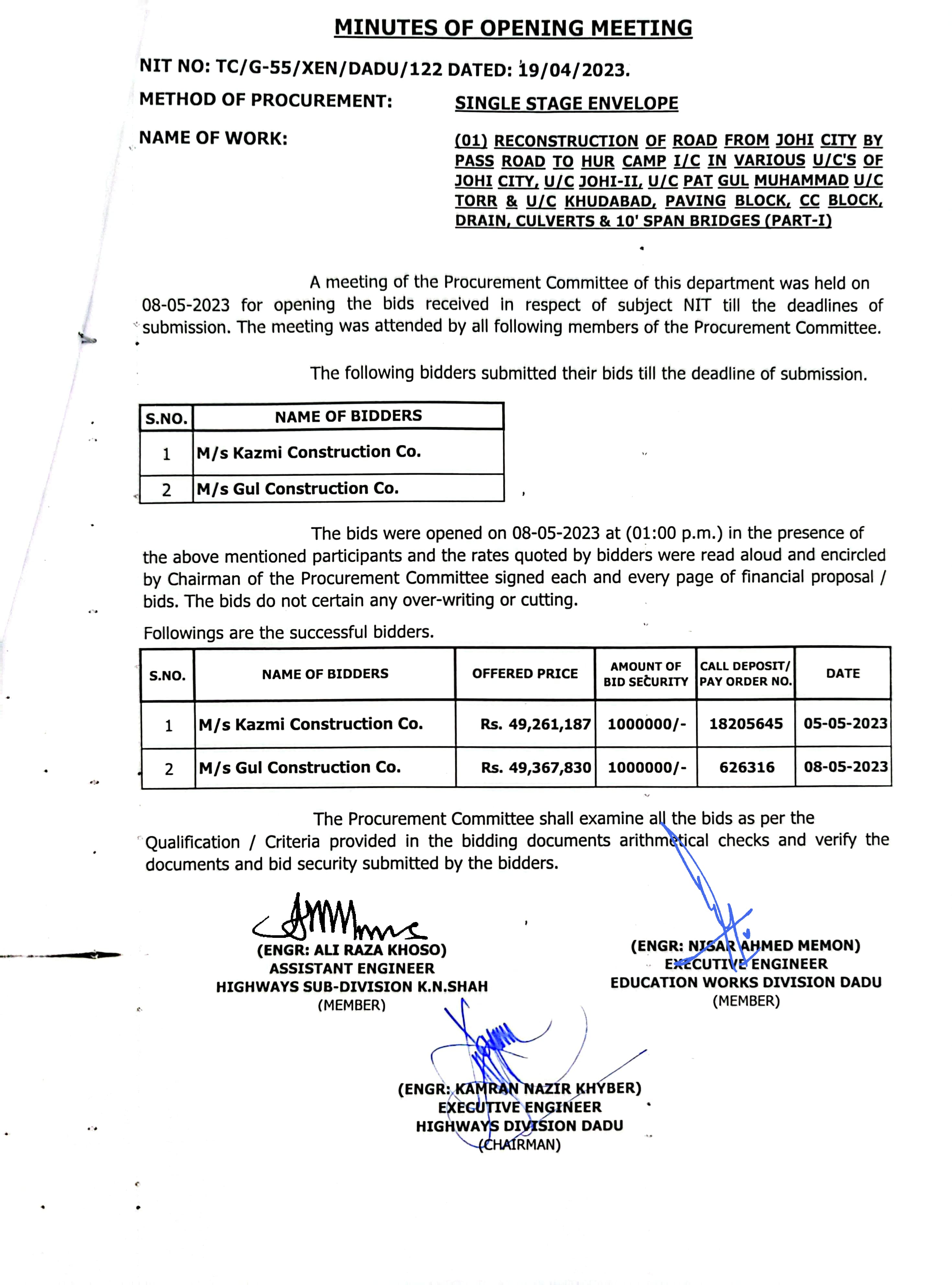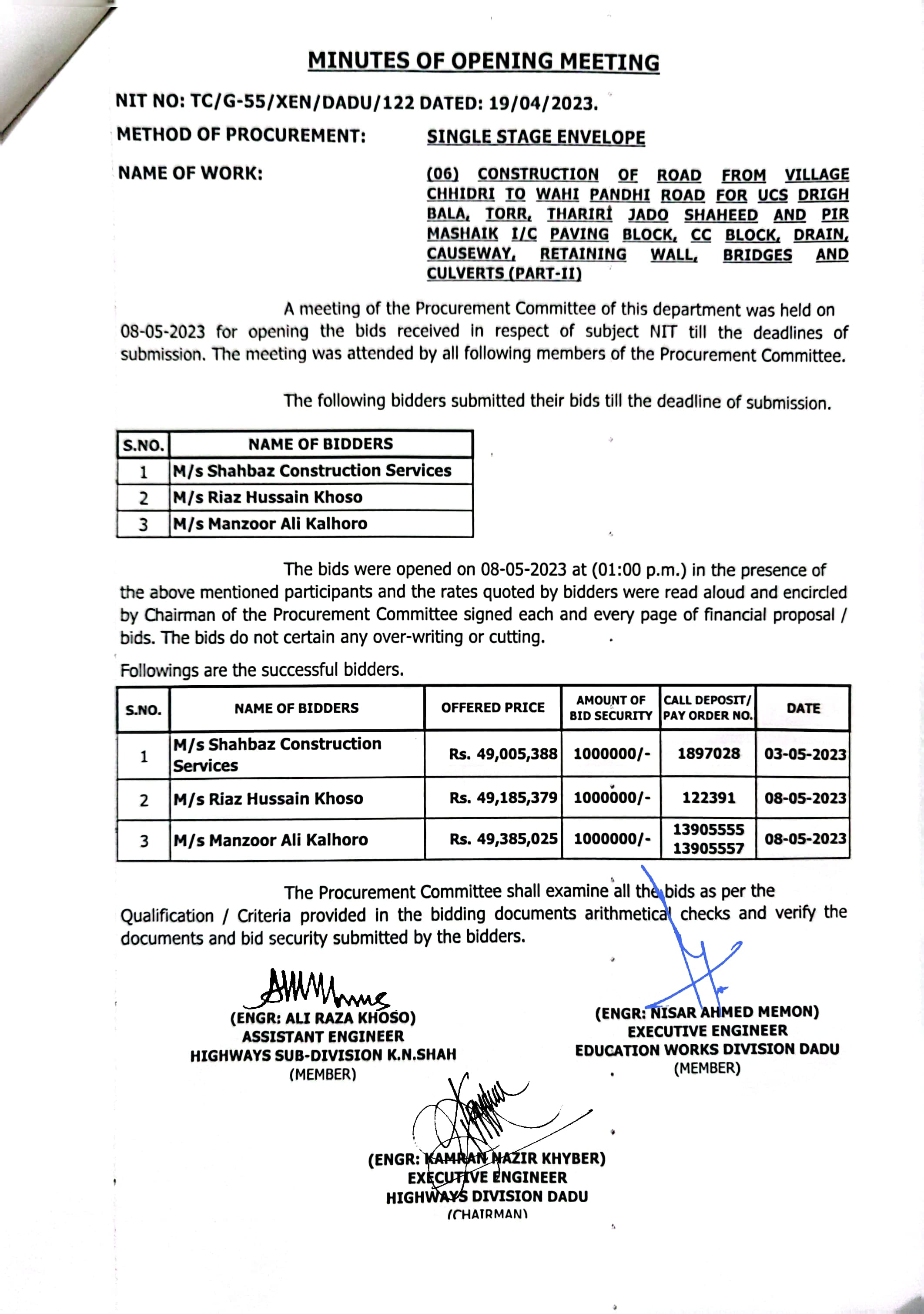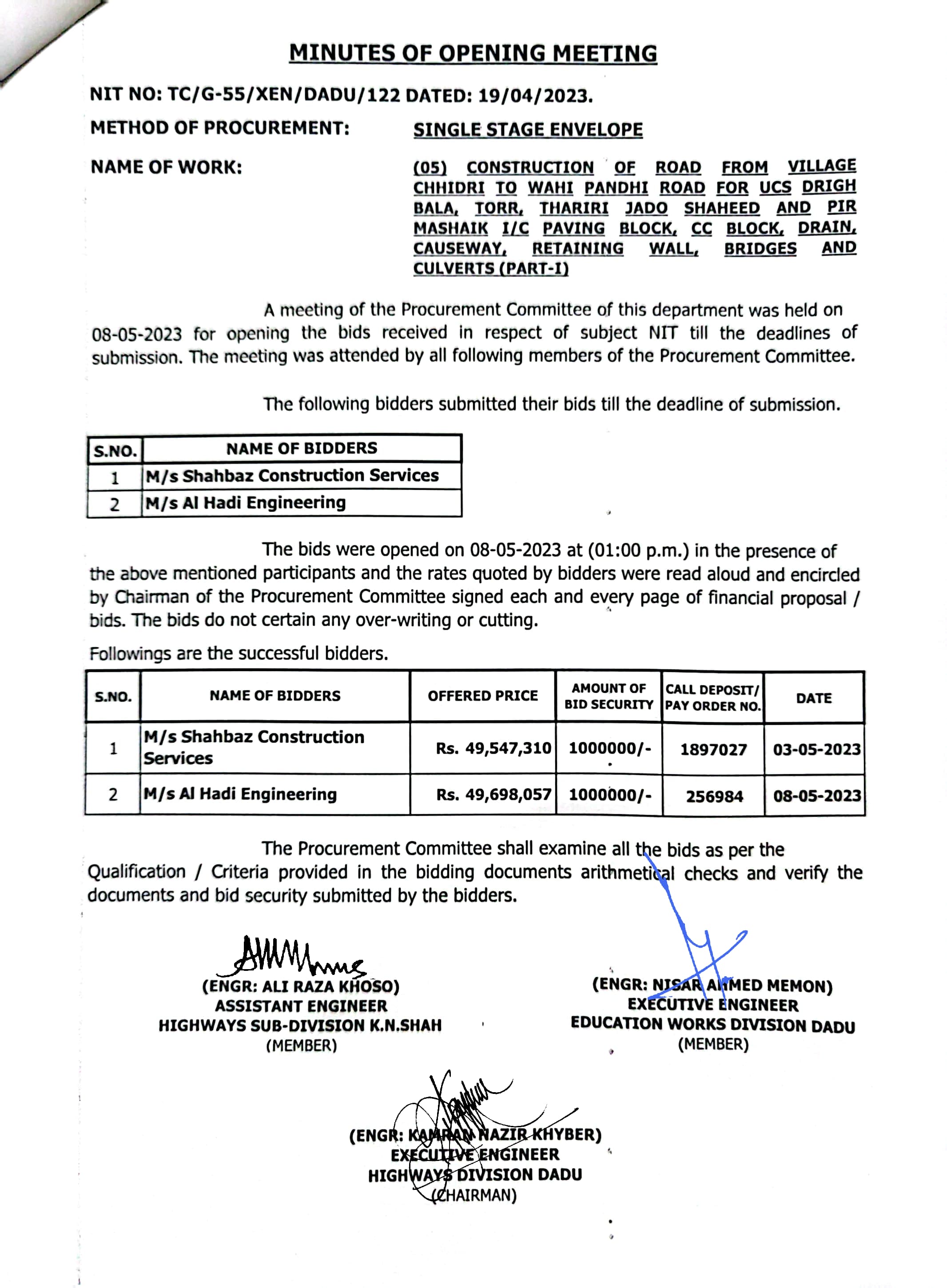 | T00537-22-0006 | BE00537-22-0006-5 | (05) CONSTRUCTION OF ROAD FROM VILLAGE CHHIDRI TO WAHI PANDHI ROAD FOR UCS DRIGH BALA, TORR, THARIRI JADO SHAHEED AND PIR MASHAIK I/C PAVING BLOCK, CC BLOCK, DRAIN, CAUSEWAY, RETAINING WALL, BRIDGES AND CULVERTS (PART-I) | Executive Engineer Highway Division Dadu (51-Works and Services Department) | 10-05-2023 | Dadu | Active |