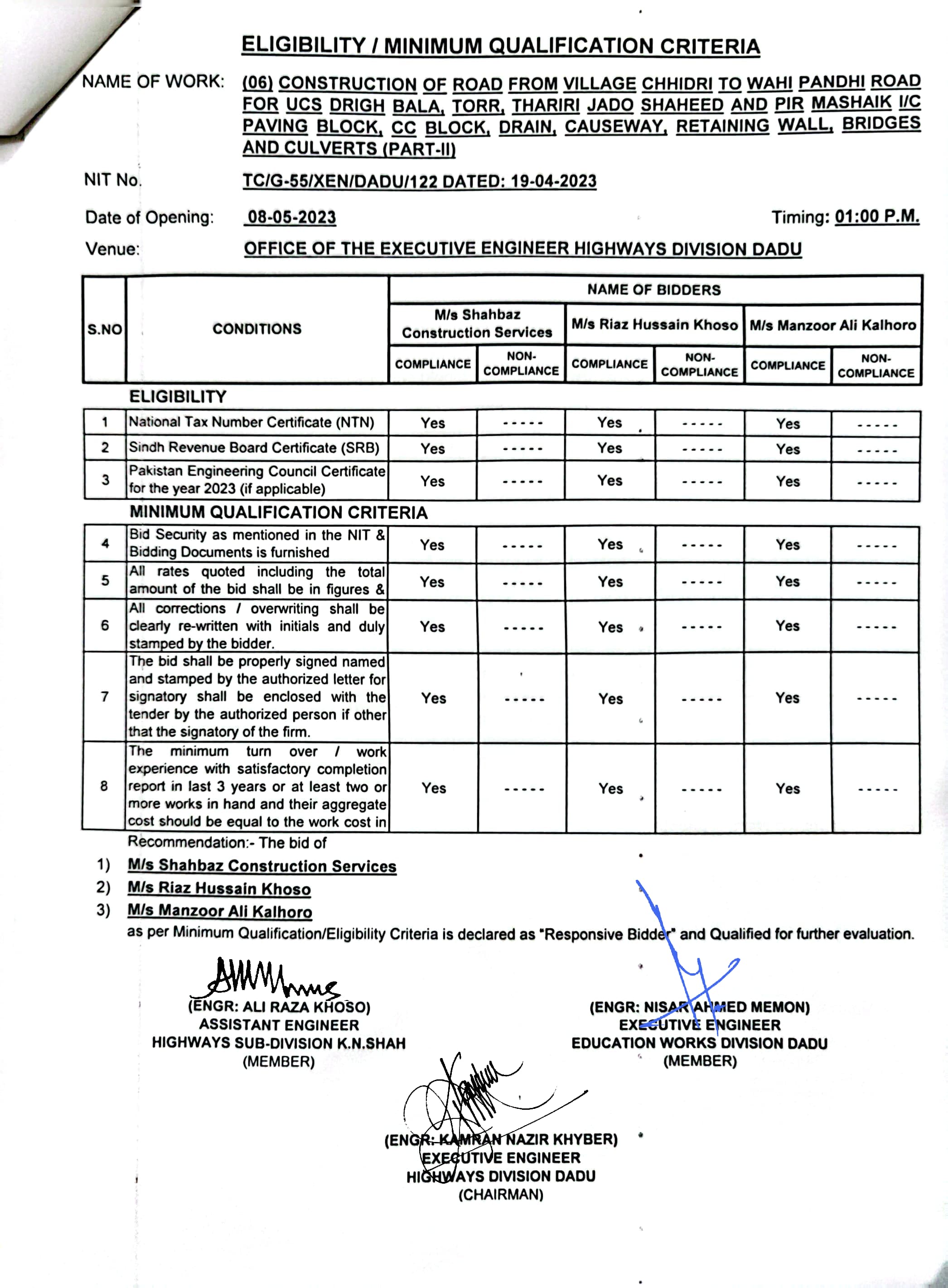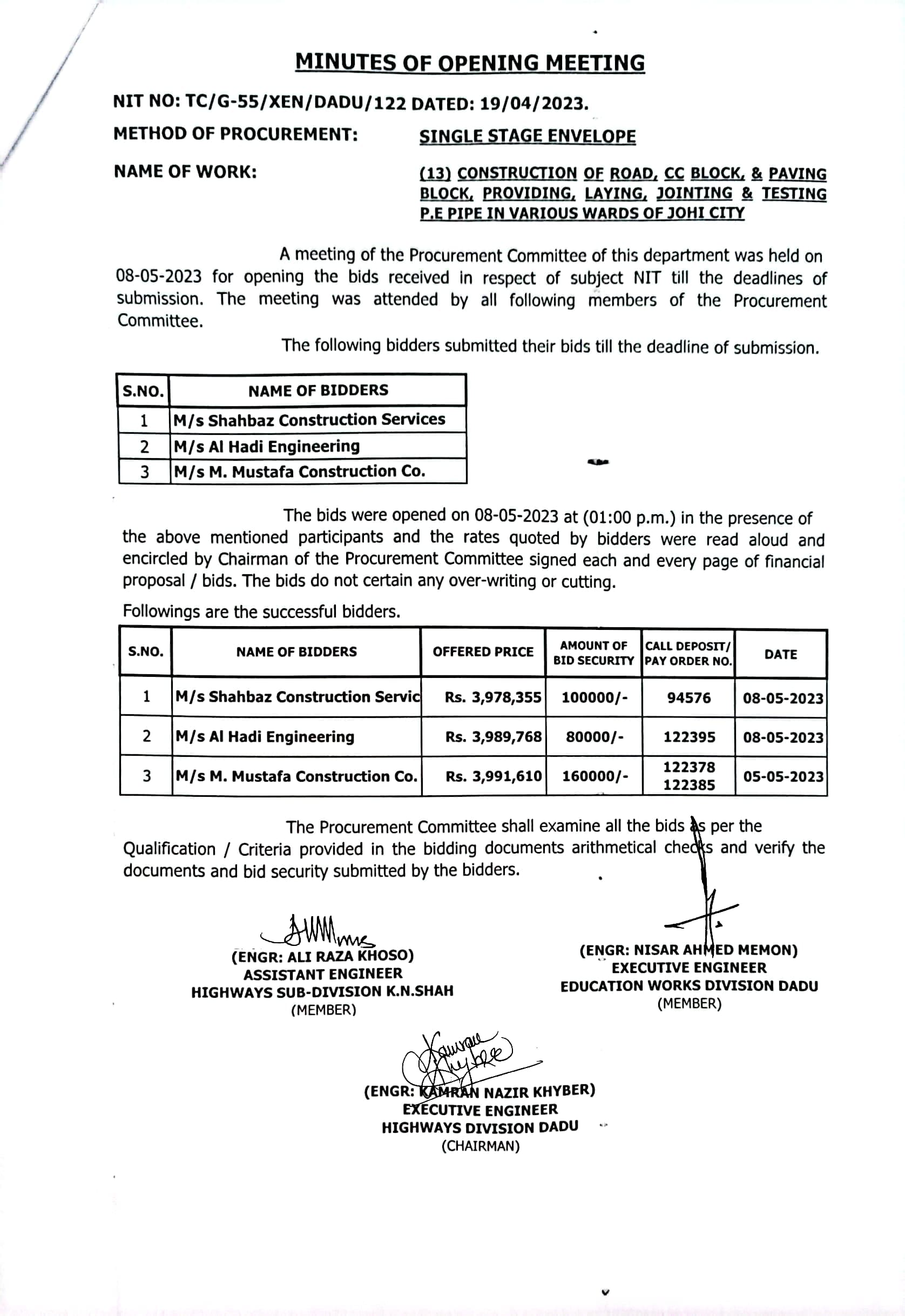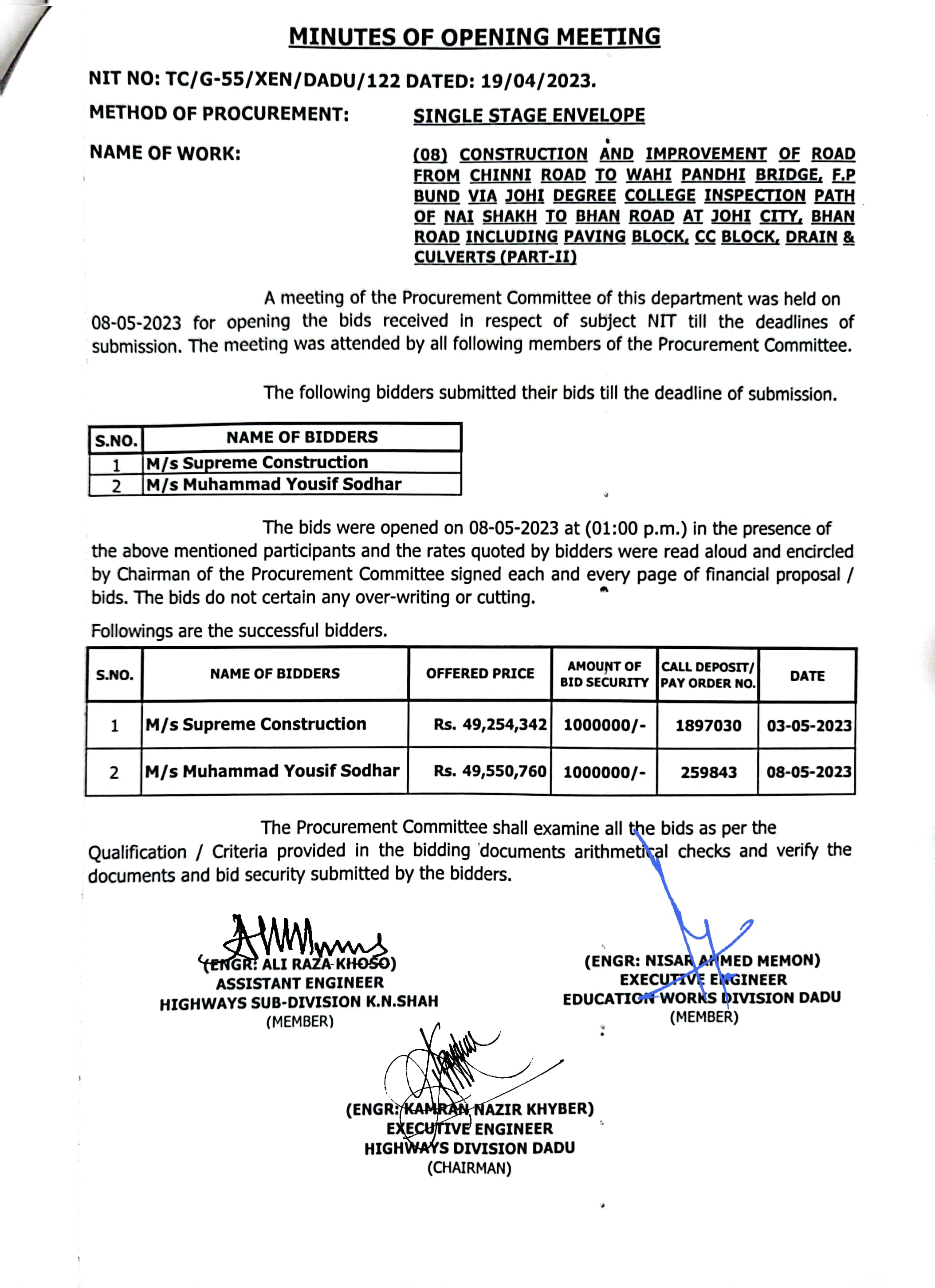 | T00537-22-0006 | BE00537-22-0006-5 | (05) CONSTRUCTION OF ROAD FROM VILLAGE CHHIDRI TO WAHI PANDHI ROAD FOR UCS DRIGH BALA, TORR, THARIRI JADO SHAHEED AND PIR MASHAIK I/C PAVING BLOCK, CC BLOCK, DRAIN, CAUSEWAY, RETAINING WALL, BRIDGES AND CULVERTS (PART-I) | Executive Engineer Highway Division Dadu (51-Works and Services Department) | 10-05-2023 | Dadu | Active |