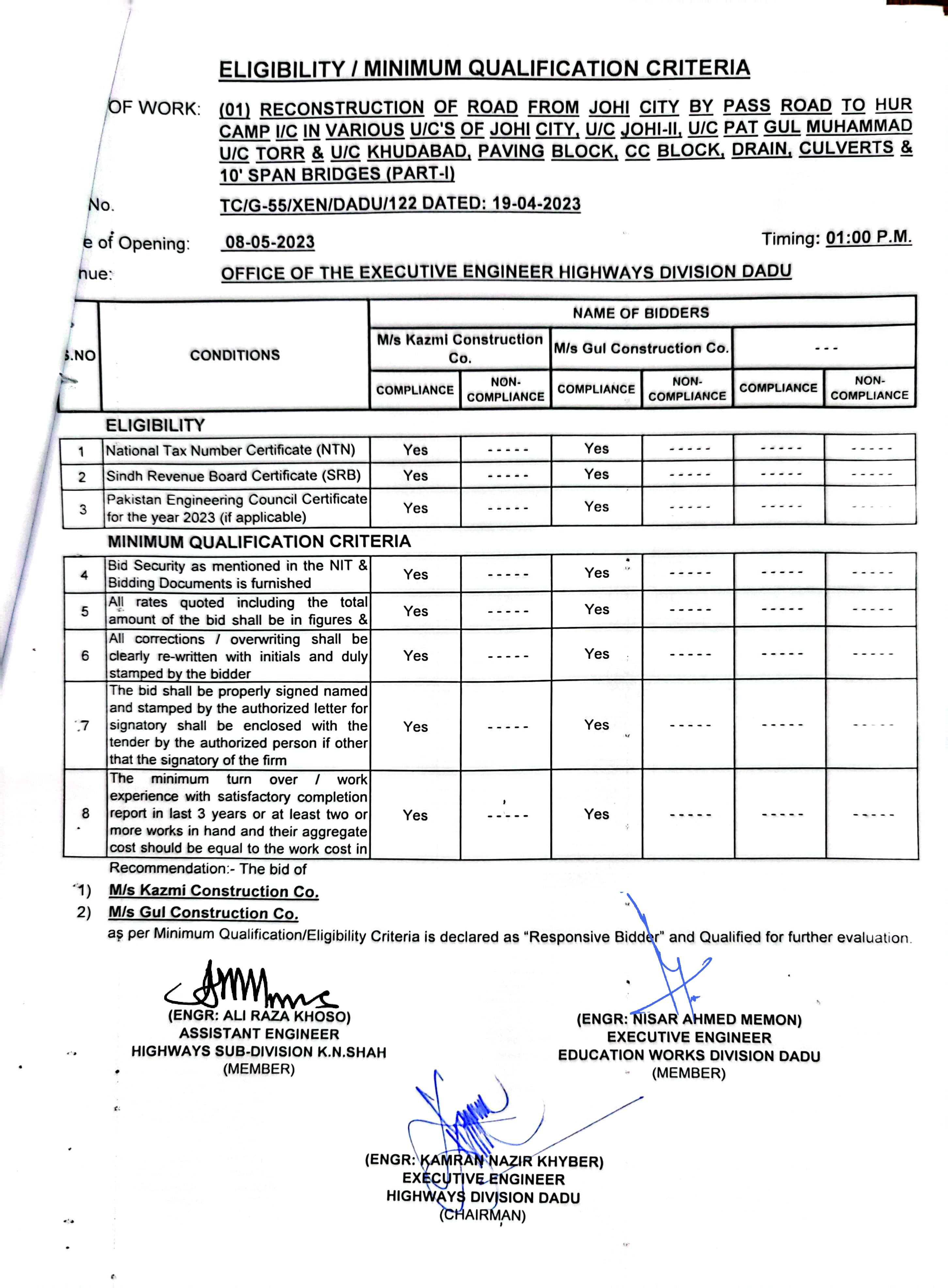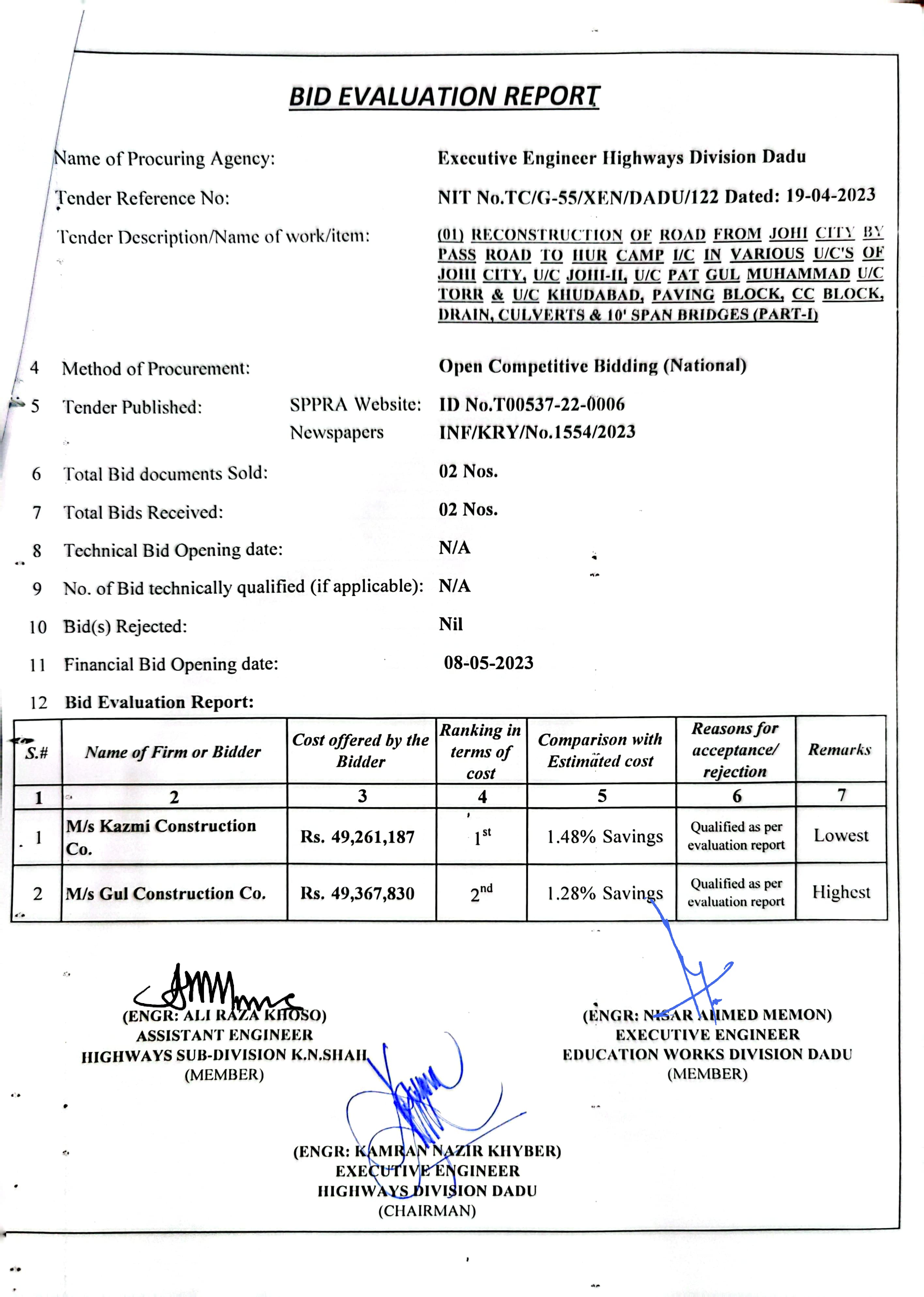 | T00537-22-0006 | BE00537-22-0006-1 | 1 (01) RECONSTRUCTION OF ROAD FROM JOHI CITY BY PASS ROAD TO HUR CAMP I/C IN VARIOUS U/C'S OF JOHI CITY, U/C JOHI-II, U/C PAT GUL MUHAMMAD U/C TORR & U/C KHUDABAD, PAVING BLOCK, CC BLOCK, DRAIN, CULVERTS & 10' SPAN BRIDGES (PART-I). | Executive Engineer Highway Division Dadu (51-Works and Services Department) | 10-05-2023 | Dadu | Active |