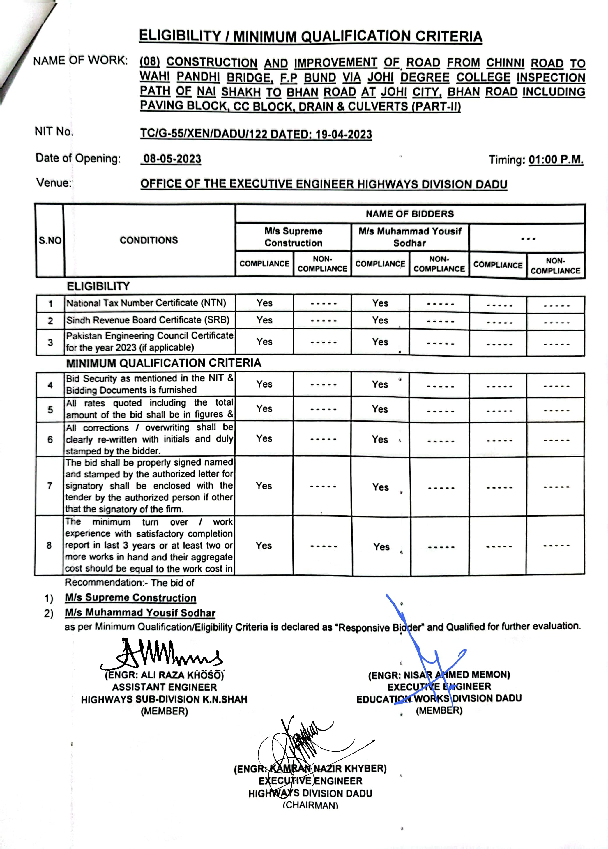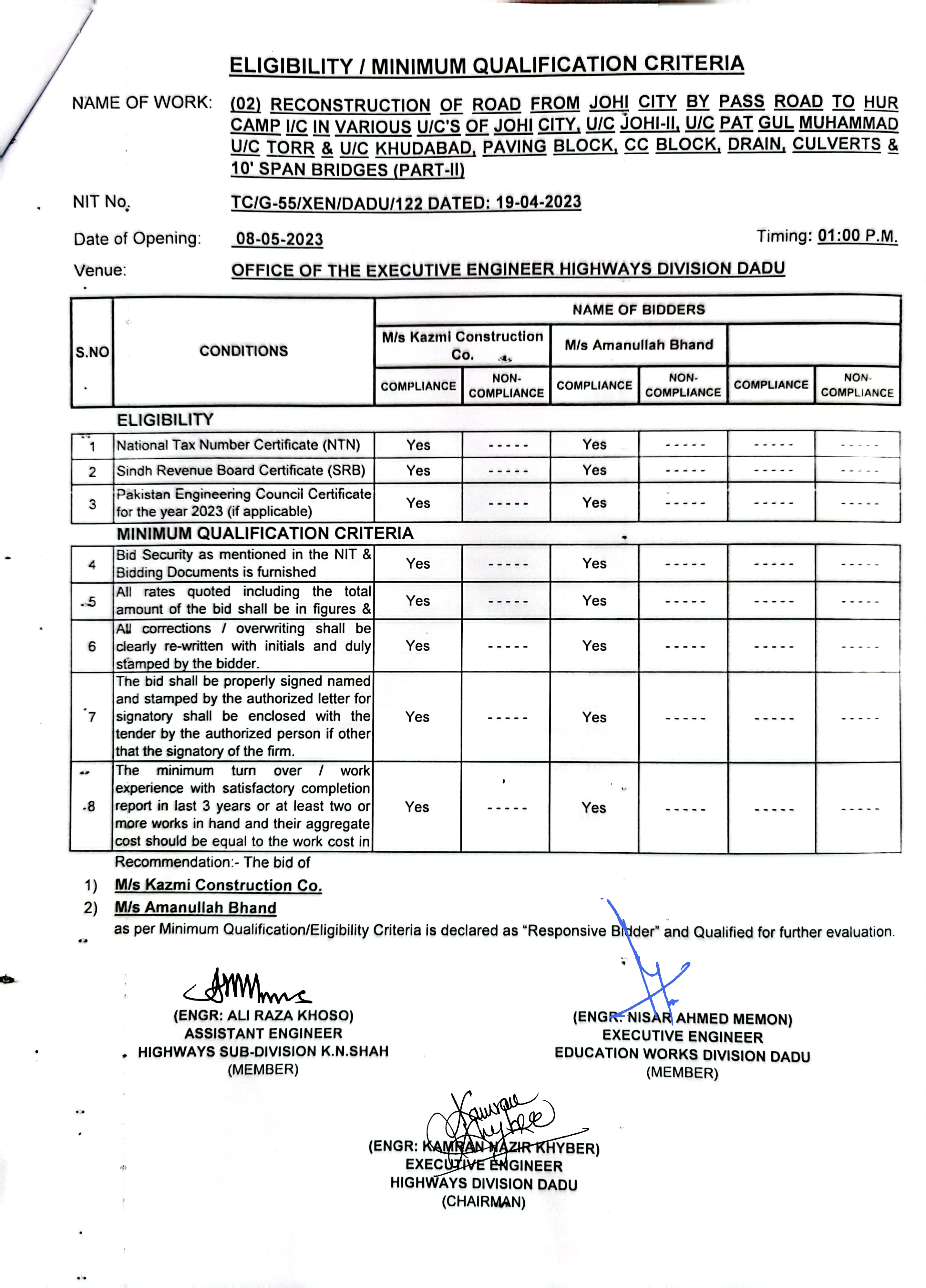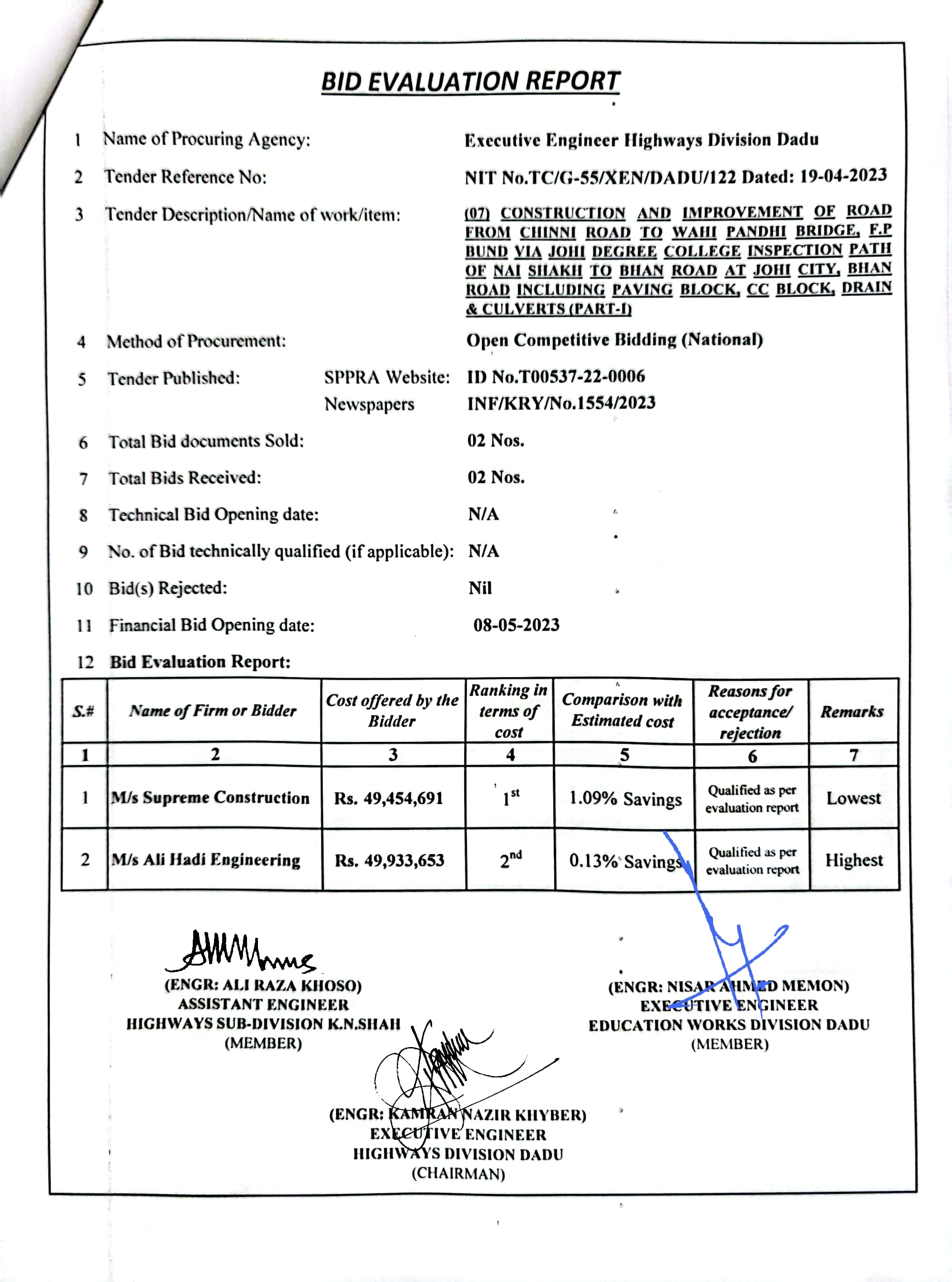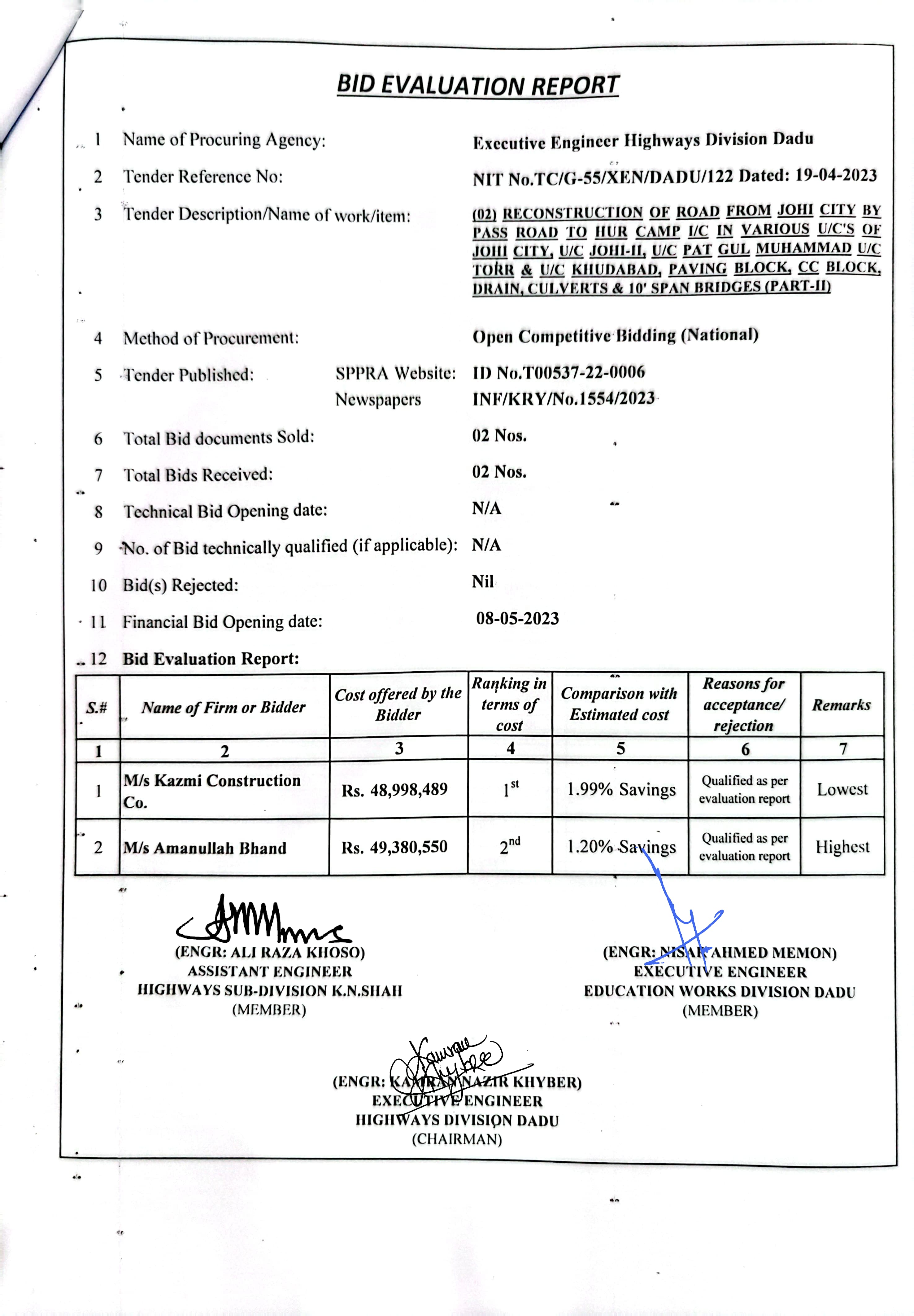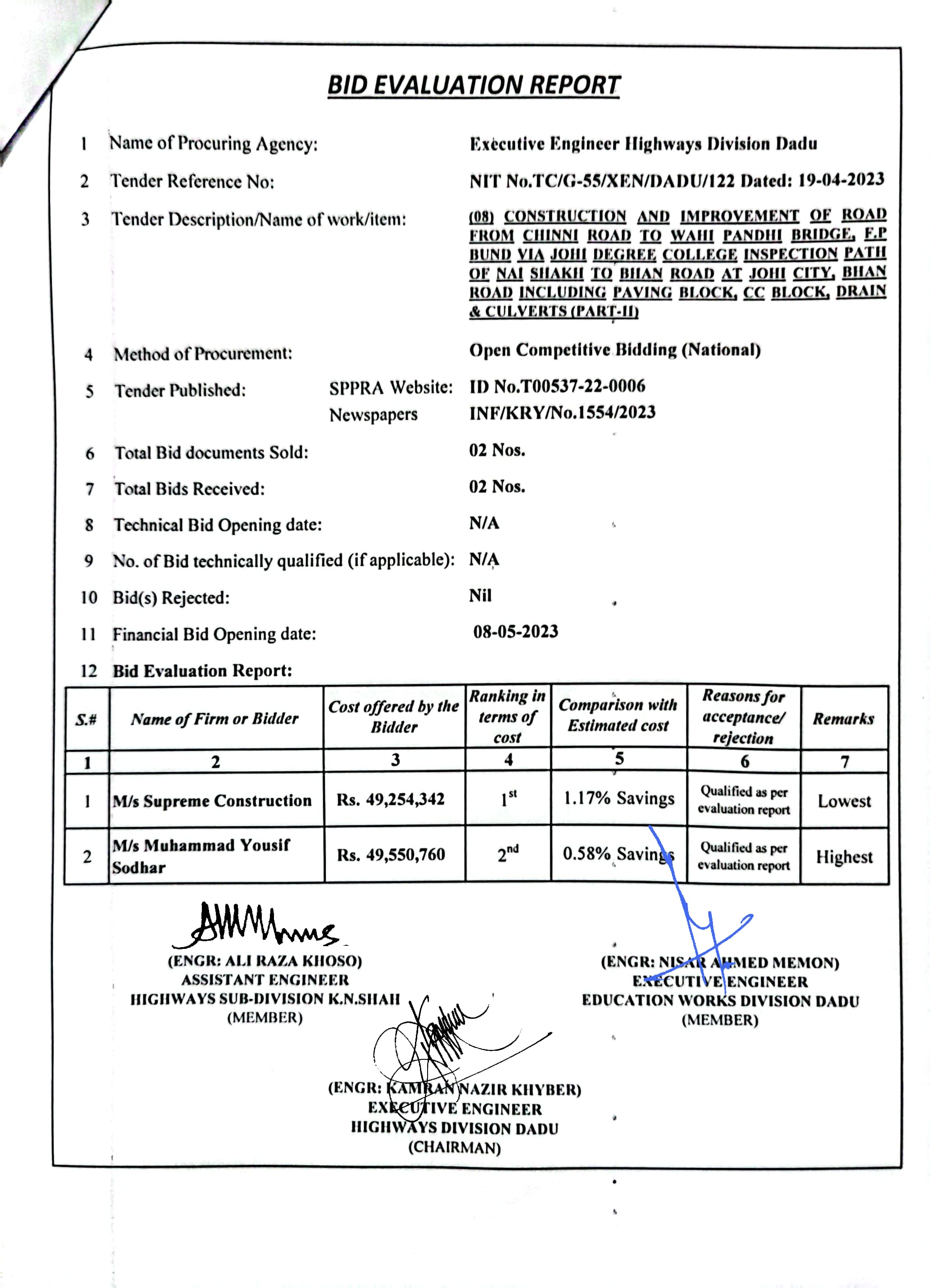 | T00537-22-0006 | BE00537-22-0006-8 | (08) CONSTRUCTION AND IMPROVEMENT OF ROAD FROM CHINNI ROAD TO WAHI PANDHI BRIDGE, F.P BUND VIA JOHI DEGREE COLLEGE INSPECTION PATH OF NAI SHAKH TO BHAN ROAD AT JOHI CITY, BHAN ROAD INCLUDING PAVING BLOCK, CC BLOCK, DRAIN & CULVERTS (PART-II) | Executive Engineer Highway Division Dadu (51-Works and Services Department) | 10-05-2023 | Dadu | Active |