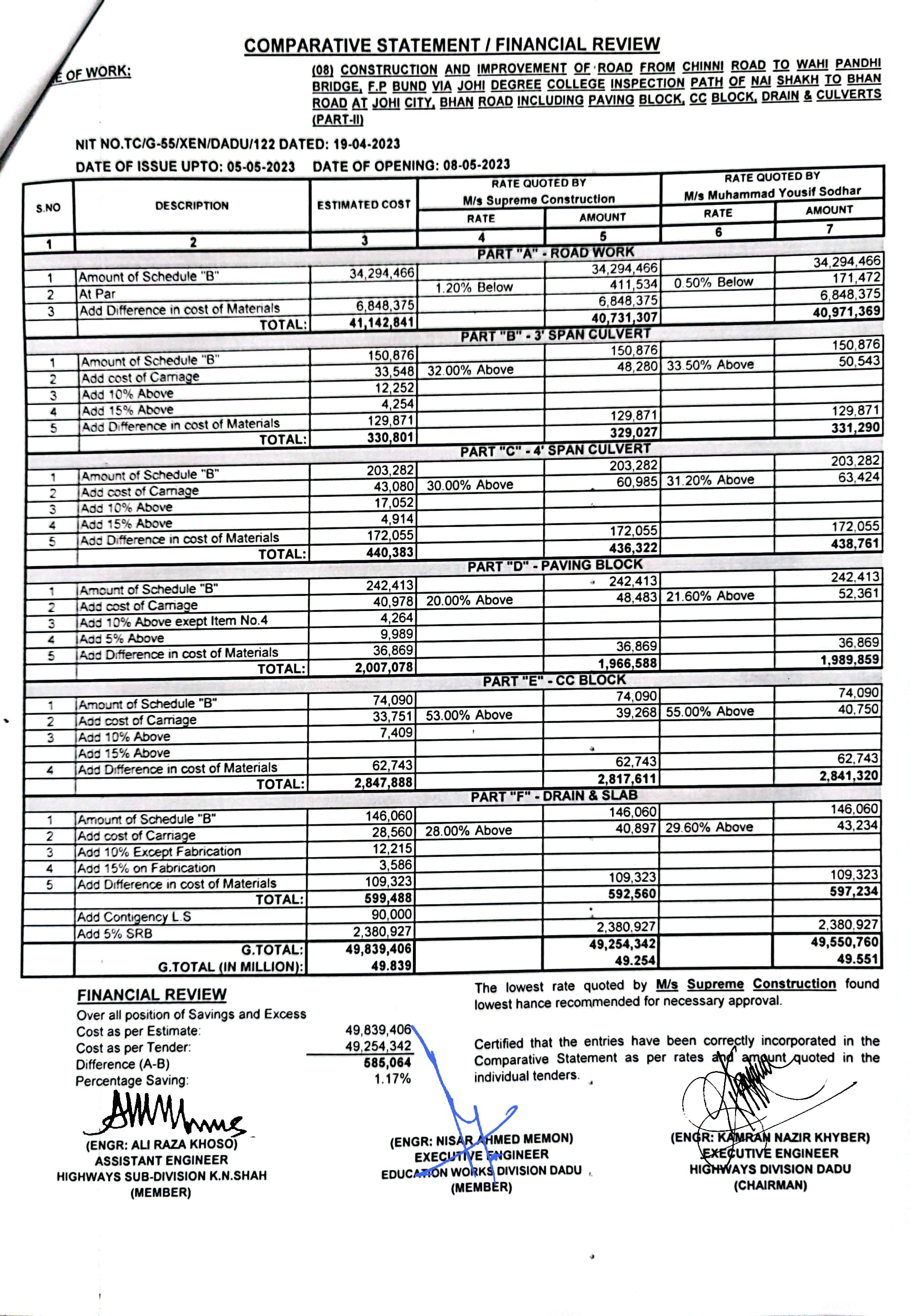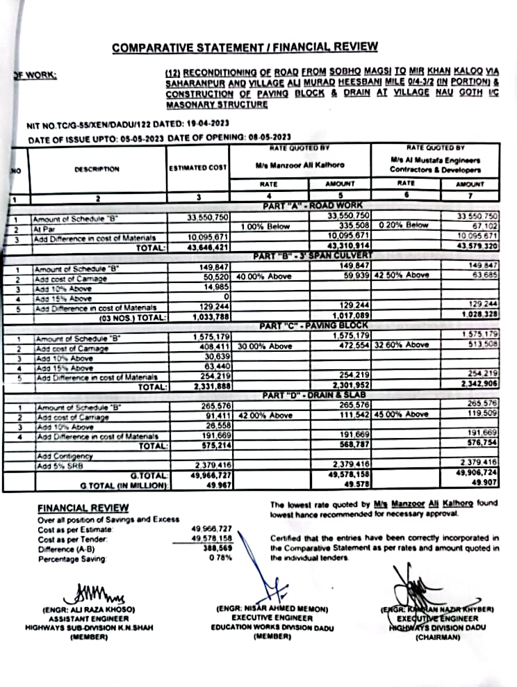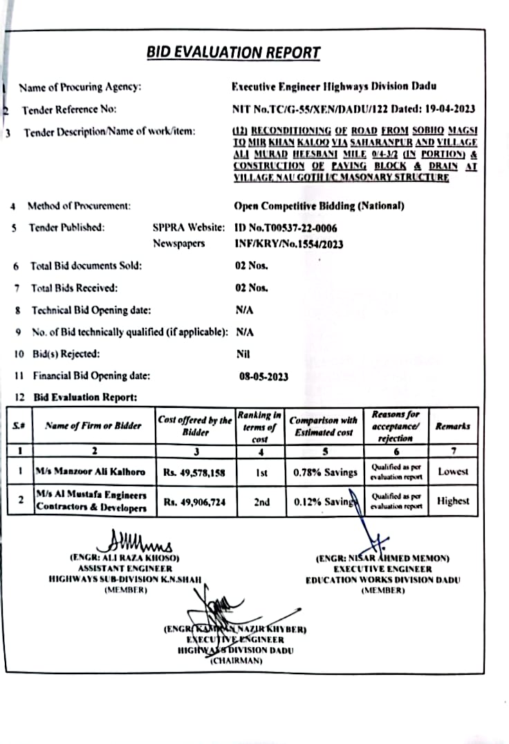 | T00537-22-0006 | BE00537-22-0006-7 | (07) CONSTRUCTION AND IMPROVEMENT OF ROAD FROM CHINNI ROAD TO WAHI PANDHI BRIDGE, F.P BUND VIA JOHI DEGREE COLLEGE INSPECTION PATH OF NAI SHAKH TO BHAN ROAD AT JOHI CITY, BHAN ROAD INCLUDING PAVING BLOCK, CC BLOCK, DRAIN & CULVERTS (PART-I) | Executive Engineer Highway Division Dadu (51-Works and Services Department) | 10-05-2023 | Dadu | Active |