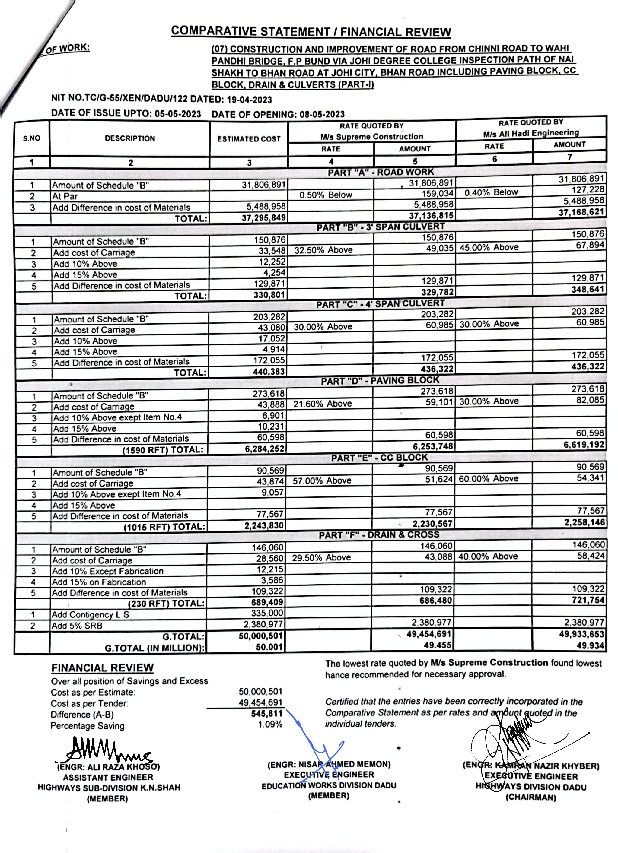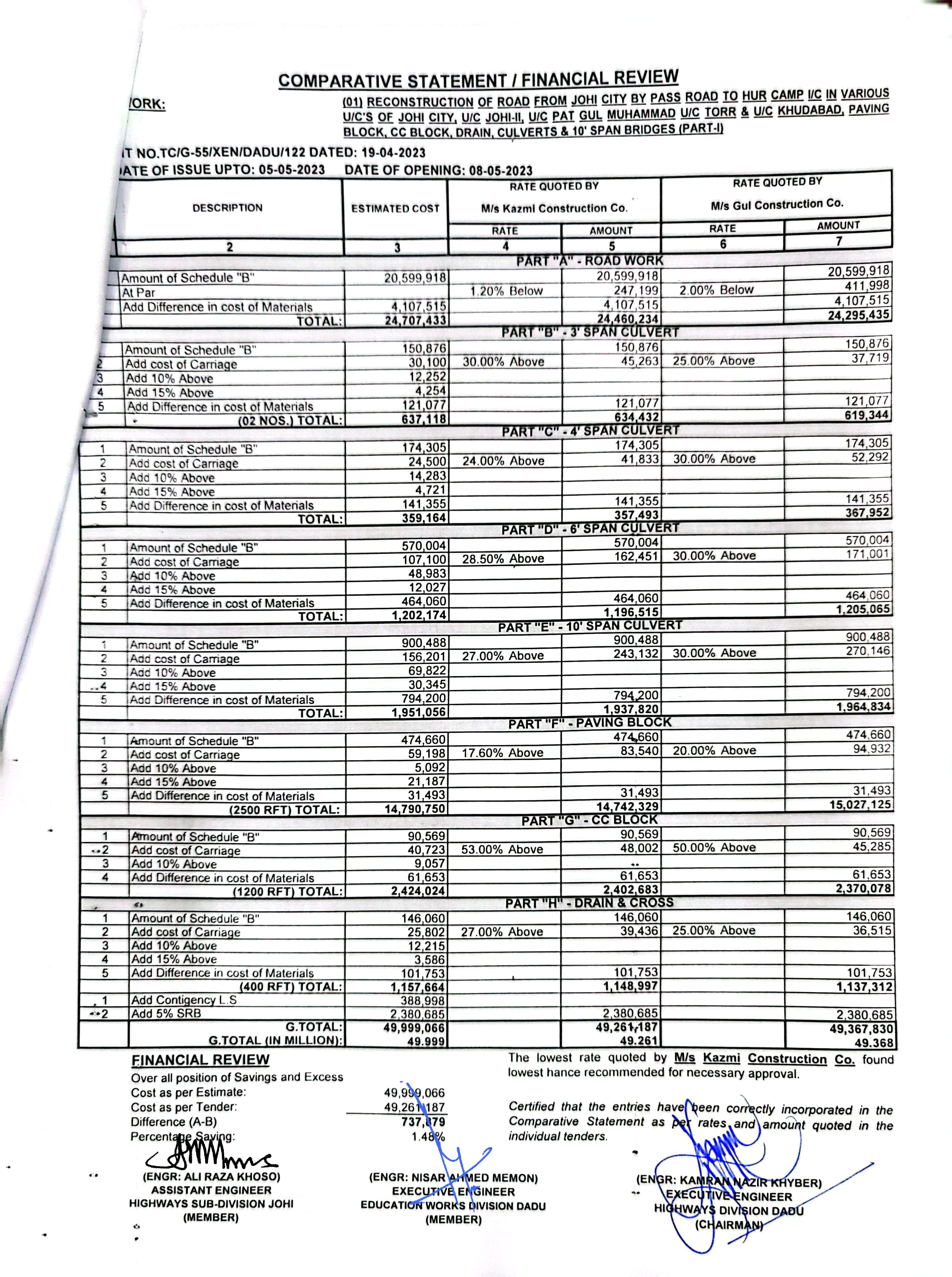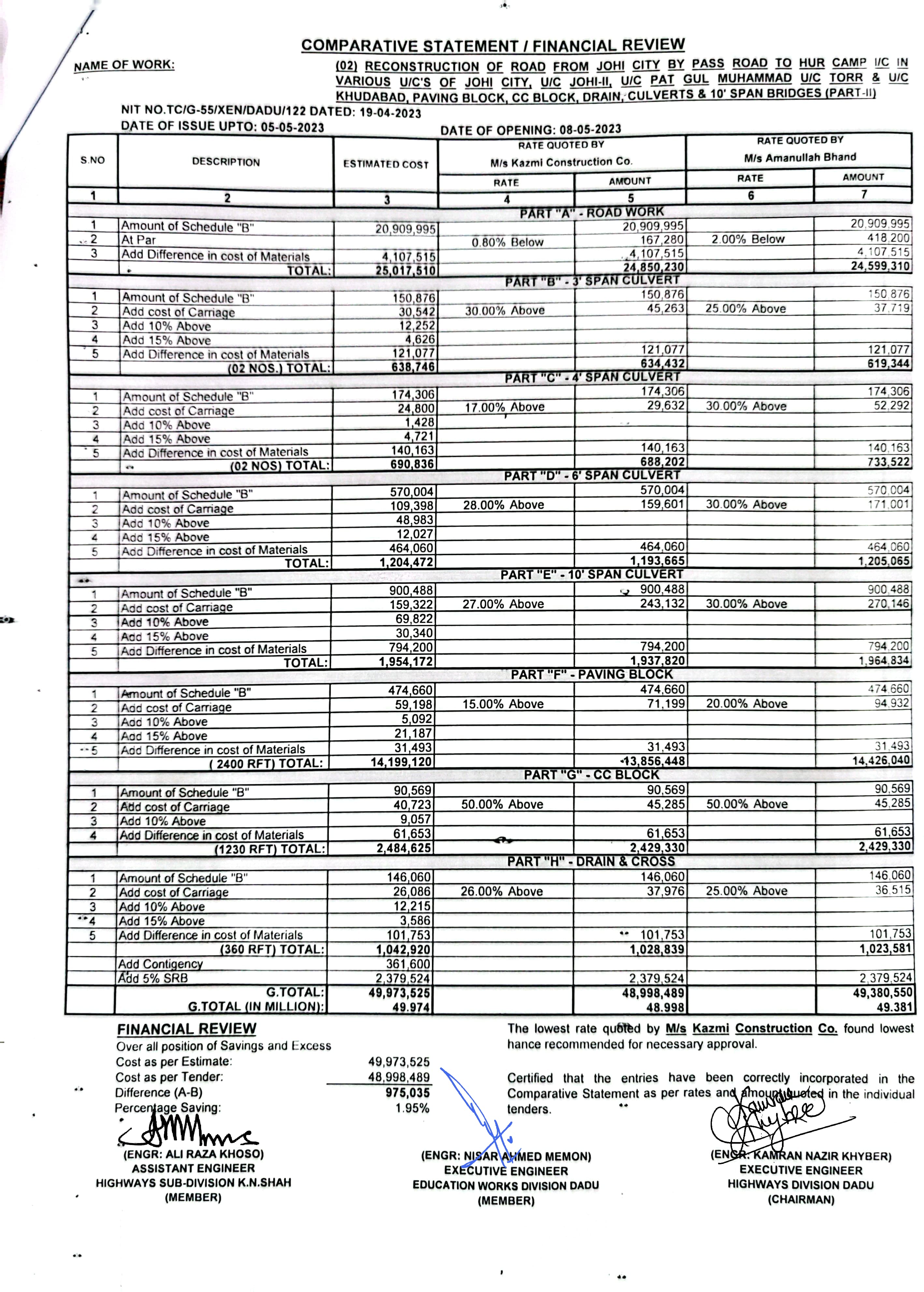 | T00537-22-0006 | BE00537-22-0006-7 | (07) CONSTRUCTION AND IMPROVEMENT OF ROAD FROM CHINNI ROAD TO WAHI PANDHI BRIDGE, F.P BUND VIA JOHI DEGREE COLLEGE INSPECTION PATH OF NAI SHAKH TO BHAN ROAD AT JOHI CITY, BHAN ROAD INCLUDING PAVING BLOCK, CC BLOCK, DRAIN & CULVERTS (PART-I) | Executive Engineer Highway Division Dadu (51-Works and Services Department) | 10-05-2023 | Dadu | Active |
