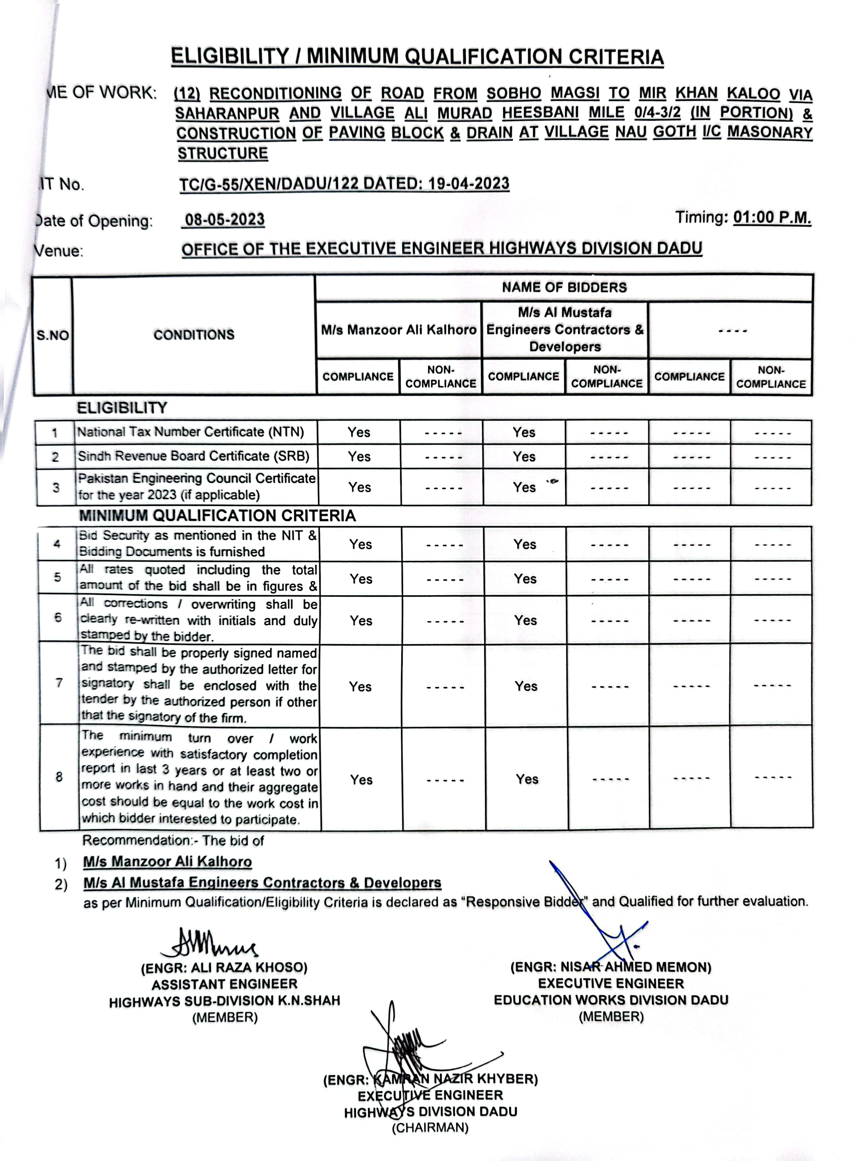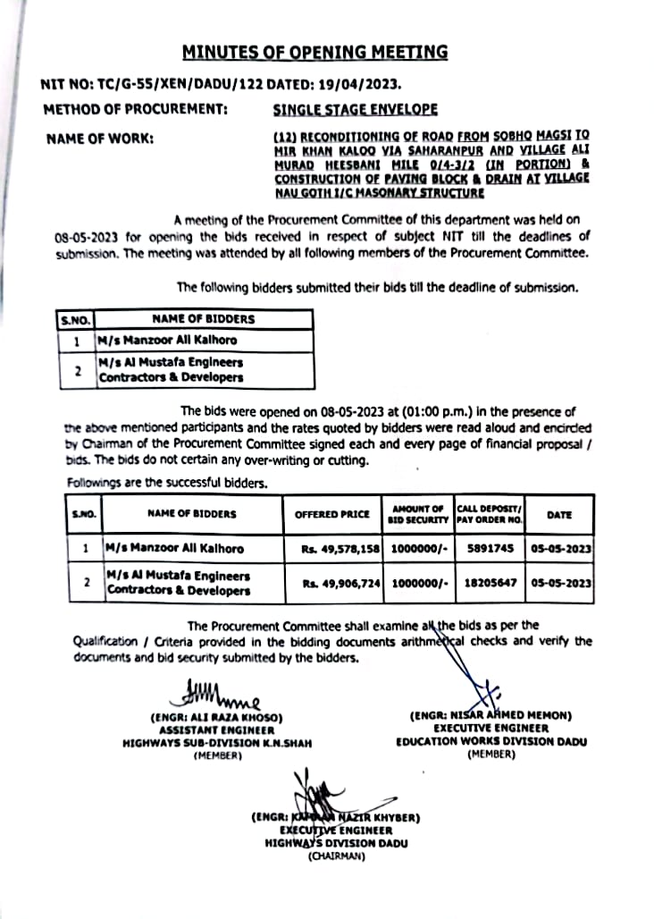 | T00537-22-0006 | BE00537-22-0006-12 | RECONDITIONING OF ROAD FROM SOBHO MAGSI TO MIR KHAN KALOO VIA SAHARANPUR AND VILLAGE ALI MURAD HEESBANI MILE 0/4- 3/2 (IN PORTION) & CONSTRUCTION OF PAVING BLOCK & DRAIN AT VILLAGE NAU GOTH I/C MASONARY STRUCTURE | Executive Engineer Highway Division Dadu (51-Works and Services Department) | 10-05-2023 | Dadu | Active |