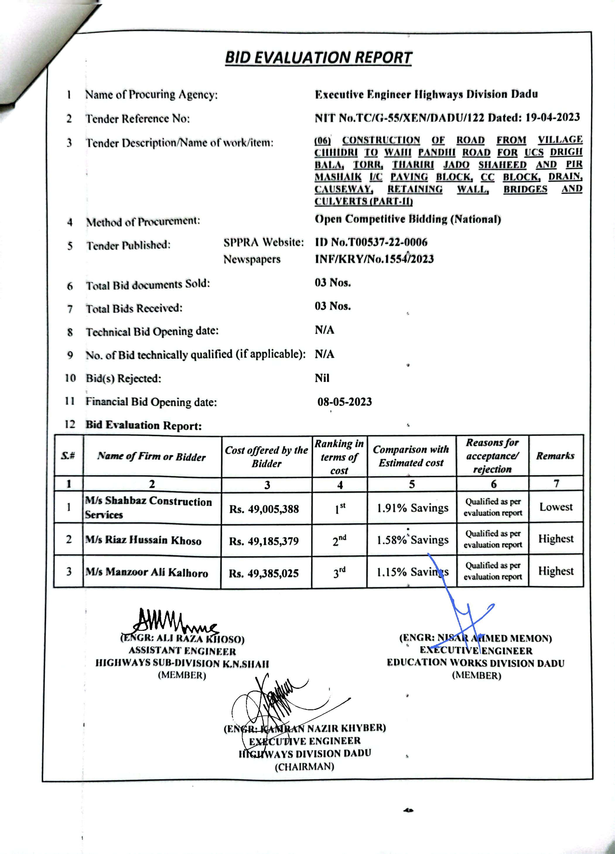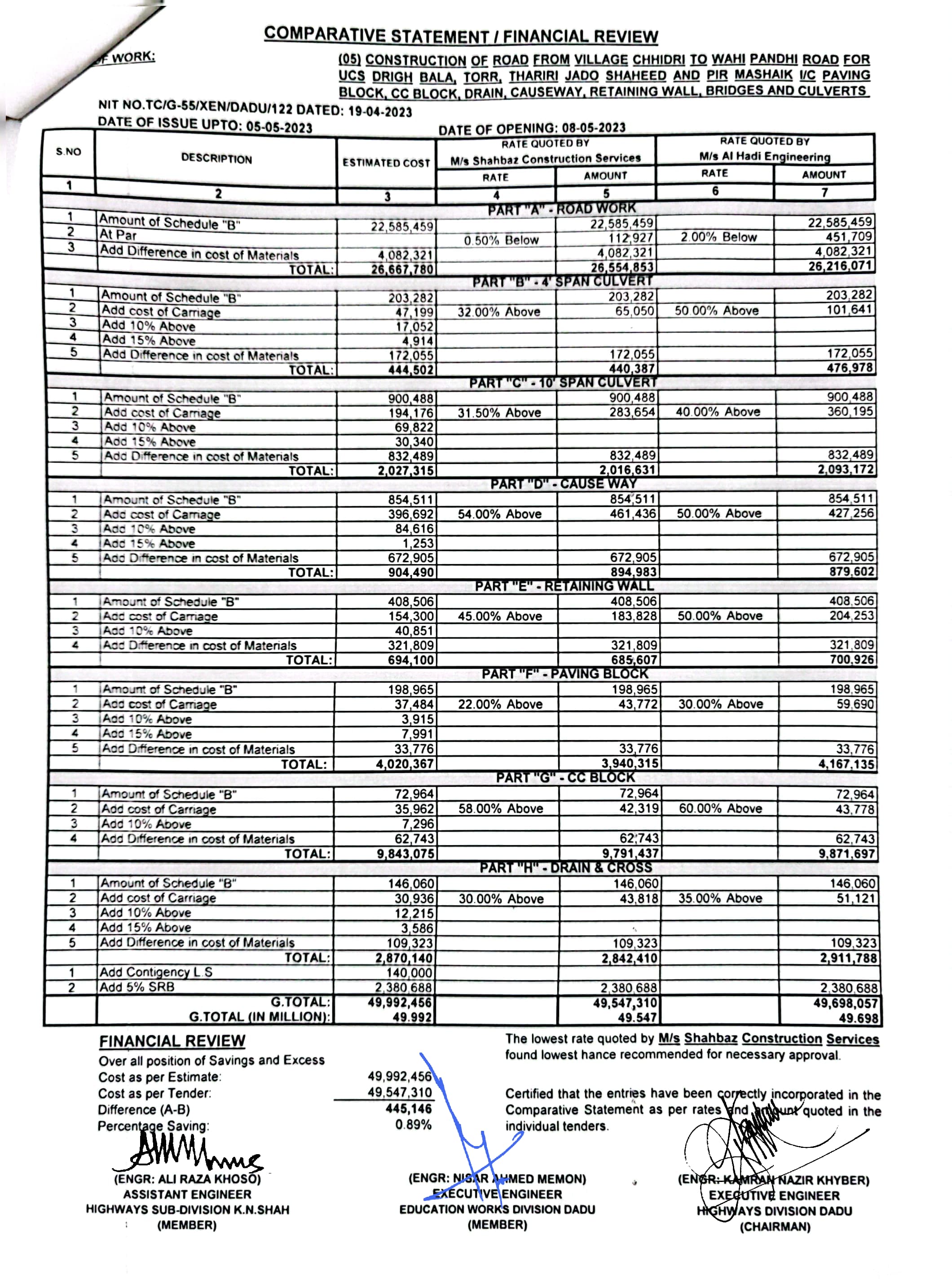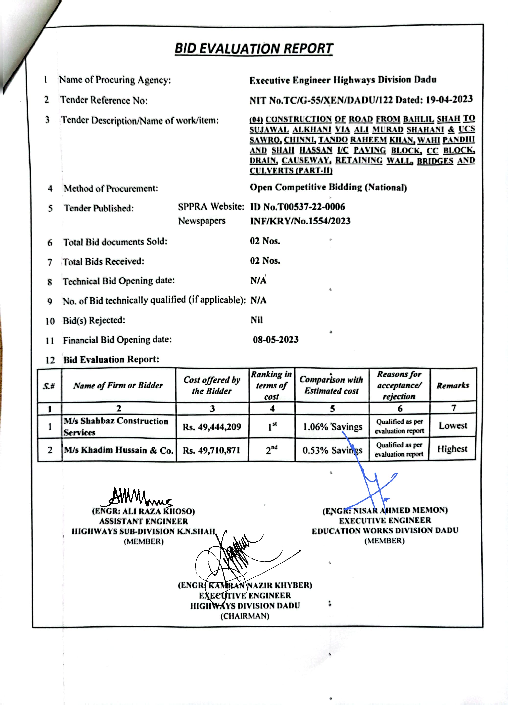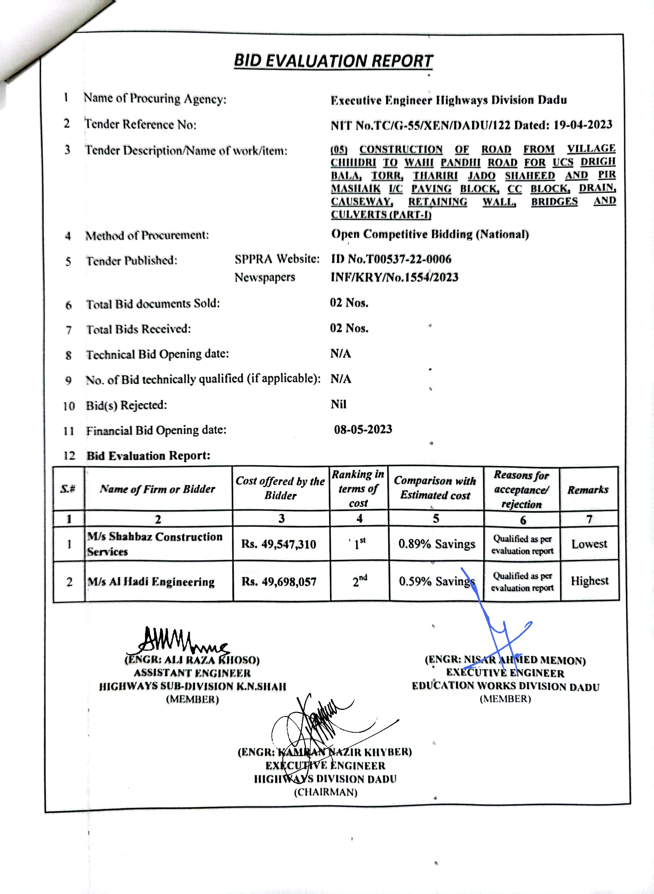 | T00537-22-0006 | BE00537-22-0006-4 | (04) CONSTRUCTION OF ROAD FROM BAHLIL SHAH TO SUJAWAL ALKHANI VIA ALI MURAD SHAHANI & UCS SAWRO, CHINNI, TANDO RAHEEM KHAN, WAHI PANDHI AND SHAH HASSAN I/C PAVING BLOCK, CC BLOCK, DRAIN, CAUSEWAY, RETAINING WALL, BRIDGES AND CULVERTS (PART-II) | Executive Engineer Highway Division Dadu (51-Works and Services Department) | 10-05-2023 | Dadu | Active |
