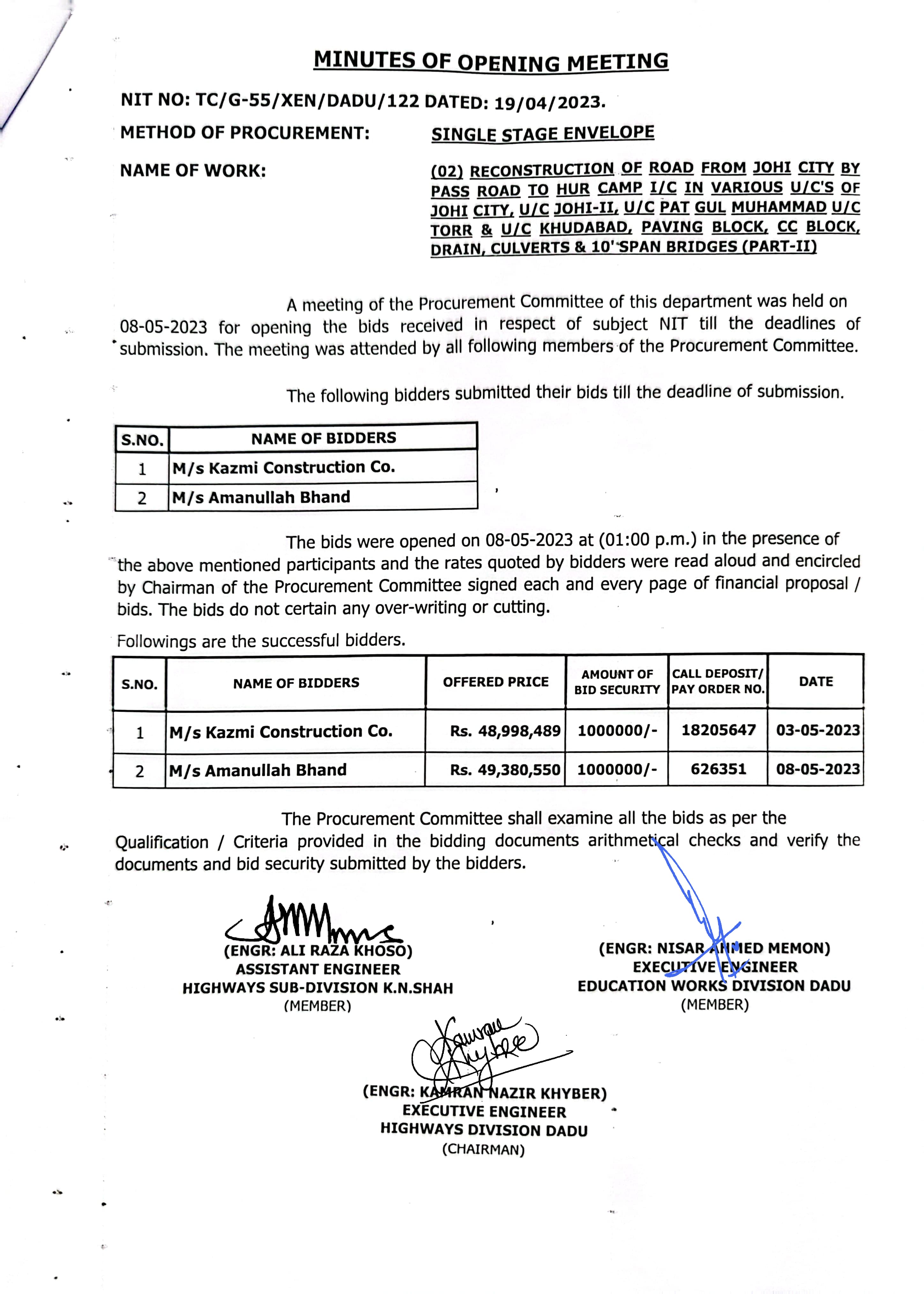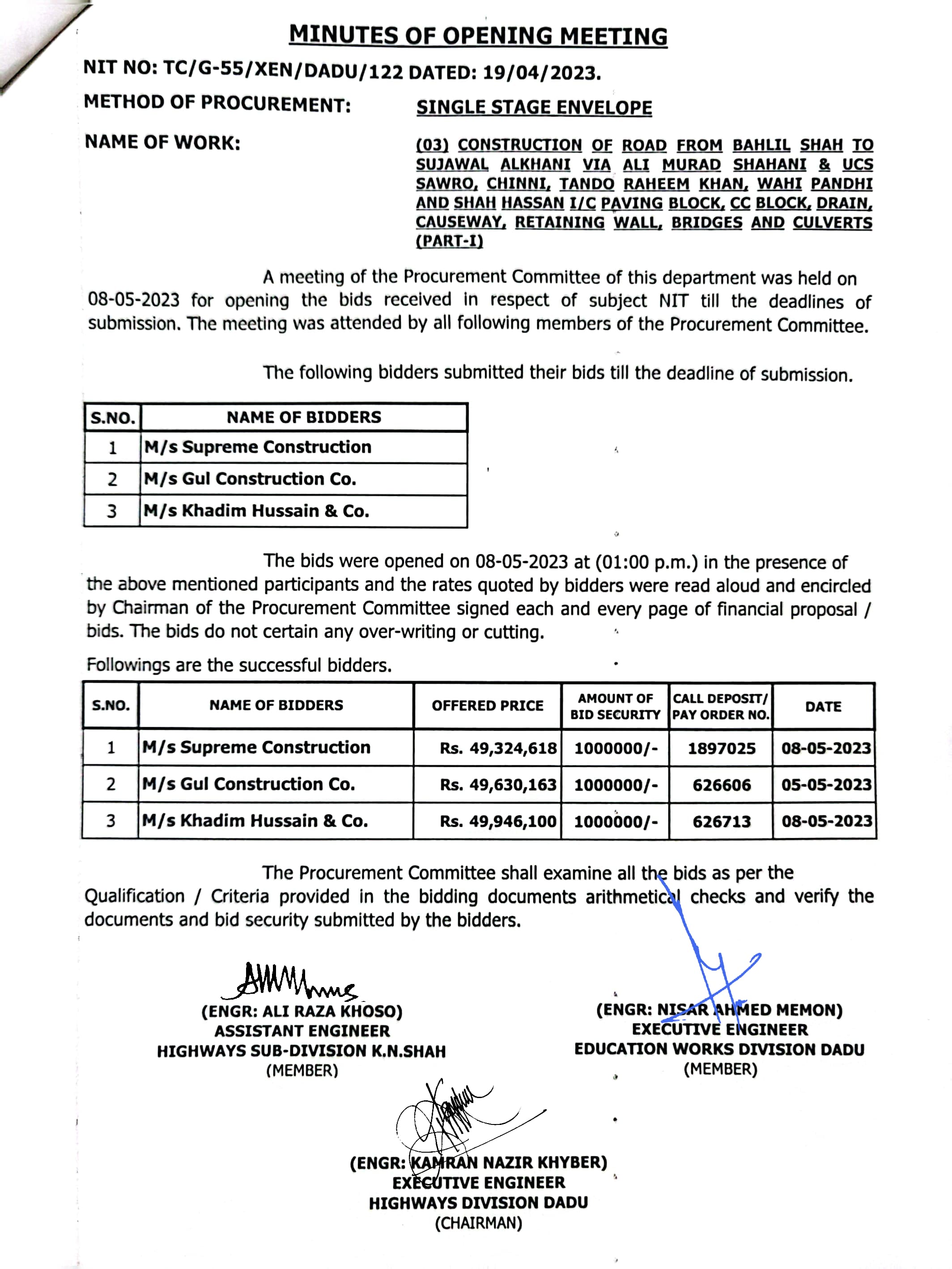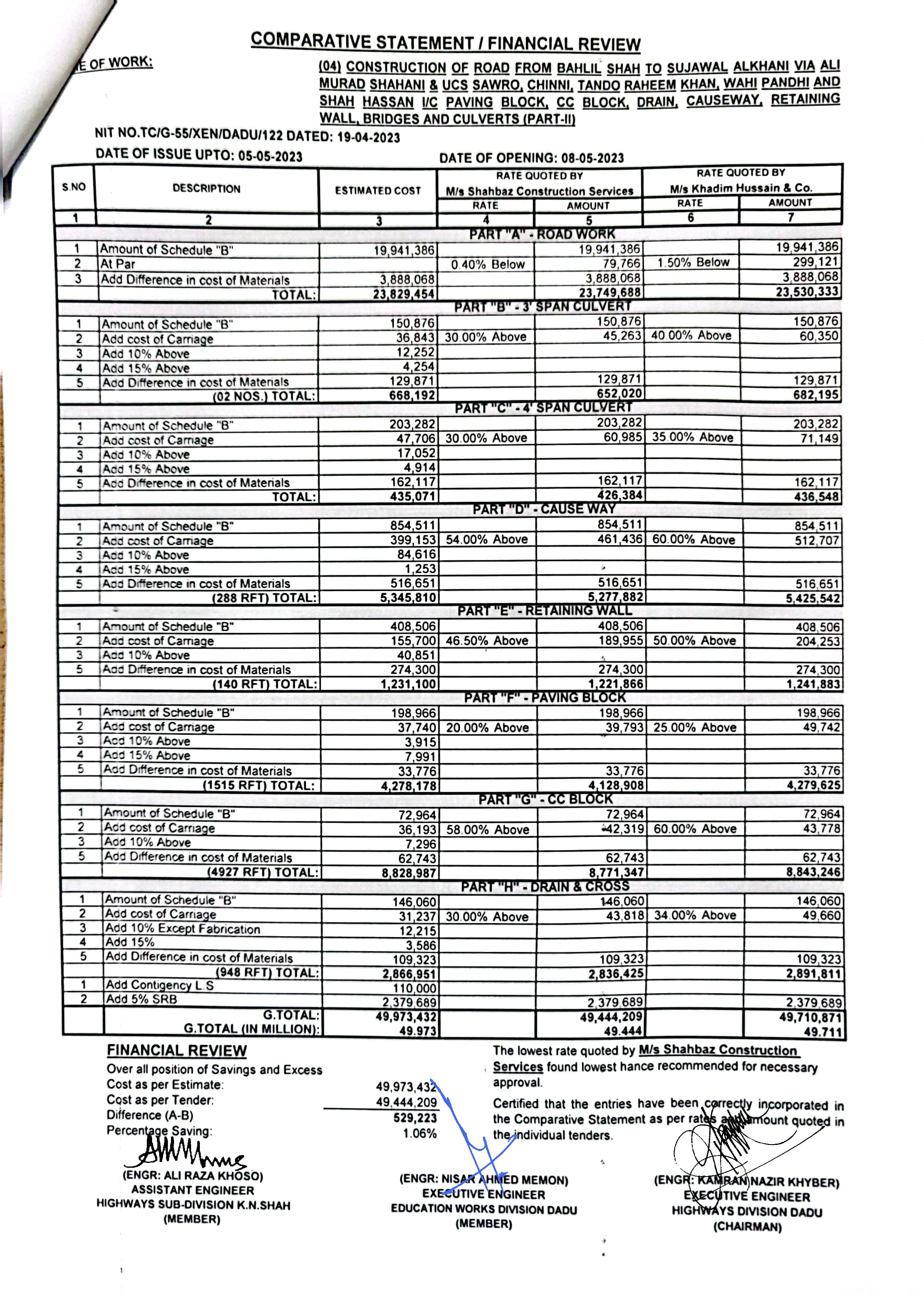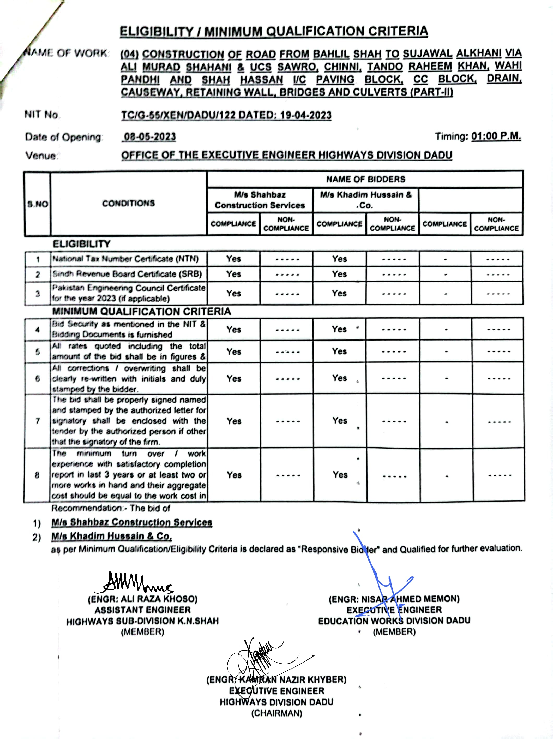 | T00537-22-0006 | BE00537-22-0006-4 | (04) CONSTRUCTION OF ROAD FROM BAHLIL SHAH TO SUJAWAL ALKHANI VIA ALI MURAD SHAHANI & UCS SAWRO, CHINNI, TANDO RAHEEM KHAN, WAHI PANDHI AND SHAH HASSAN I/C PAVING BLOCK, CC BLOCK, DRAIN, CAUSEWAY, RETAINING WALL, BRIDGES AND CULVERTS (PART-II) | Executive Engineer Highway Division Dadu (51-Works and Services Department) | 10-05-2023 | Dadu | Active |