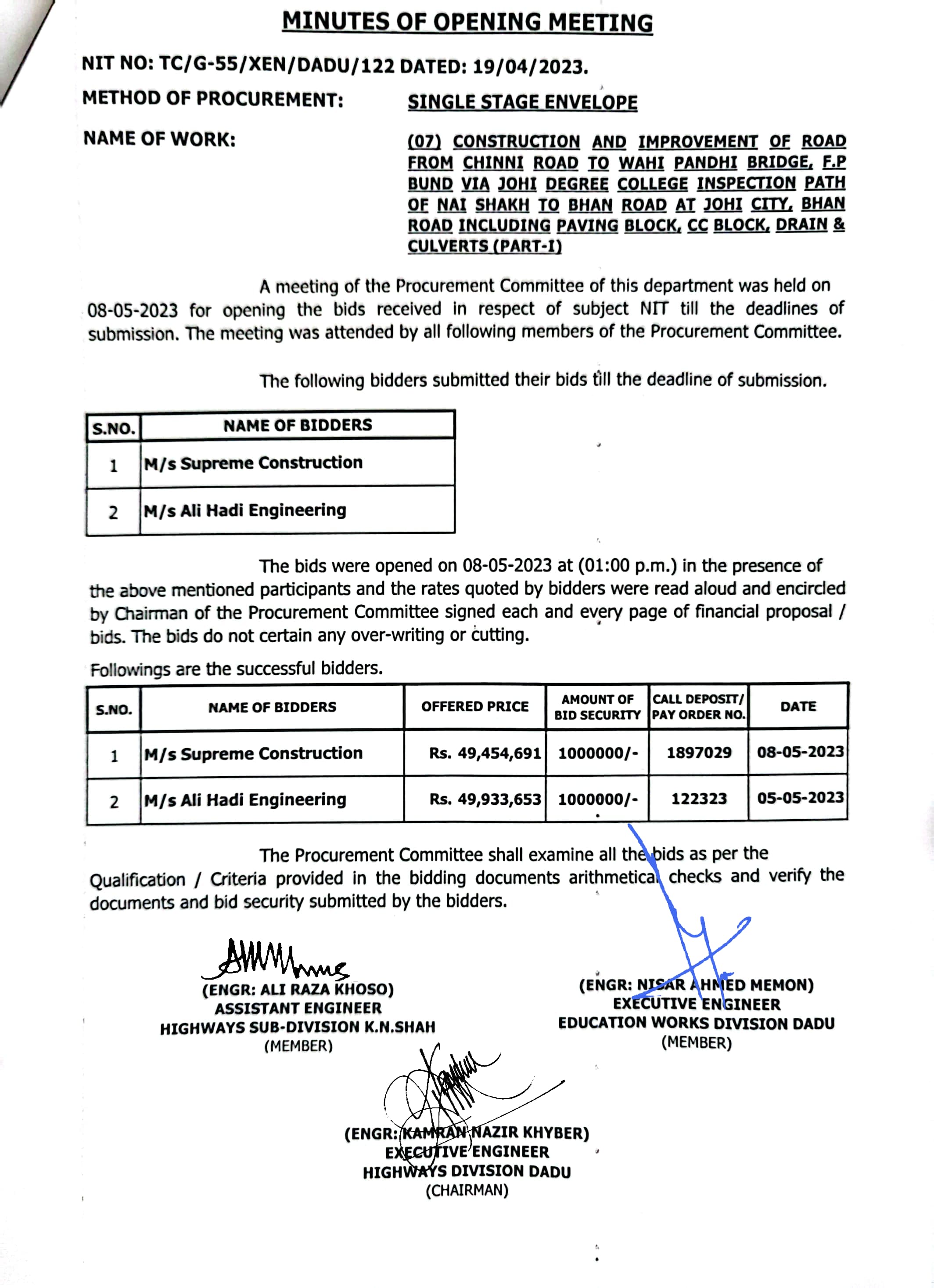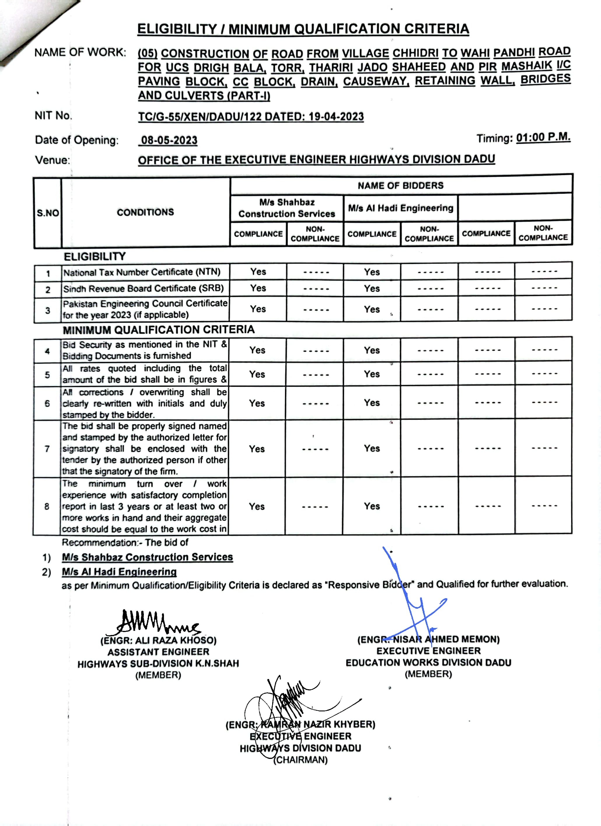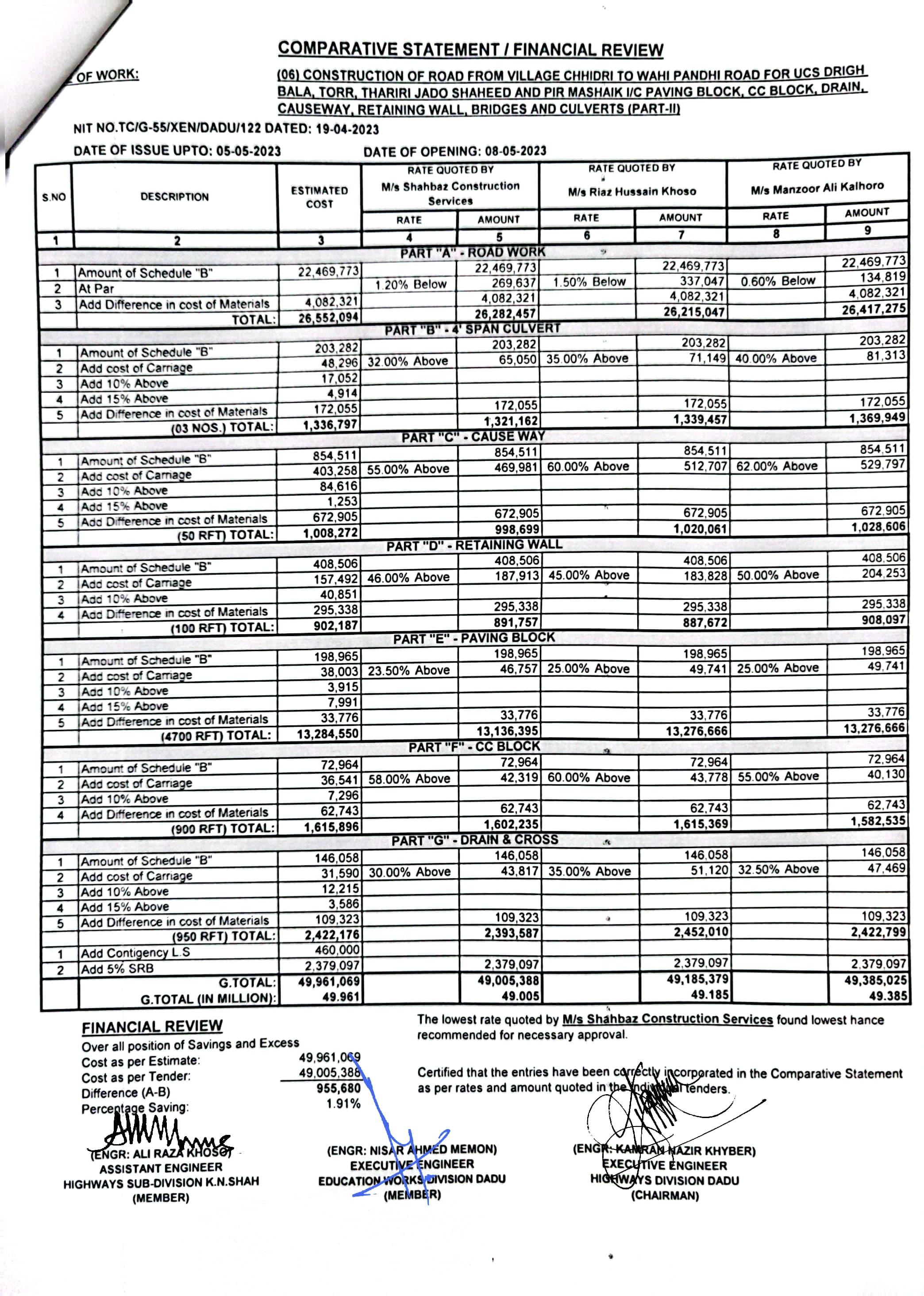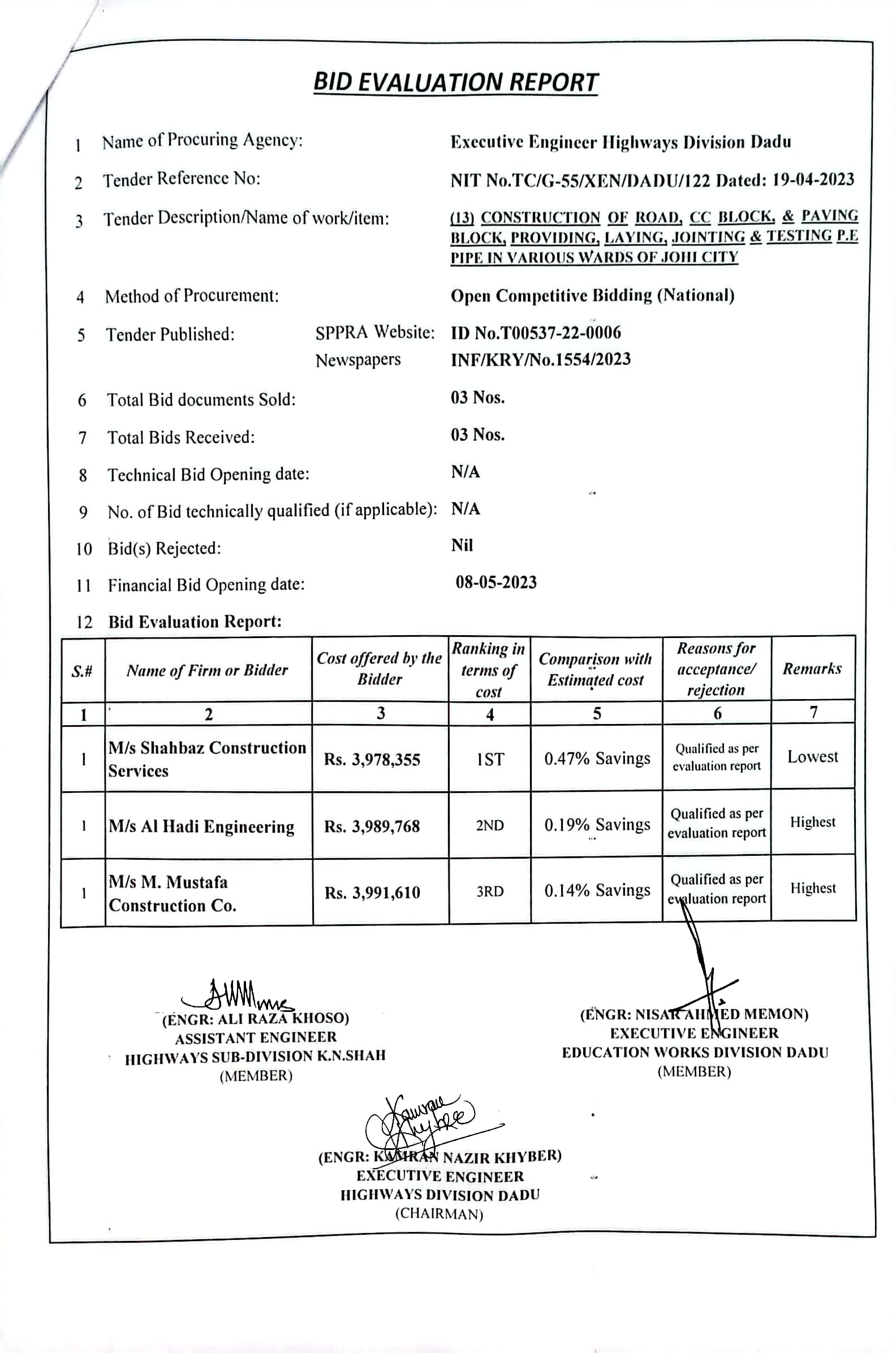 | T00537-22-0006 | BE00537-22-0006-4 | (04) CONSTRUCTION OF ROAD FROM BAHLIL SHAH TO SUJAWAL ALKHANI VIA ALI MURAD SHAHANI & UCS SAWRO, CHINNI, TANDO RAHEEM KHAN, WAHI PANDHI AND SHAH HASSAN I/C PAVING BLOCK, CC BLOCK, DRAIN, CAUSEWAY, RETAINING WALL, BRIDGES AND CULVERTS (PART-II) | Executive Engineer Highway Division Dadu (51-Works and Services Department) | 10-05-2023 | Dadu | Active |