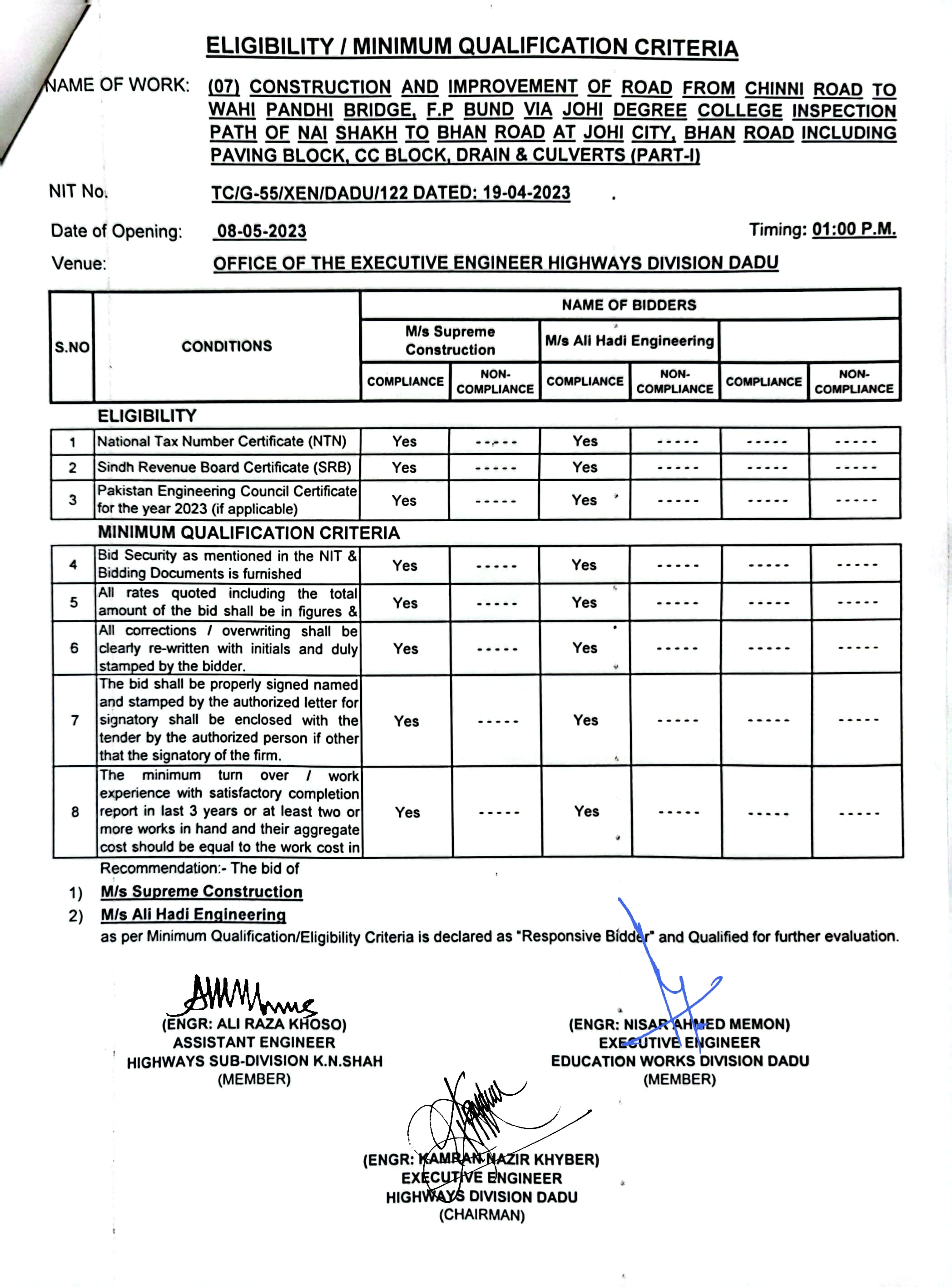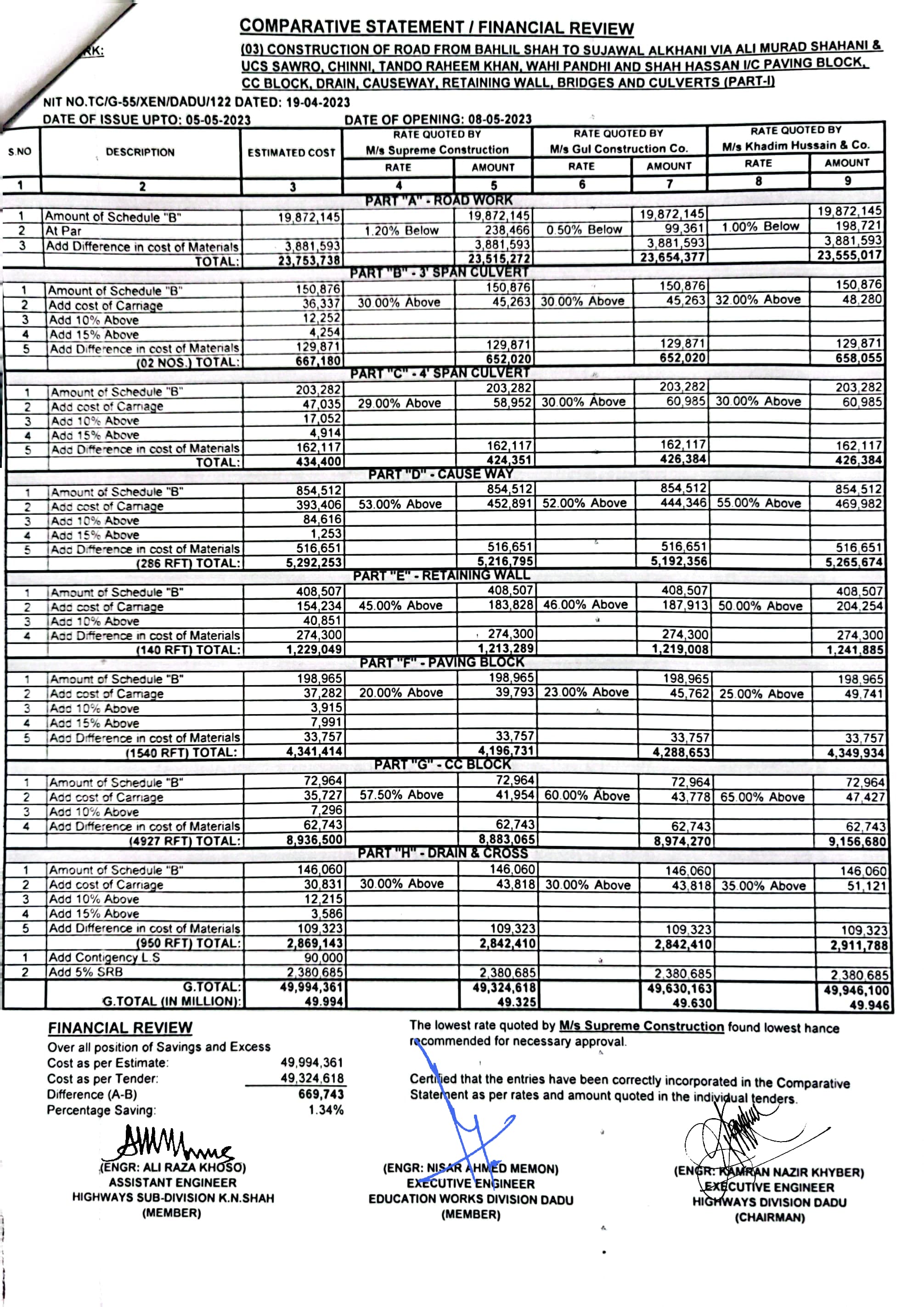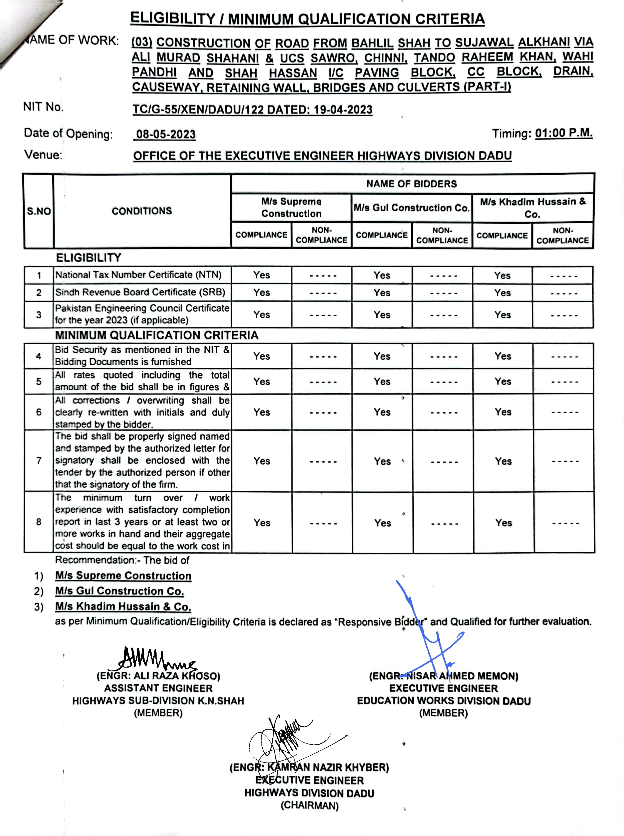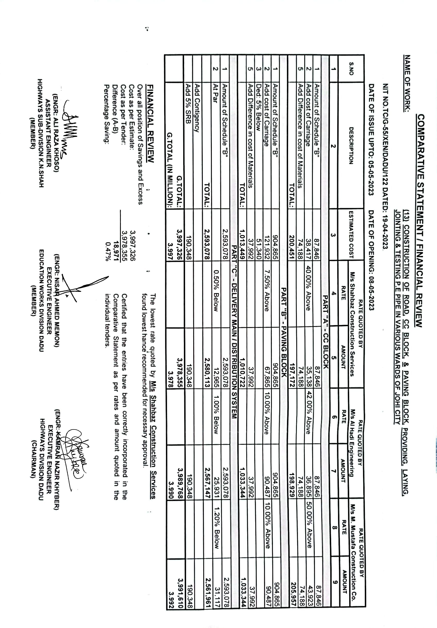 | T00537-22-0006 | BE00537-22-0006-4 | (04) CONSTRUCTION OF ROAD FROM BAHLIL SHAH TO SUJAWAL ALKHANI VIA ALI MURAD SHAHANI & UCS SAWRO, CHINNI, TANDO RAHEEM KHAN, WAHI PANDHI AND SHAH HASSAN I/C PAVING BLOCK, CC BLOCK, DRAIN, CAUSEWAY, RETAINING WALL, BRIDGES AND CULVERTS (PART-II) | Executive Engineer Highway Division Dadu (51-Works and Services Department) | 10-05-2023 | Dadu | Active |