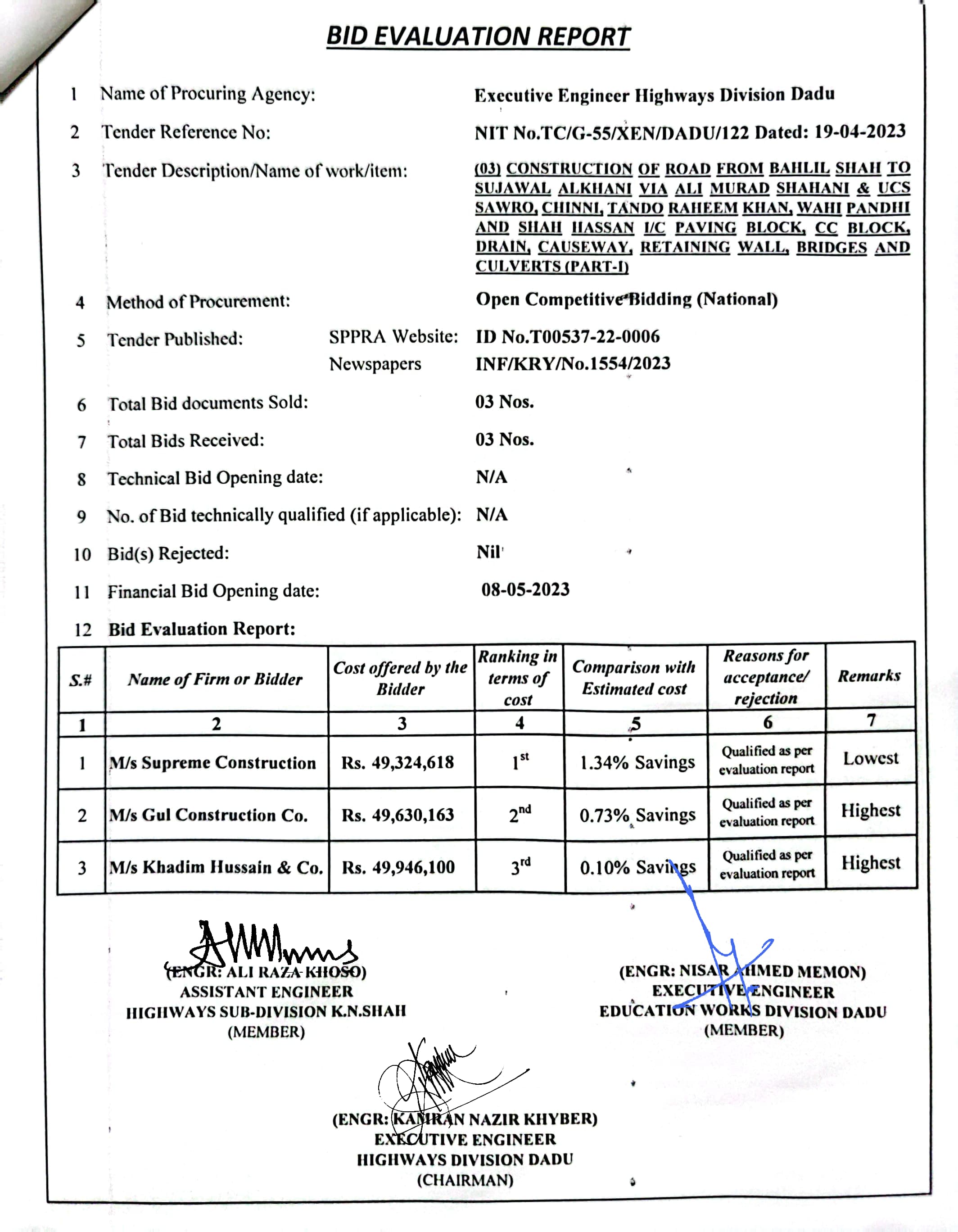 | T00537-22-0006 | BE00537-22-0006-3 | 3 CONSTRUCTION OF ROAD FROM BAHLIL SHAH TO SUJAWAL ALKHANI VIA ALI MURAD SHAHANI & UCS SAWRO, CHINNI, TANDO RAHEEM KHAN, WAHI PANDHI AND SHAH HASSAN I/C PAVING BLOCK, CC BLOCK, DRAIN, CAUSEWAY, RETAINING WALL, BRIDGES AND CULVERTS (PART-I) | Executive Engineer Highway Division Dadu (51-Works and Services Department) | 10-05-2023 | Dadu | Active |