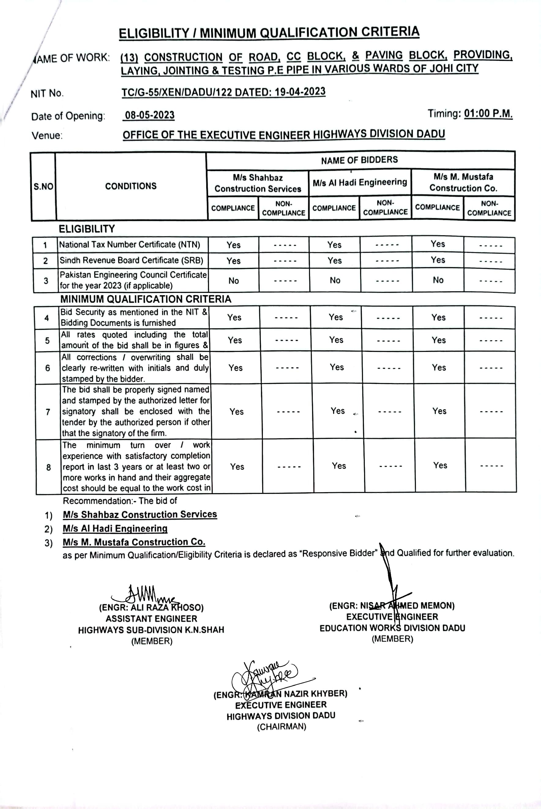 | T00537-22-0006 | BE00537-22-0006-13 | (13) CONSTRUCTION OF ROAD, CC BLOCK, & PAVING BLOCK, PROVIDING, LAYING, JOINTING & TESTING P.E PIPE IN VARIOUS WARDS OF JOHI CITY | Executive Engineer Highway Division Dadu (51-Works and Services Department) | 10-05-2023 | Dadu | Active |