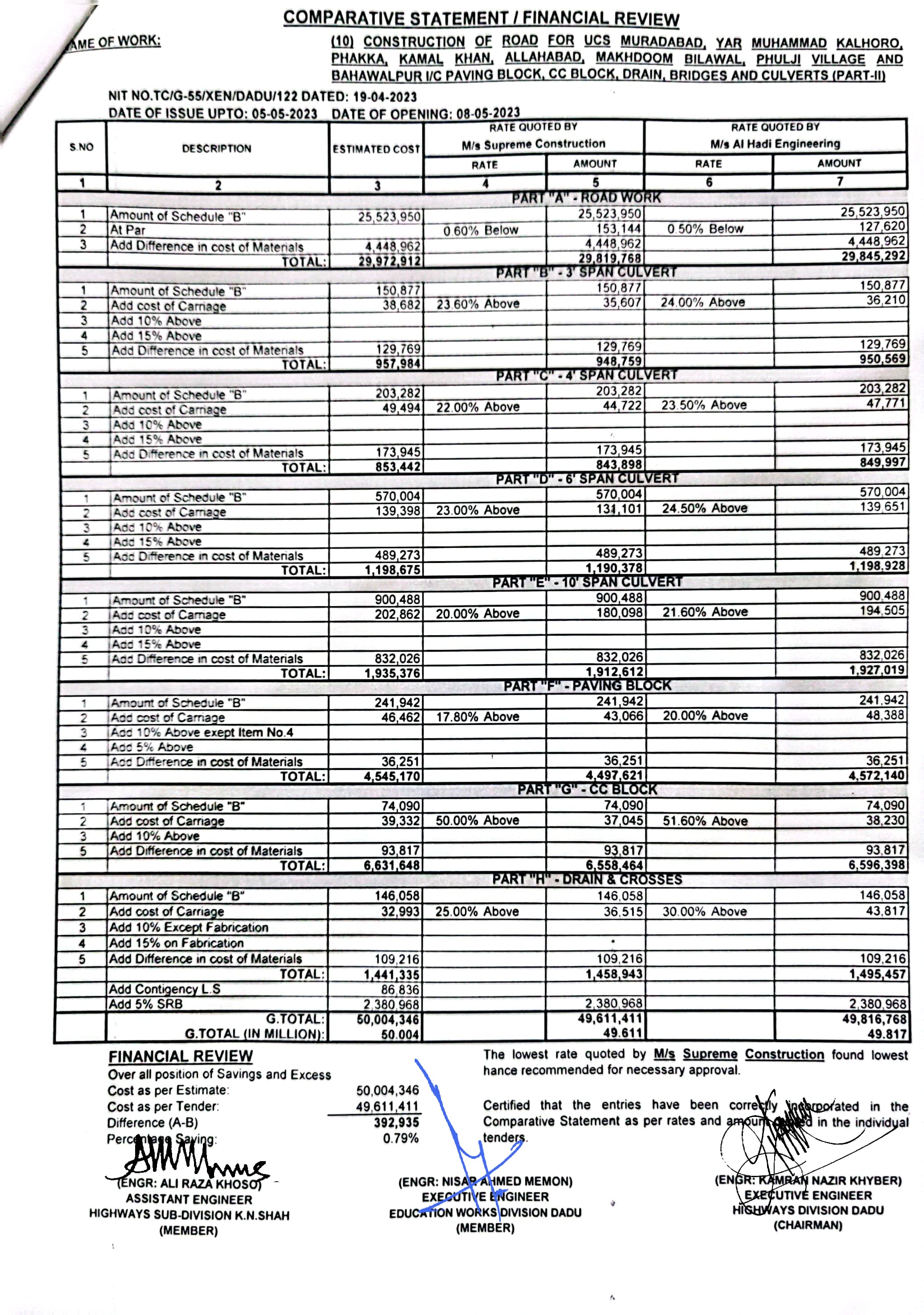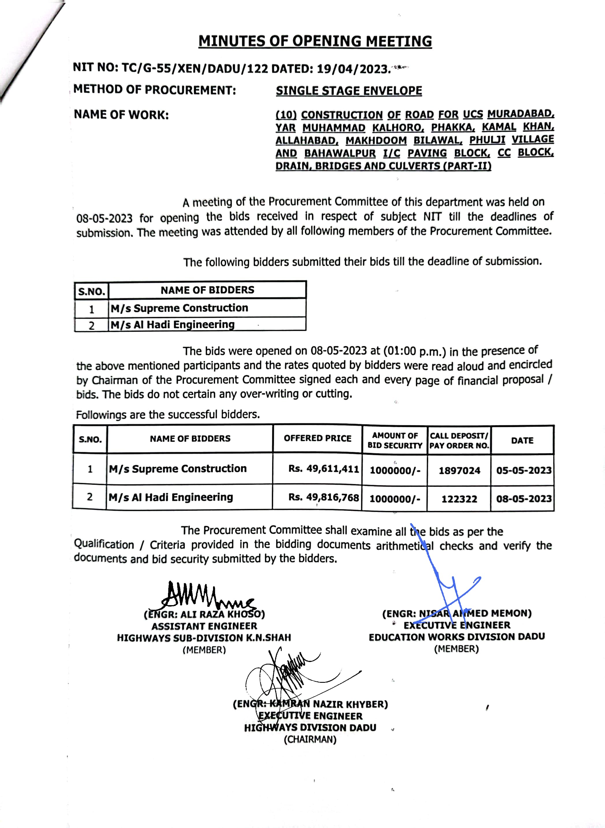 | T00537-22-0006 | BE00537-22-0006-10 | (10) CONSTRUCTION AND IMPROVEMENT OF ROAD FROM JOHI CITY BYPASS ROAD TO HUR CAMP INCLUDING U/C JOHI II, PAVING BLOCK, CC BLOCK, DRAIN, CULVERTS AND BRIDGES (PART-II) | Executive Engineer Highway Division Dadu (51-Works and Services Department) | 10-05-2023 | Dadu | Active |