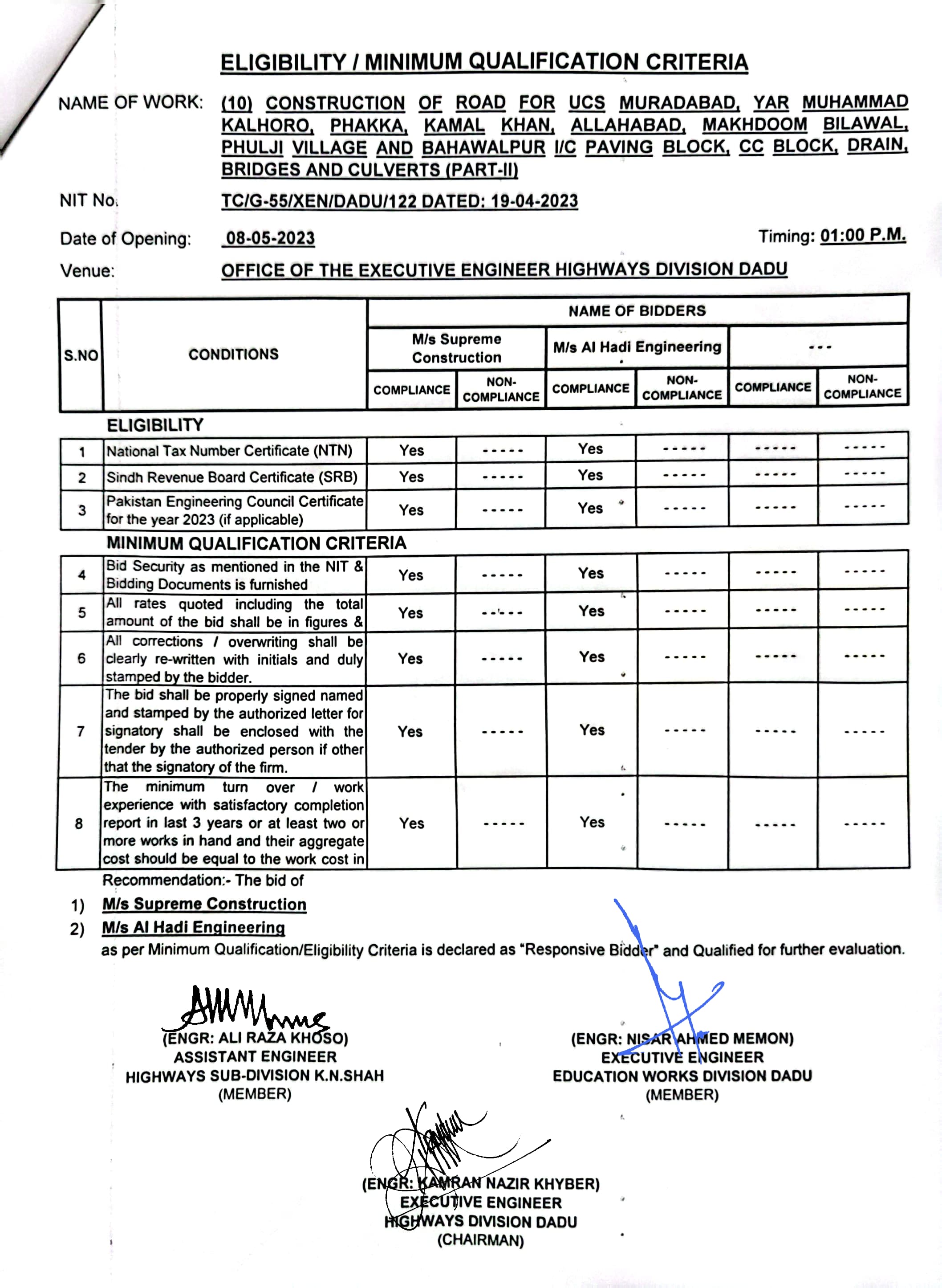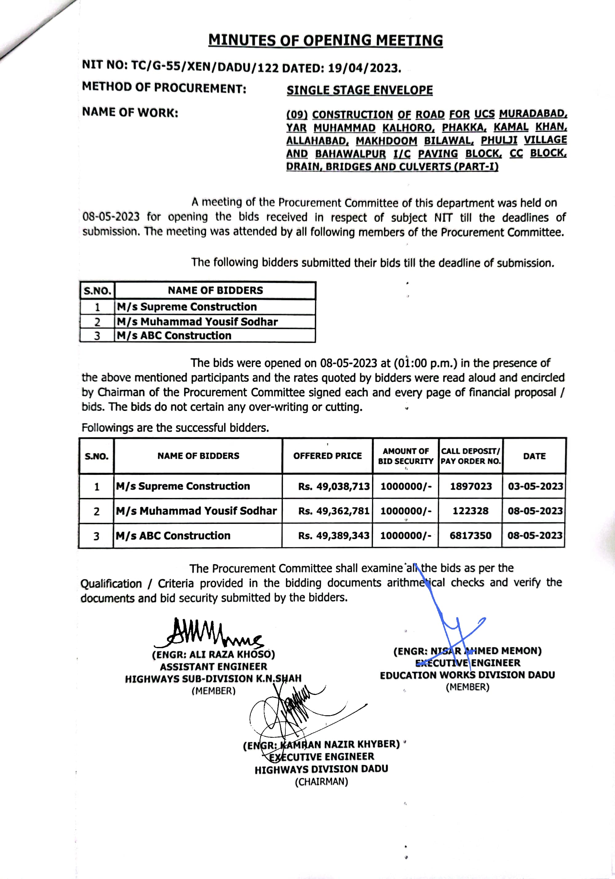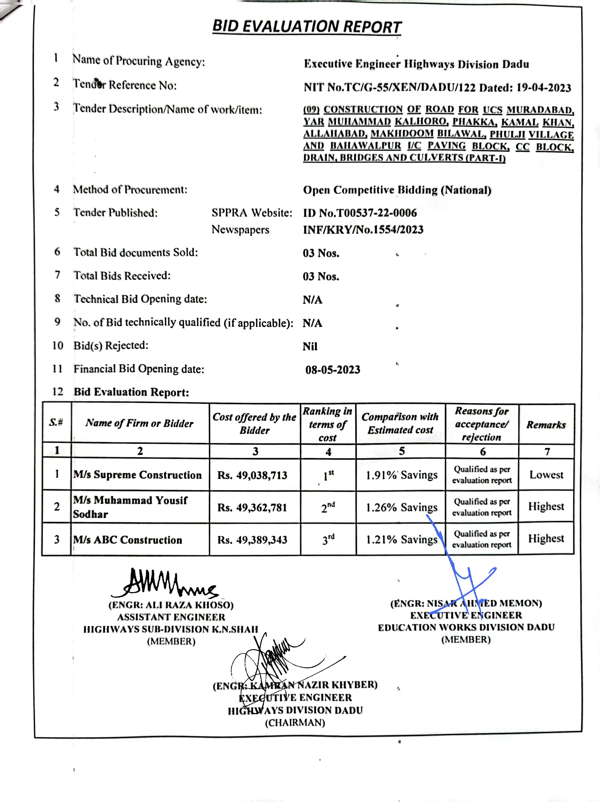 | T00537-22-0006 | BE00537-22-0006-9 | 9)CONSTRUCTION AND IMPROVEMENT OF ROAD FROM JOHI CITY BYPASS ROAD TO HUR CAMP INCLUDING U/C JOHI II, PAVING BLOCK, CC BLOCK, DRAIN, CULVERTS AND BRIDGES (PART-I) | Executive Engineer Highway Division Dadu (51-Works and Services Department) | 10-05-2023 | Dadu | Active |