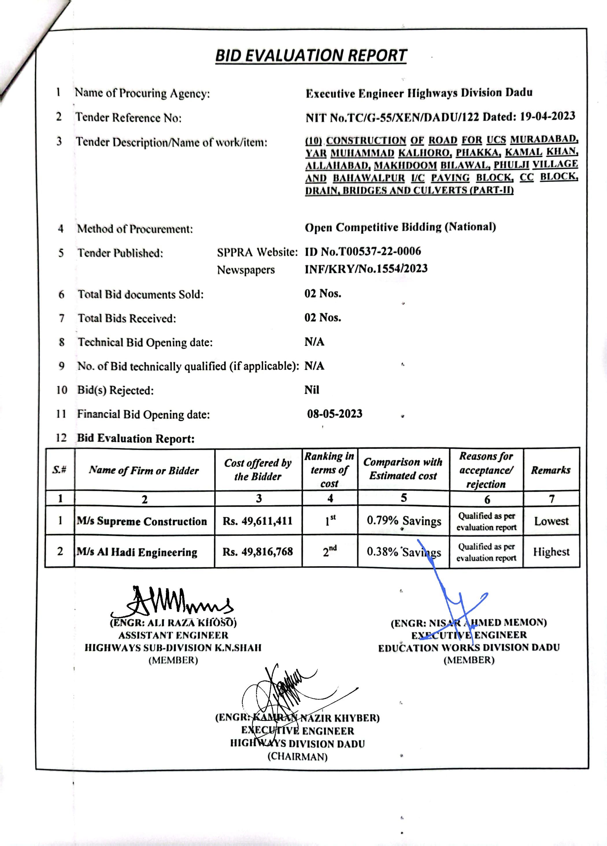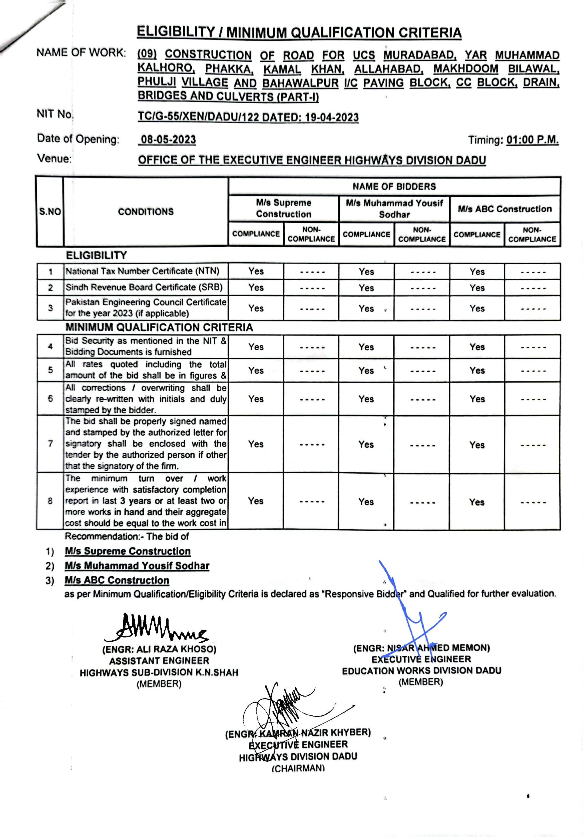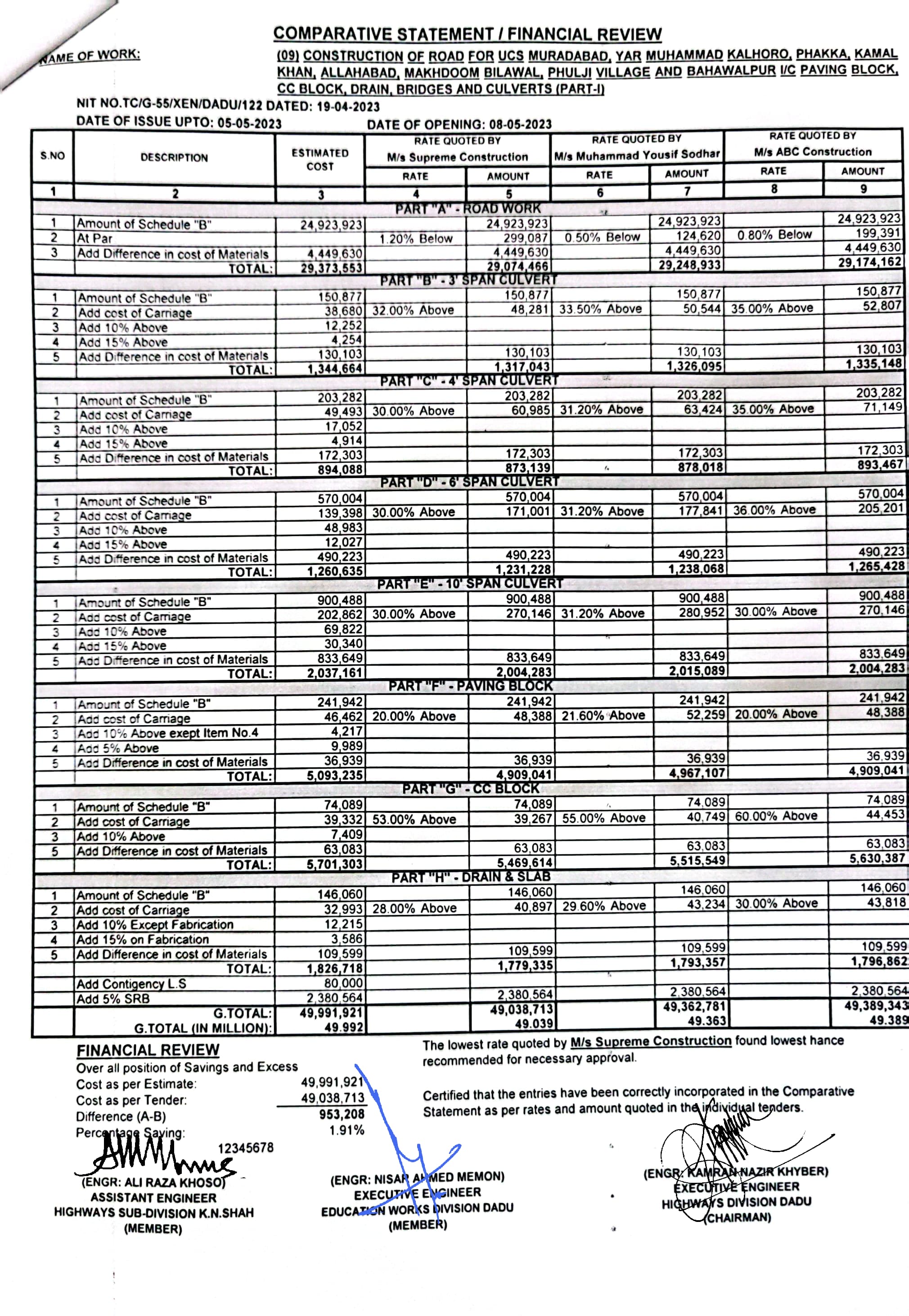 | T00537-22-0006 | BE00537-22-0006-9 | 9)CONSTRUCTION AND IMPROVEMENT OF ROAD FROM JOHI CITY BYPASS ROAD TO HUR CAMP INCLUDING U/C JOHI II, PAVING BLOCK, CC BLOCK, DRAIN, CULVERTS AND BRIDGES (PART-I) | Executive Engineer Highway Division Dadu (51-Works and Services Department) | 10-05-2023 | Dadu | Active |