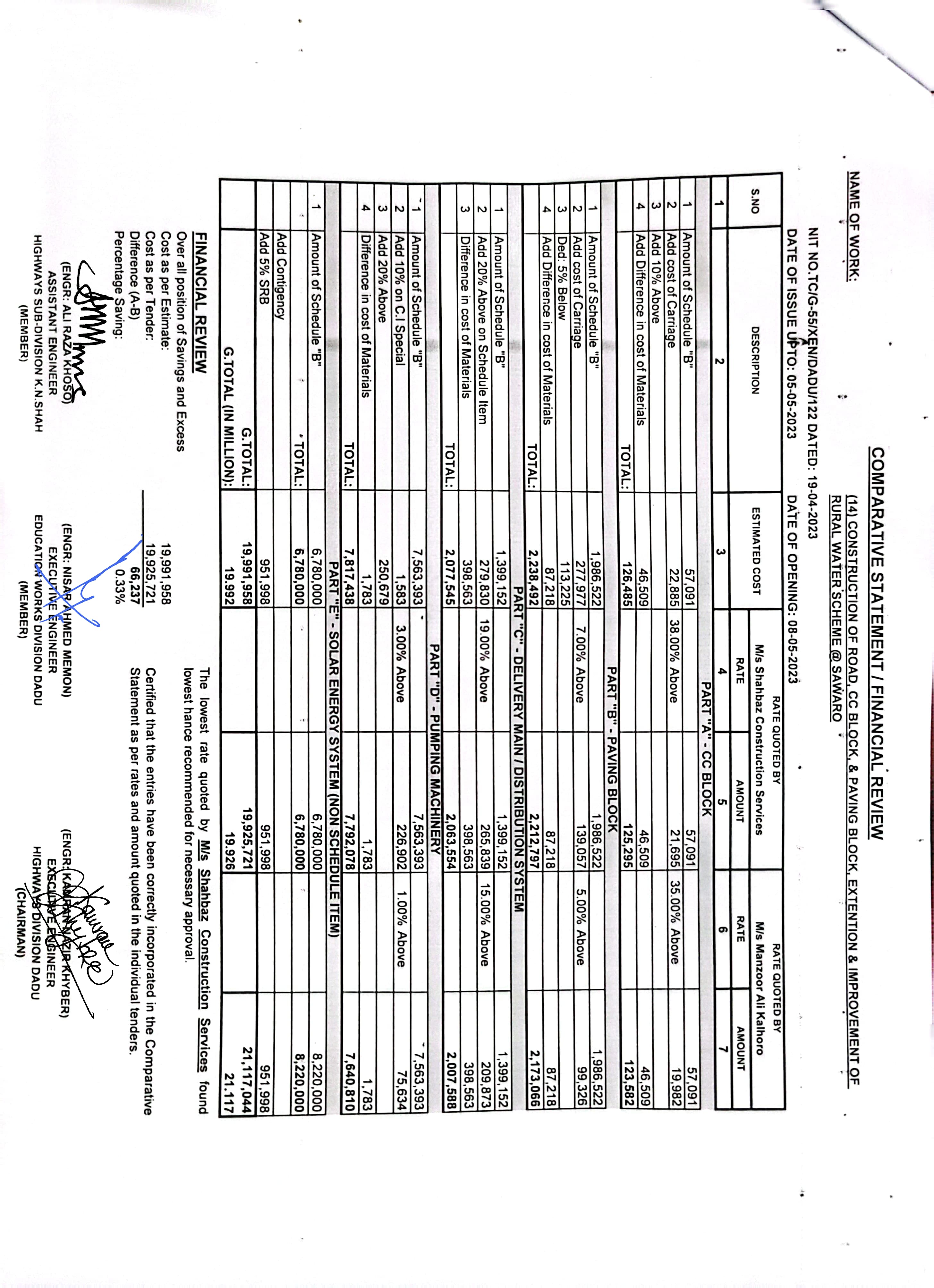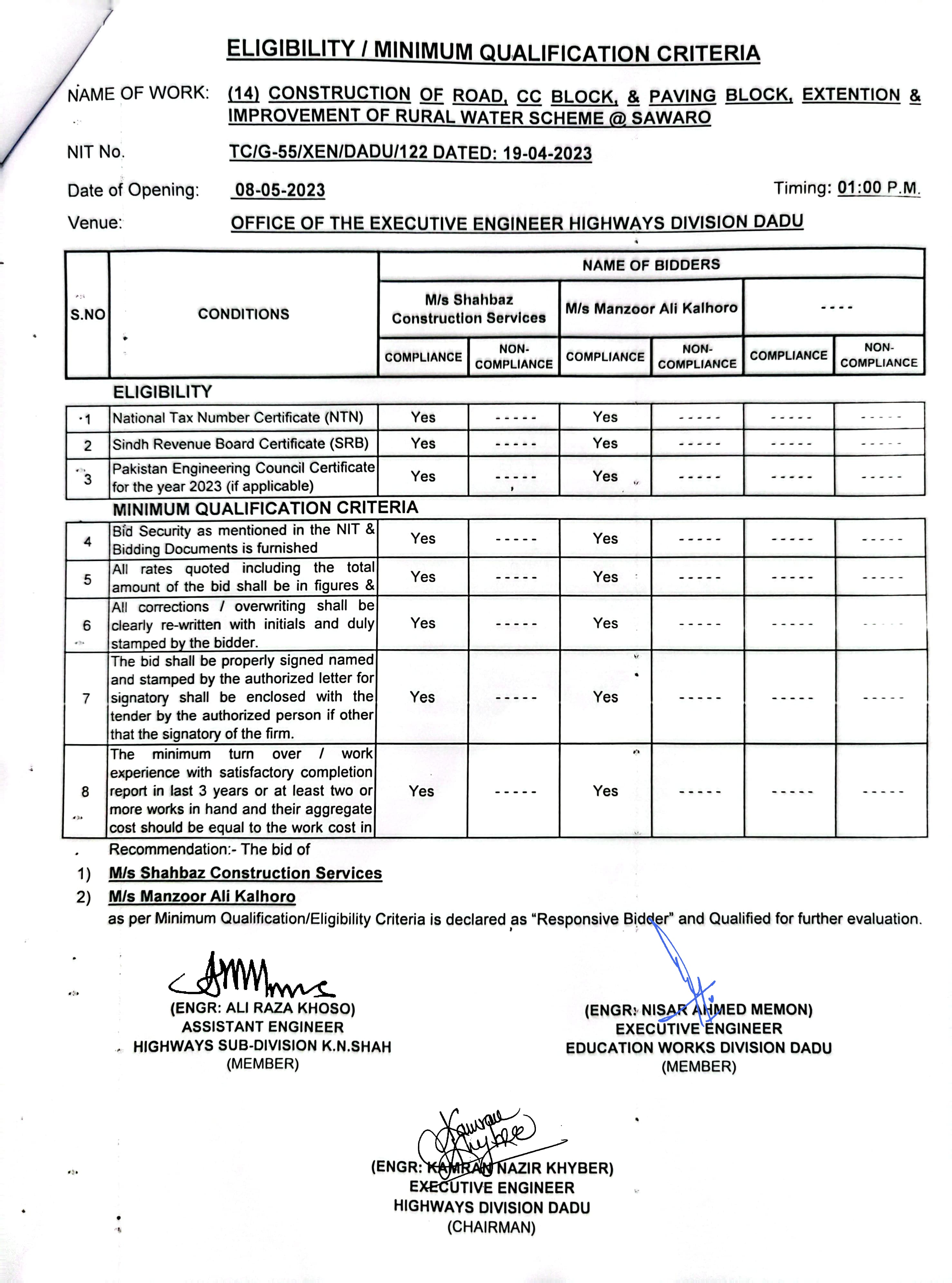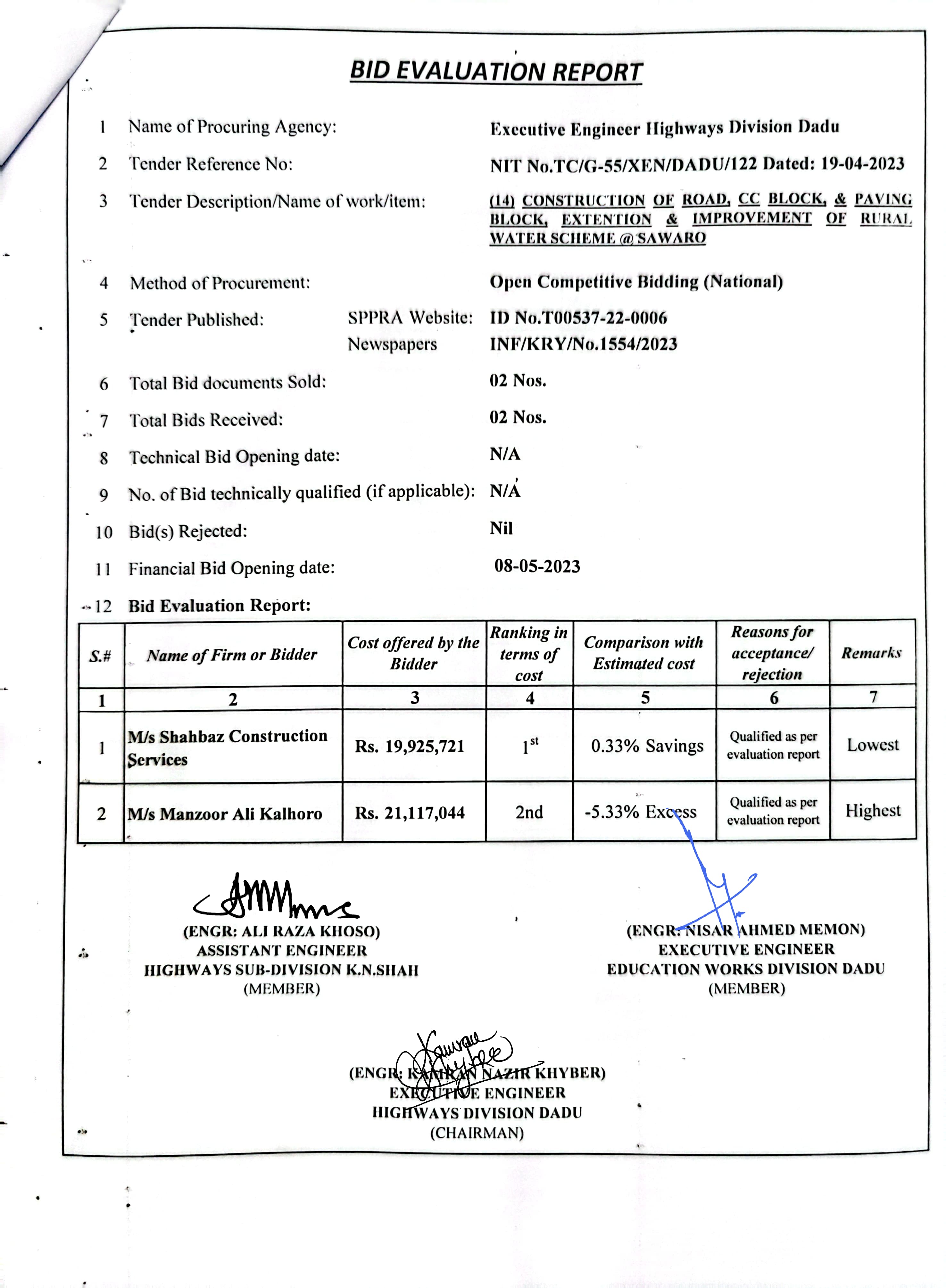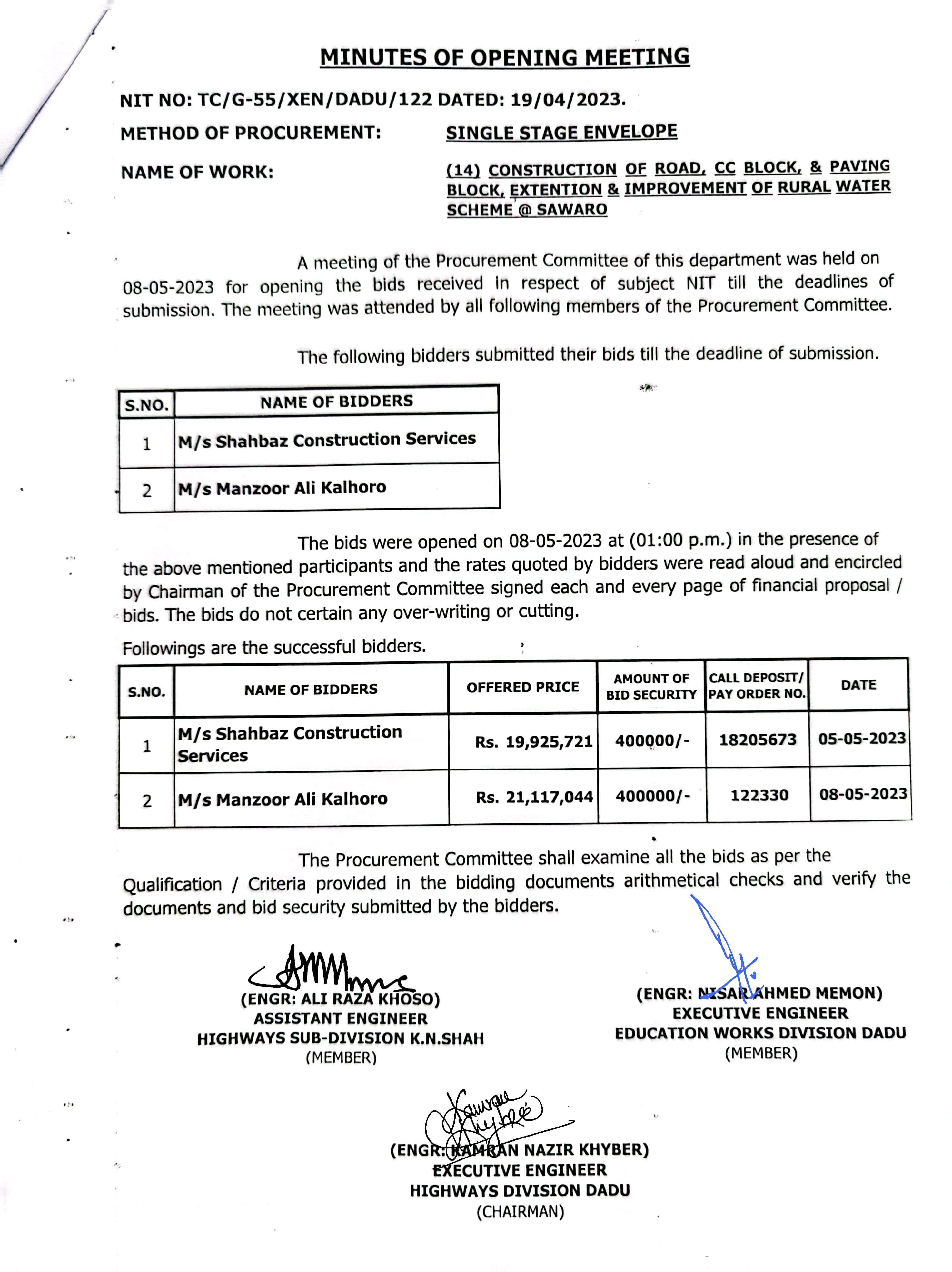 | T00537-22-0006 | BE00537-22-0006-14 | (14) CONSTRUCTION OF ROAD, CC BLOCK, & PAVING BLOCK, EXTENTION & IMPROVEMENT OF RURAL WATER SCHEME @ SAWARO | Executive Engineer Highway Division Dadu (51-Works and Services Department) | 10-05-2023 | Dadu | Active |