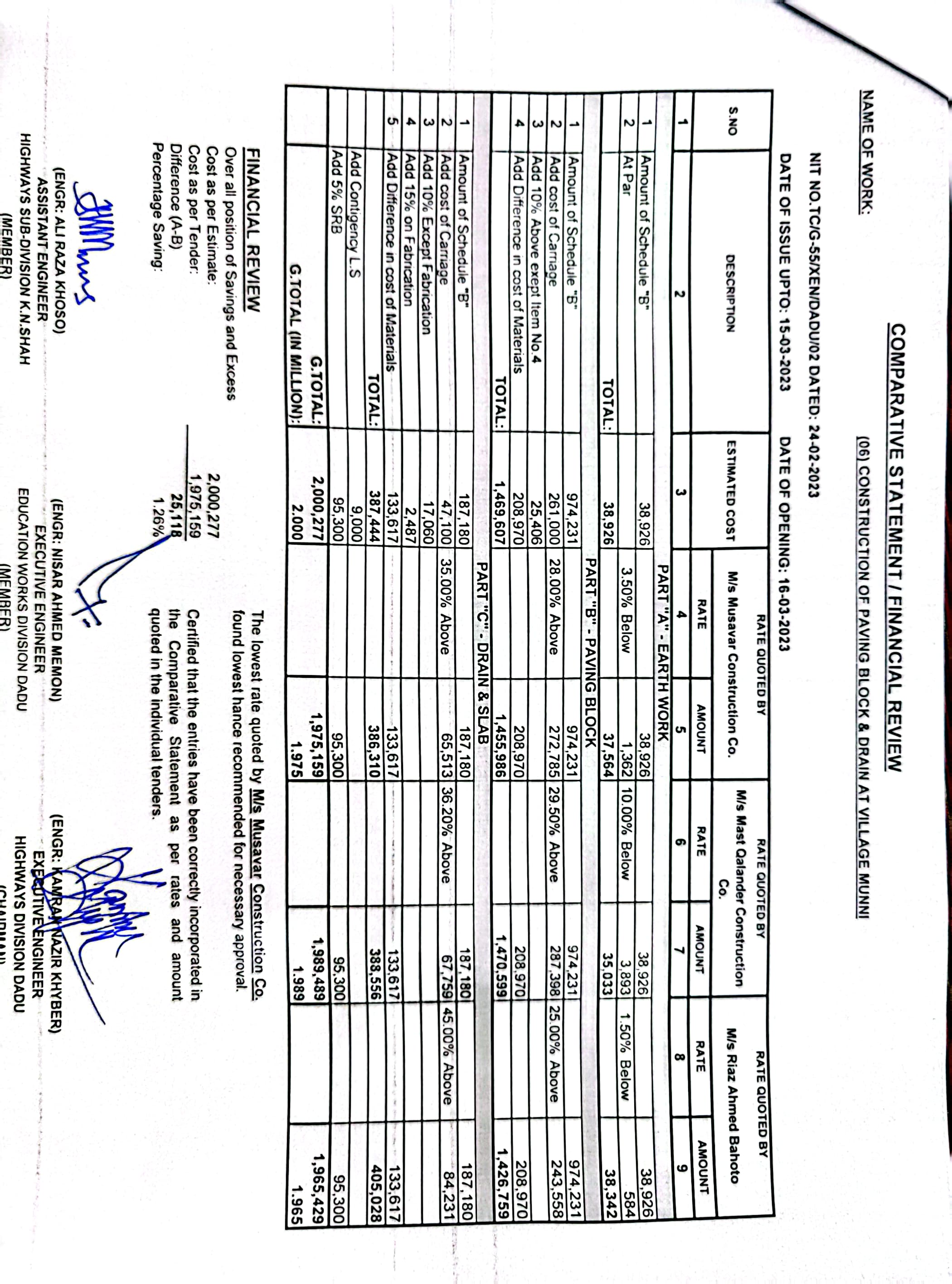 | T00537-22-0002 | BE00537-22-0006 | 6.Construction of Paving Block & Drain at village Munni | Executive Engineer Highway Division Dadu (51-Works and Services Department) | 20-03-2023 | Dadu | Active |