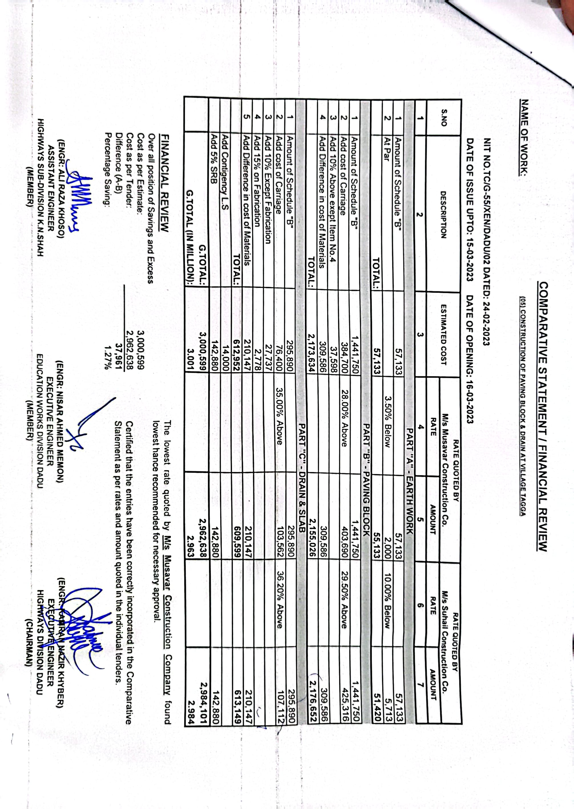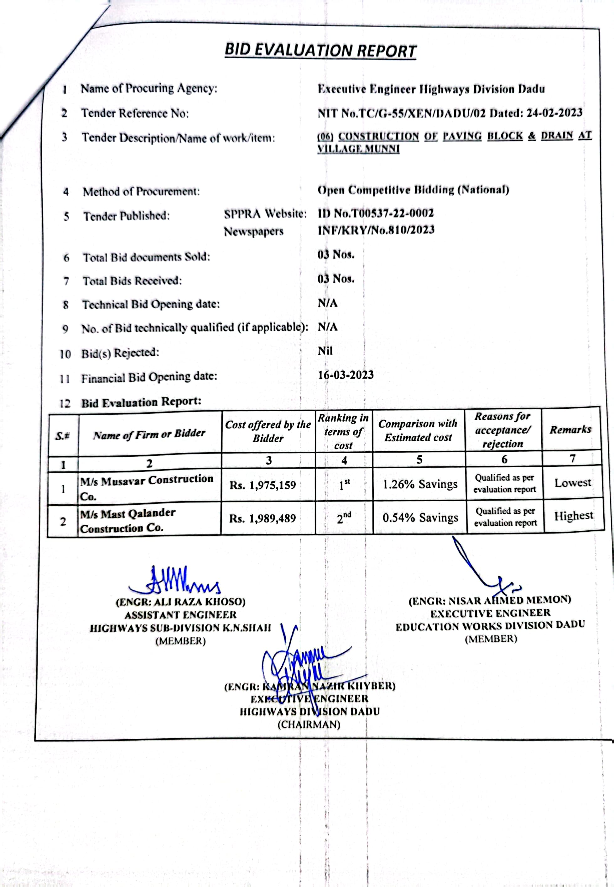 | T00537-22-0002 | BE00537-22-0005 | 5.Construction of Paving Block & Drain at village Tagga | Executive Engineer Highway Division Dadu (51-Works and Services Department) | 20-03-2023 | Dadu | Active |