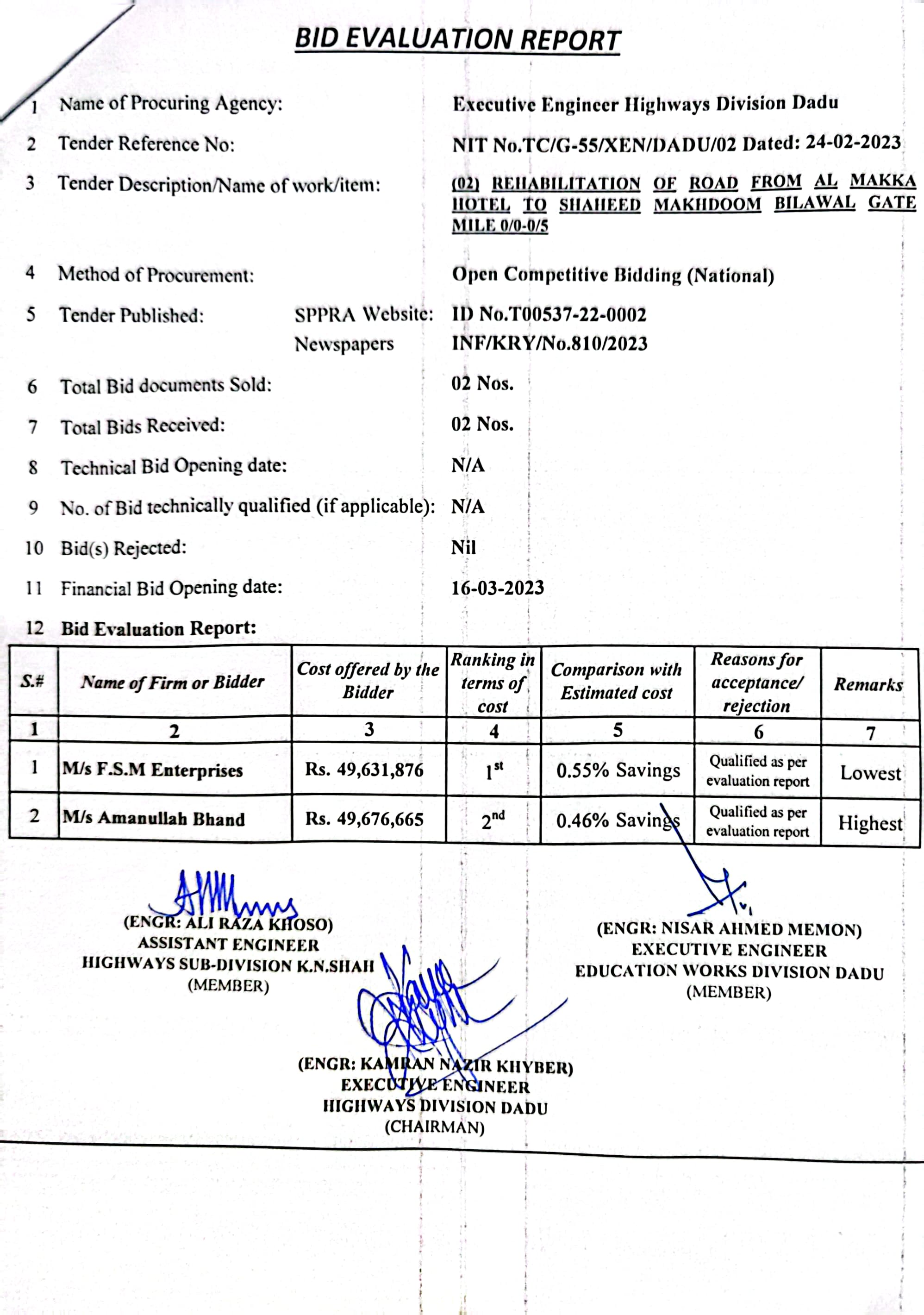 | T00537-22-0002 | BE00537-22-0003 | 3.Rehabilitation of road from Benazir Hotel to Al Makka Hotel to Shaheed Zulfiqar Ali Bhutto Gate i/c link to Daud Chowk mile 0/0-1/6 (in portions) | Executive Engineer Highway Division Dadu (51-Works and Services Department) | 20-03-2023 | Dadu | Active |