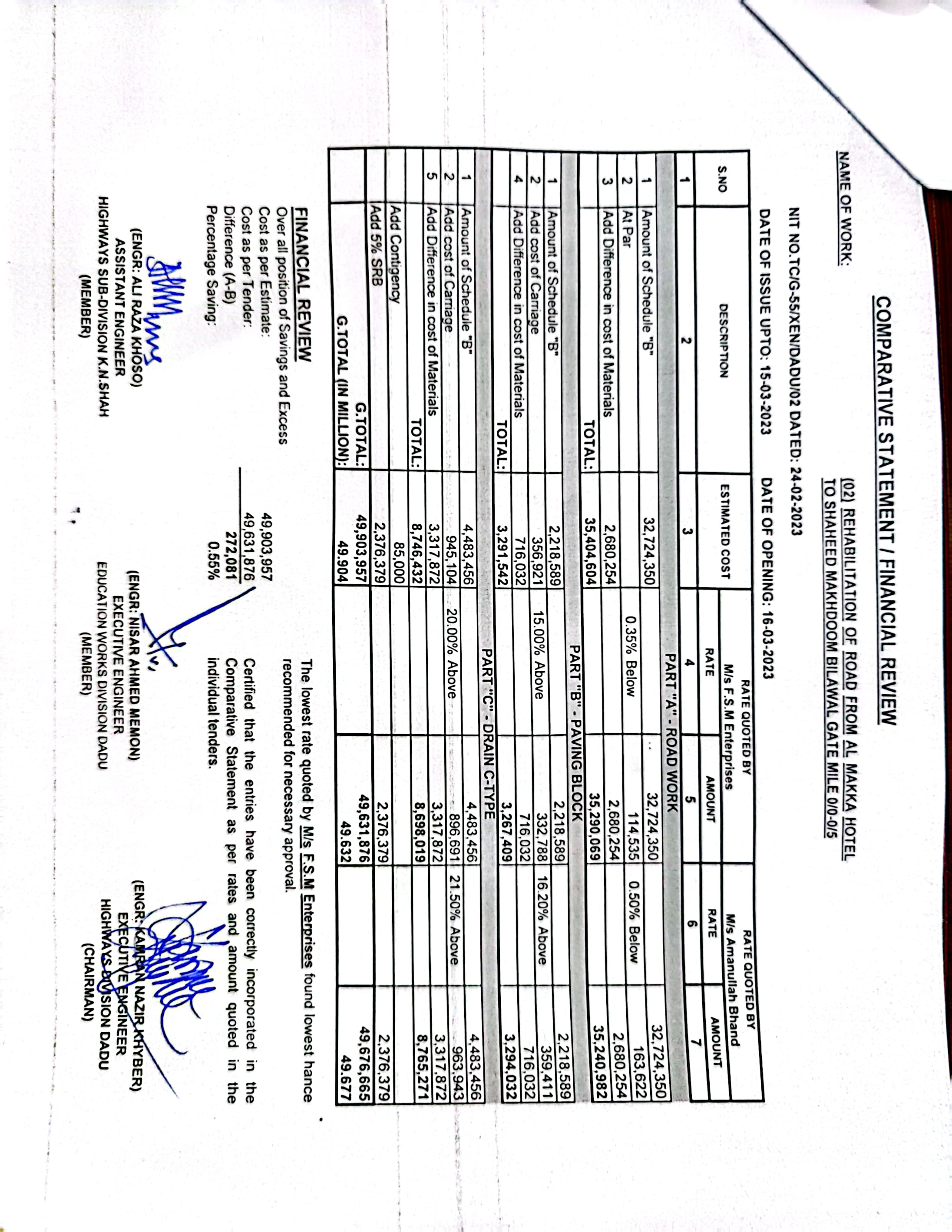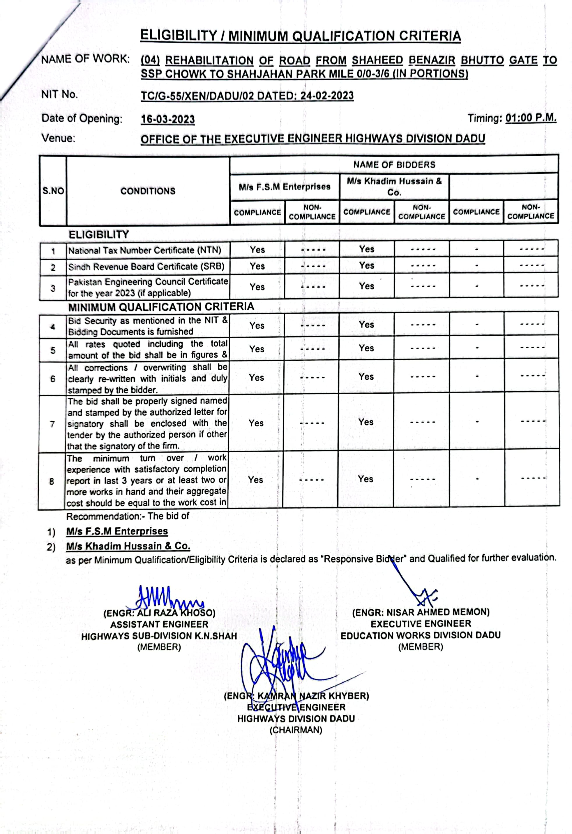 | T00537-22-0002 | BE00537-22-0004 | 4.Rehabilitation of road from Shaheed Benazir Bhutto Gate to SSP Chowk to Shahjahan Park mile 0/0-3/6 (in portions) | Executive Engineer Highway Division Dadu (51-Works and Services Department) | 20-03-2023 | Dadu | Active |