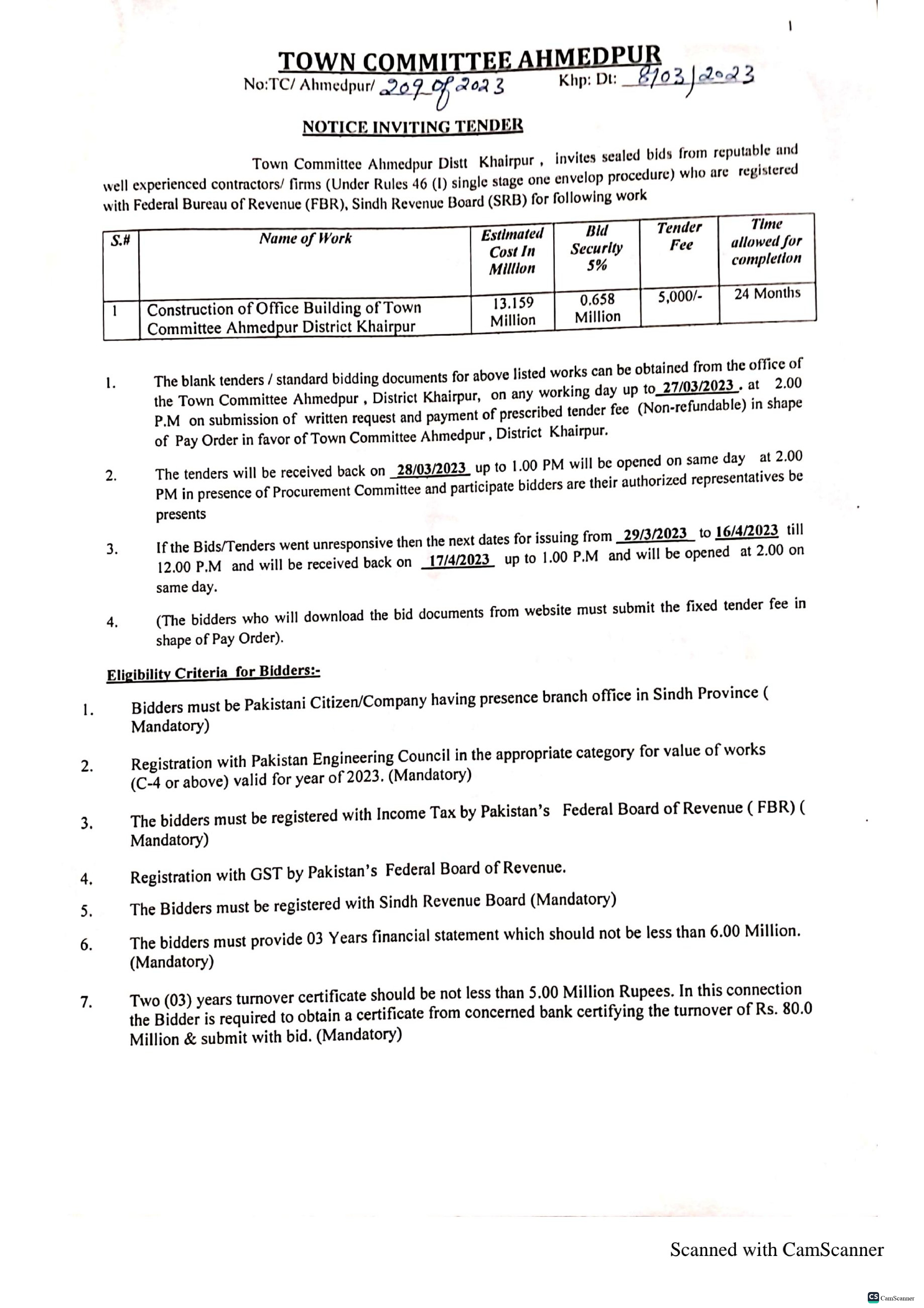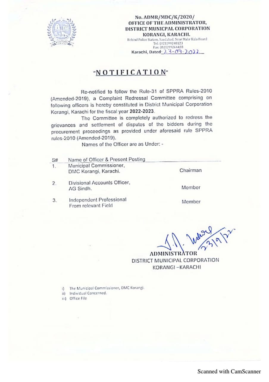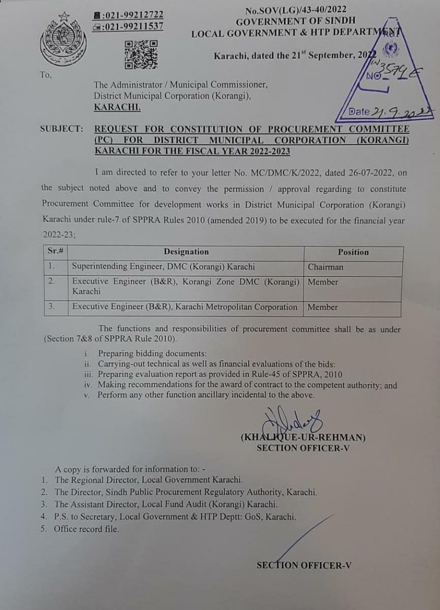 S.E/B&R/DMC/K/064/2021-22 Karachi Dated: 02-11-2022