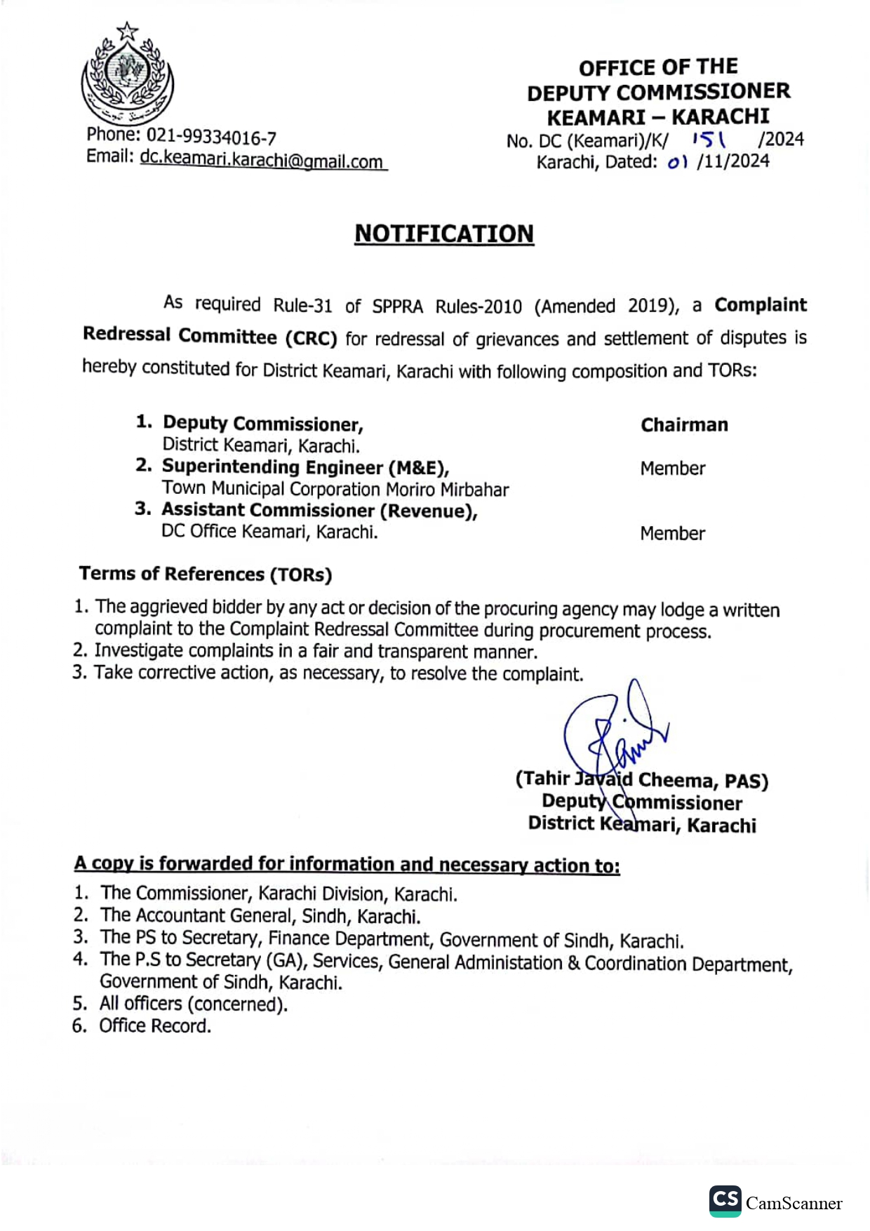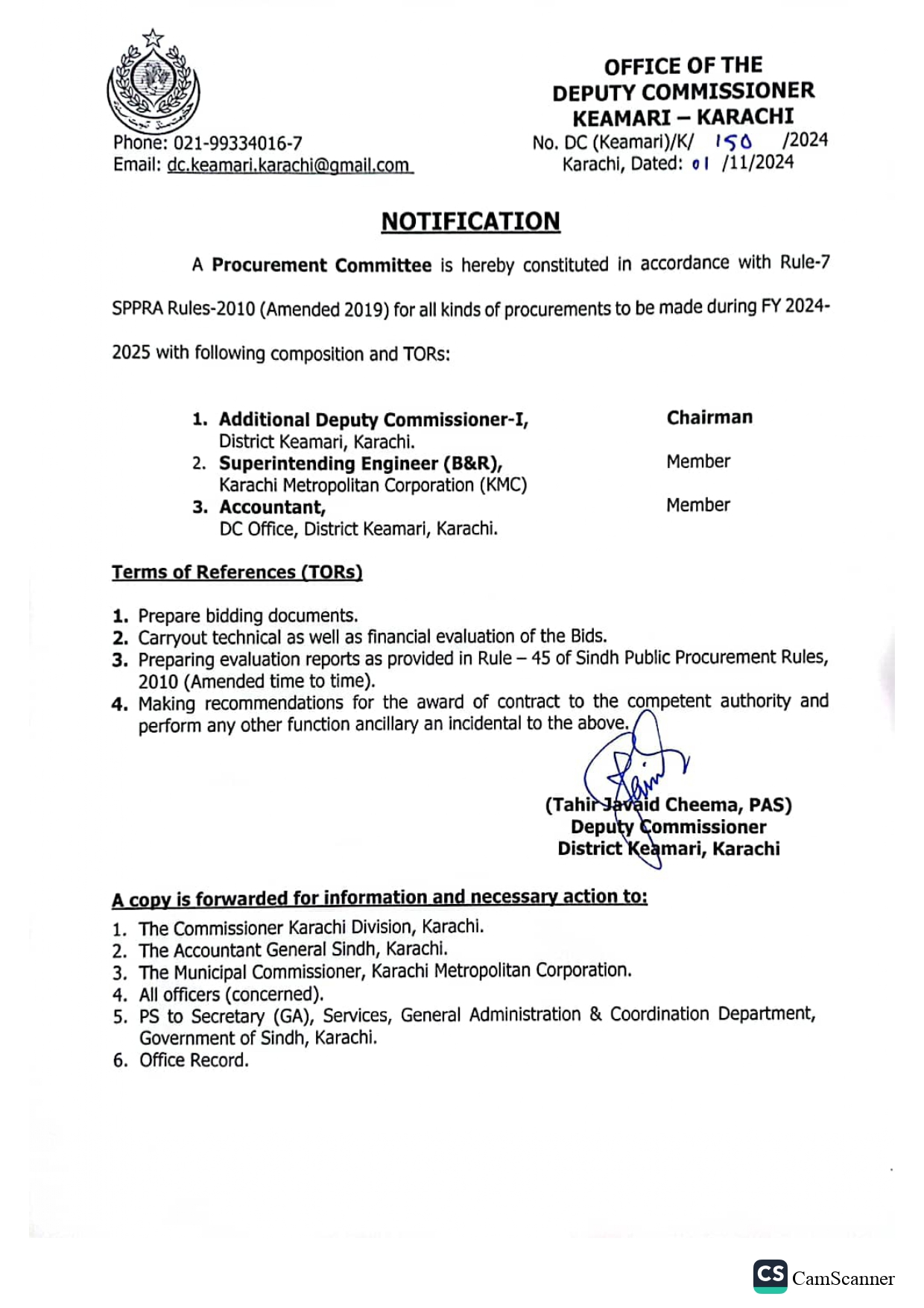 No. DC(Keamari)/K/ 63 /2024Karachi, Dated 05/12/24